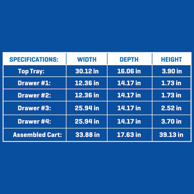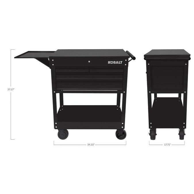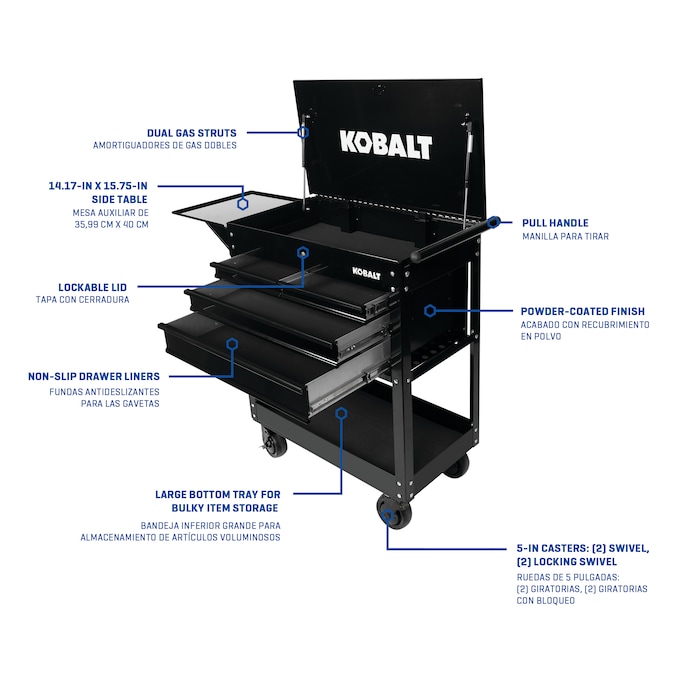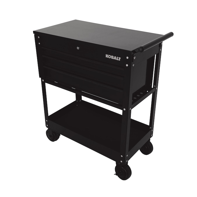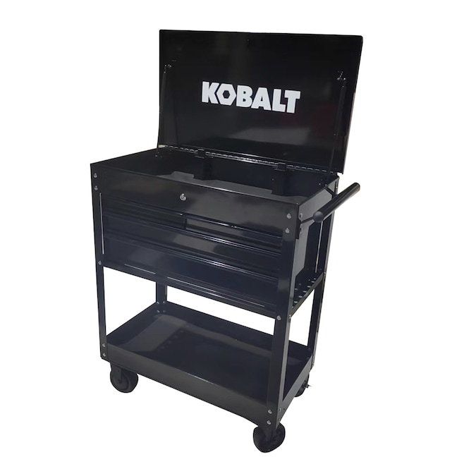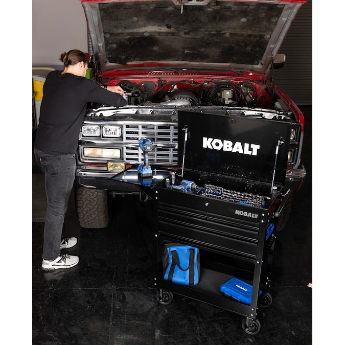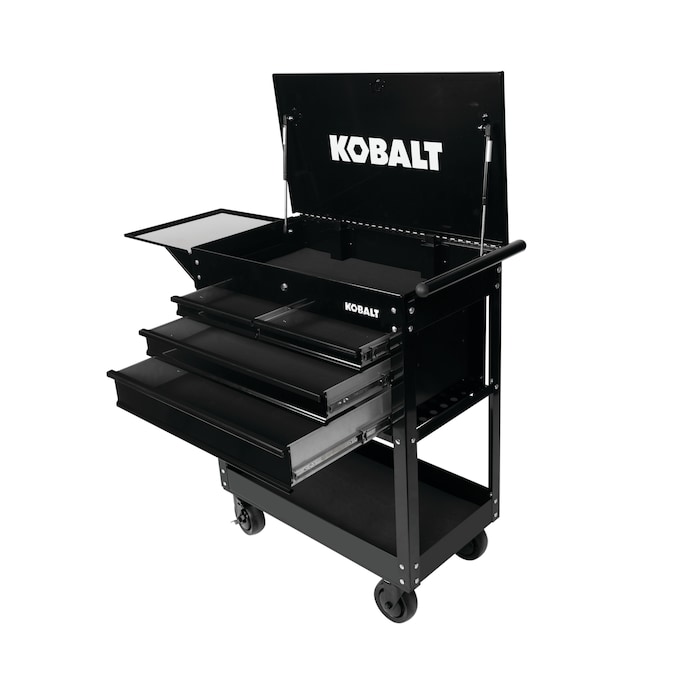 - Kobalt’s rolling mechanic’s tool cart features four drawers with fully extendable, ball-bearing drawer slides to allow easy access to everything in each drawer, a large bottom tray for bulky items and a top compartment that provide a total of 12,600 cu in (7.3 cu ft) for tool and equipment storage