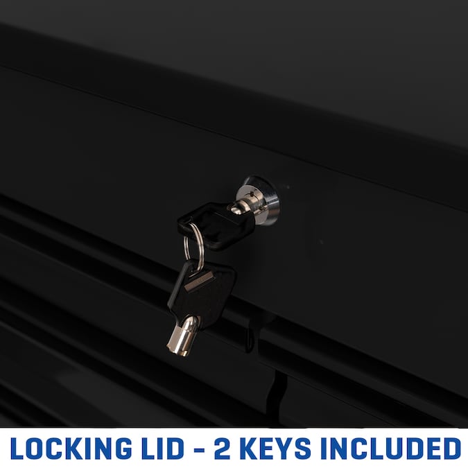 - Locking lid is supported by two struts which fully extend and when closed, secures top compartment and all 4 drawers – two keys are included