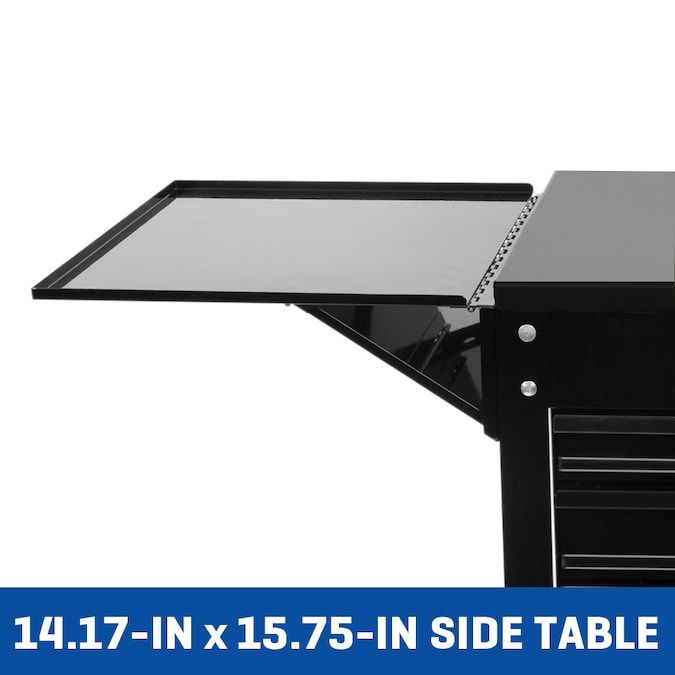 Store and move your favorite tools and other supplies and equipment with this convenient rolling tool cart. Designed to provide maximum storage while taking up minimal space, this cart features four (4) locking drawers and top compartment, as well as a large bottom tray, giving you a total of 12,600 cubic inches (7.3 cubic feet) for storage. The cart’s maximum weight capacity is 550 pounds (249kg), allowing you to store frequently needed tools, supplies and parts. Each drawer features a non-slip liner to keep tools in place and added protection while moving the cart. The closing lid can be secured shut with the built-in lock to protect tools when not in use and make the cart lid usable as a workspace. If more space is needed, a fold-out side table can be extended giving an additional 14.17W x 15.75D work area. The four (4) 5-inch diameter caster wheels include 2 lockable and 2 swivel wheels, allowing for superb maneuverability that can be secured in a specific place. The durable powder-coated finish resists rust, corrosion, and chipping.