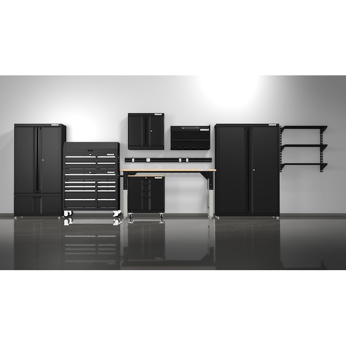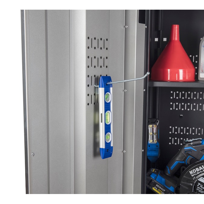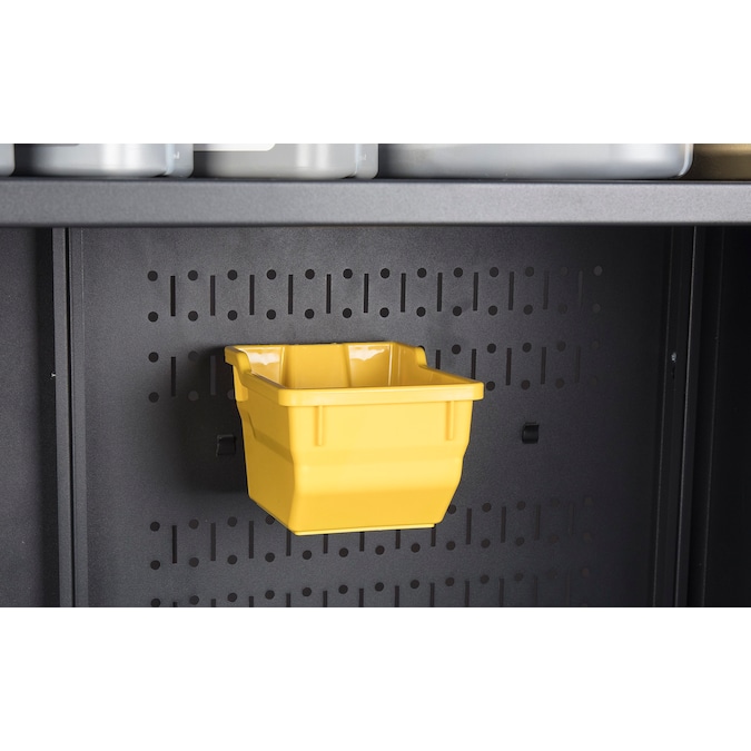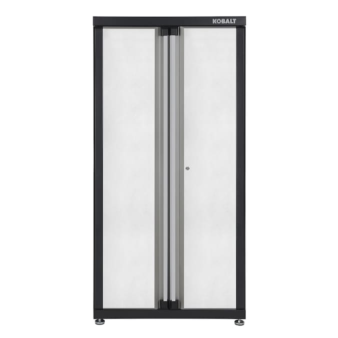 With heavy-duty construction and a powder-coated finish, this cabinet offers a durable storage solution for your garage. The 2-door, 36in tall cabinet is engineered for quick assembly and includes 4 shelves; 3 of these are adjustable. Each shelf has a weight capacity of 150lbs. pegboard on the back wall and the both doors give you unbeatable storage space for pegs and bins. The doors are lockable for peace-of-mind security. The back panel features 2 grommets for cord accessibility. Uneven floor? No problem…the adjustable feet can compensate. Complete your garage suite with other pieces like the work table, small base cabinet, or a wall cabinet (each sold separately). Dimensions are 72-inches H, 36-inches W, and 18.5-inches D.