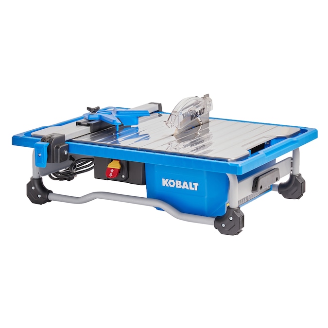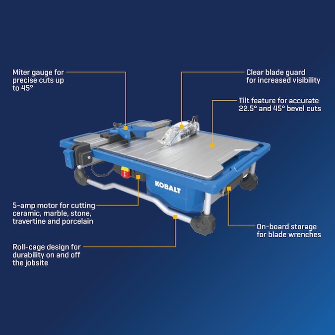 Kobalt introduces the 7in tabletop tile saw that delivers a max 24-in rip capacity and a 13in diagonal cut. The portable compact saw allows users to easily set up while the roll cage designs ensures stability and durability. The tile saw has a 1-1/4-in depth of cut that cuts through ceramic, porcelain and stone tiles. The tilting bevel table allows for accurate 22.5 and 45 degree bevel cuts. This saw is perfect for the DIY’er or the professional on the jobsite.