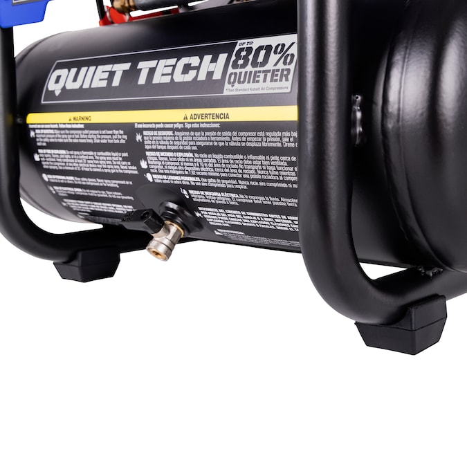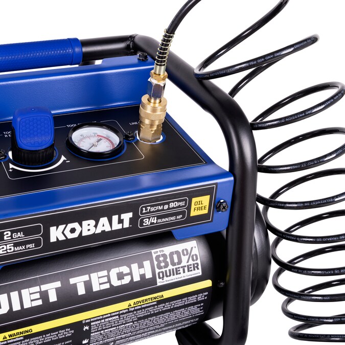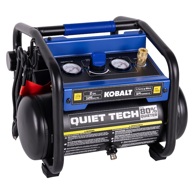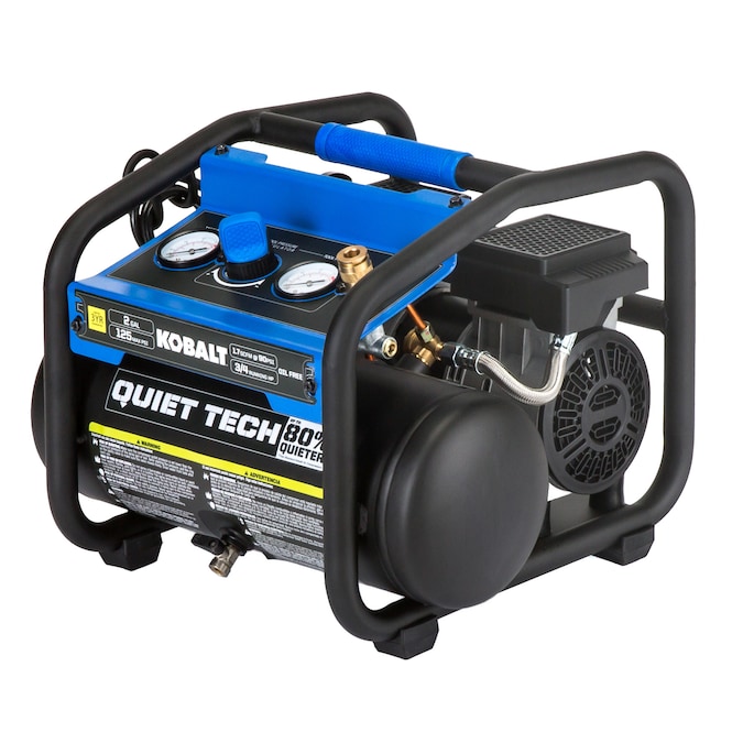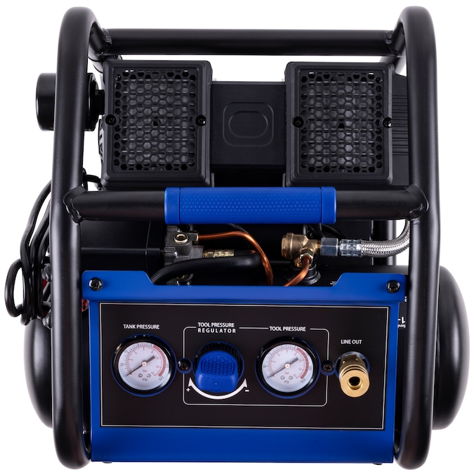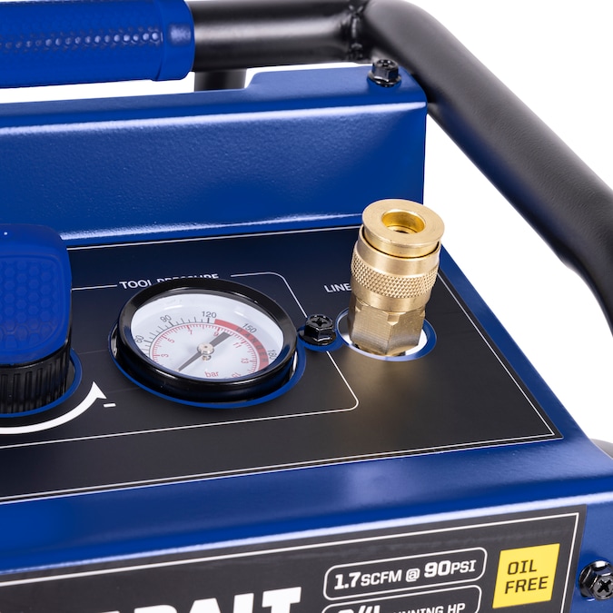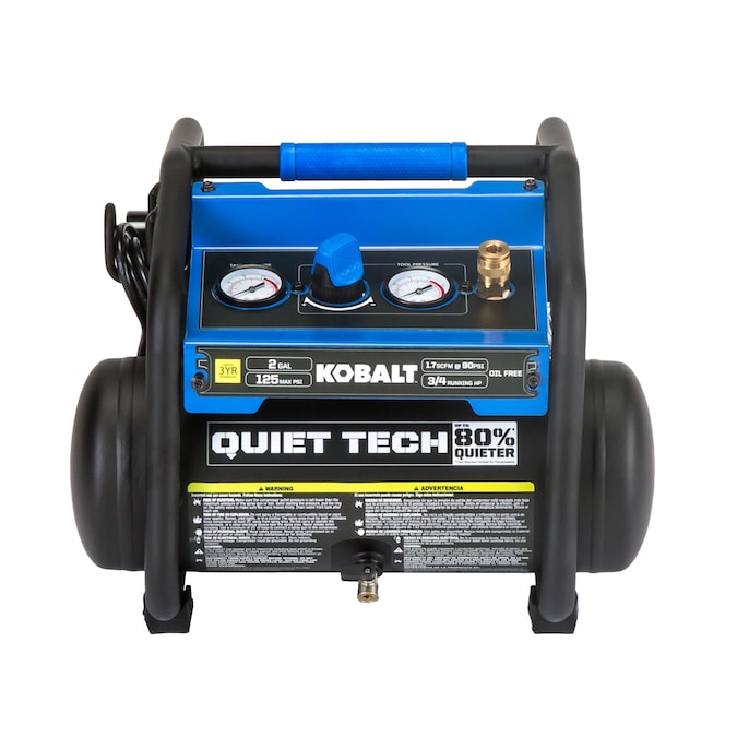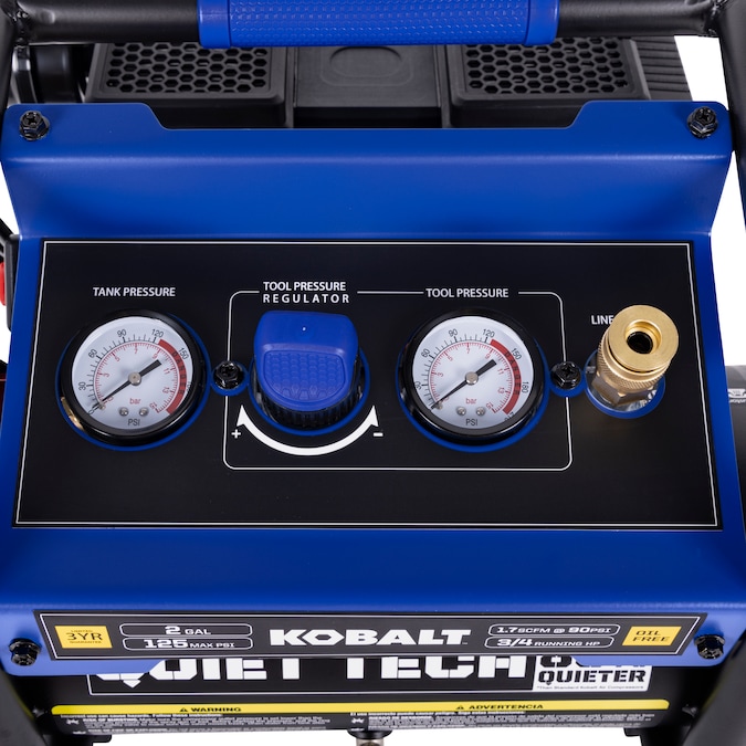 This 2gal air compressor equipped with 0.75hp 4-pole induction motor and dual oil less pumps provides air flow of 1.7cfm at 90psi with 125 max psi, ultra quiet operation and at least two times longer than standard compressor, durable with control panel as protection and low profile design, make it perfect for inflation, trim, finish jobs.