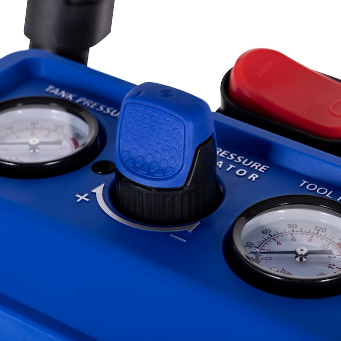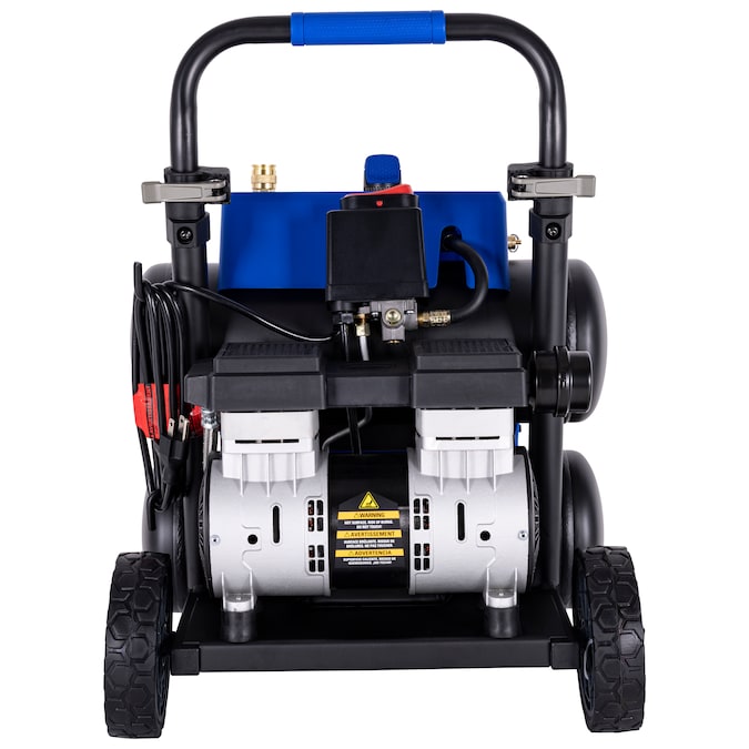 This 4.3gal air compressor equipped with 1hp 4-pole induction motor and dual oil less pumps provides air flow of 2.4 cfm at 90psi with 150 max psi, ultra quiet operation and at least two times longer than standard compressor, adjustable handle and wheels for easy move and storage, perfect for trim, finish jobs.