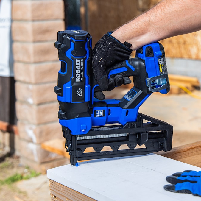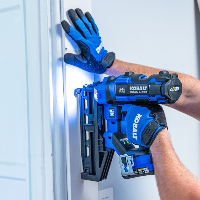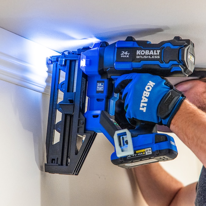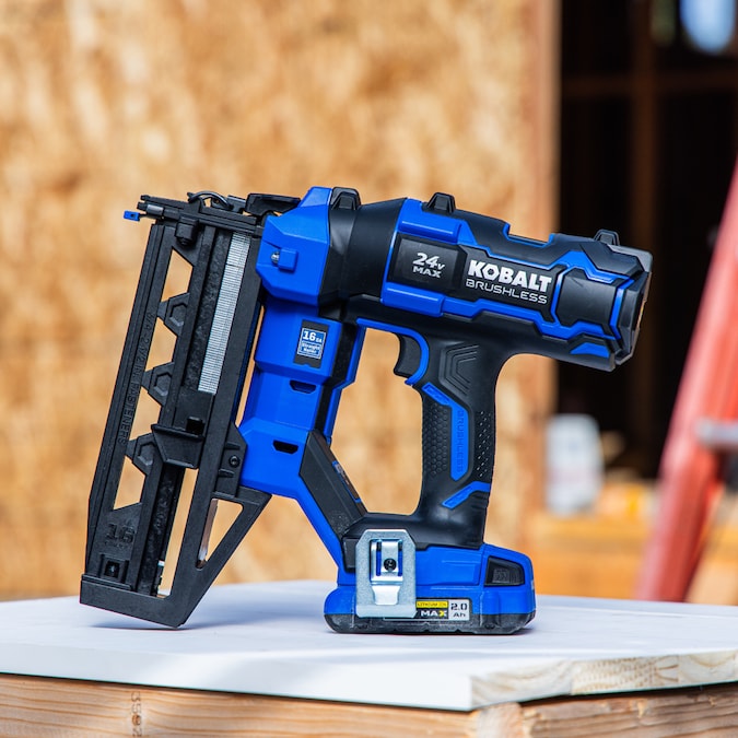 The Kobalt XTR 16-Ga Straight Finish Nailer is the perfect tool for most applications such as residential trim work, cabinetry, furniture, and similar finishing applications. This tool is equipped with a pre-charged internal gas chamber to drive a piston which gives the user a similar feel to traditional pneumatic nail gun performance while eliminating the pain point of dragging an air compressor and hose around the jobsite. The XTR nailer delivers repeatable depth of drive due to the nearly instant reload technology, so the user does not experience improperly sunk nails due to low air compressor lag. The pre-charged gas system provides instant nail delivery after the trigger is pulled. The 16-Ga nailer is equipped with an electronic control panel that allows the user to easily turn the tool ON with the touch of the power button and offers both sequential or contact actuation (bump) mode using the control panel. This cordless nailer delivers on all the features you would expect from a premium performance nailer including the ability to accept 3/4-in to 2-1/2-in long straight finish nails, 110 nail magazine capacity, tool-free drive depth adjustment, dry-fire lockout, tool-free jam clearing mechanism, magazine site window, dual LED worklights and no-mar pads to protect the workpiece. All part of the 85+ Kobalt 24V Max family of tools.