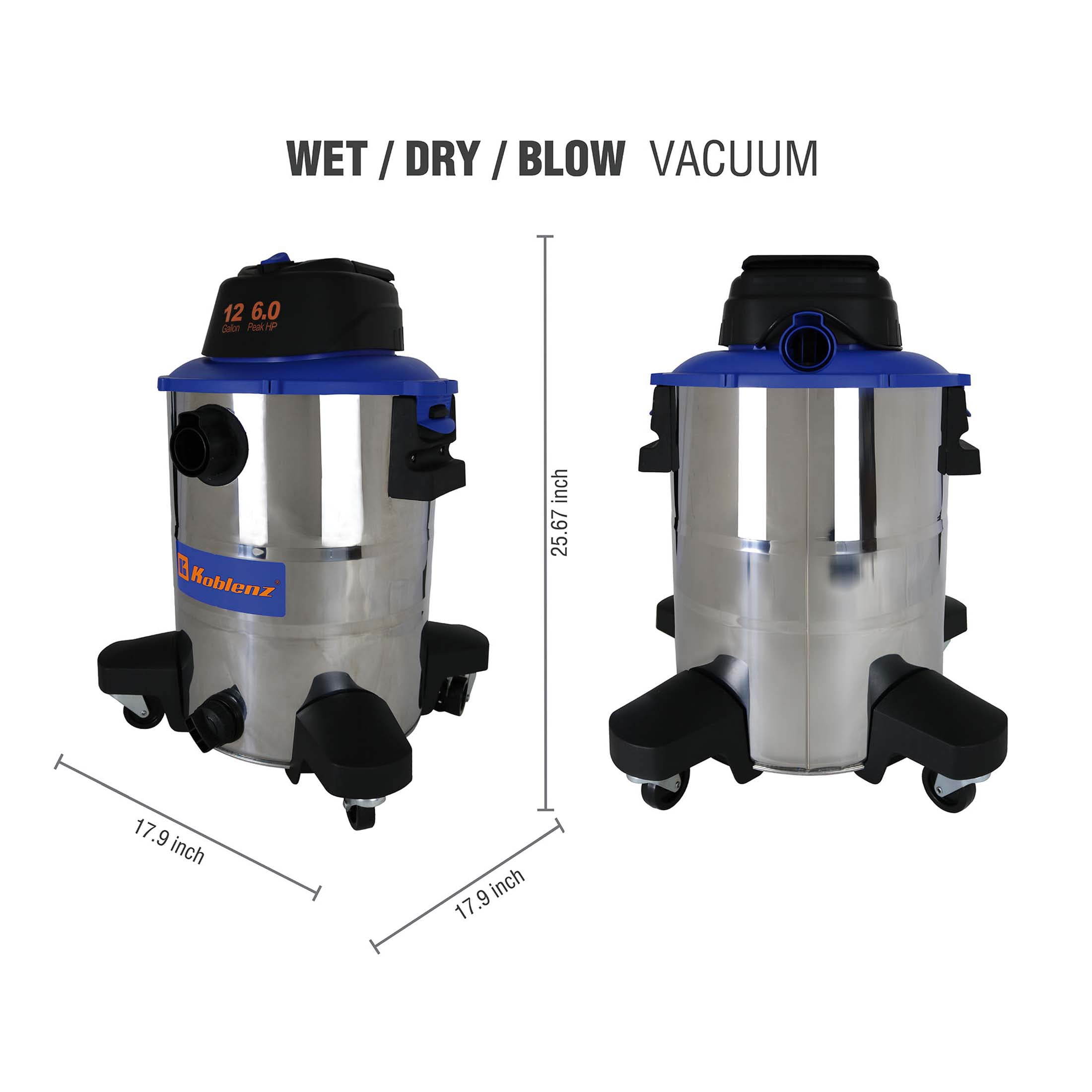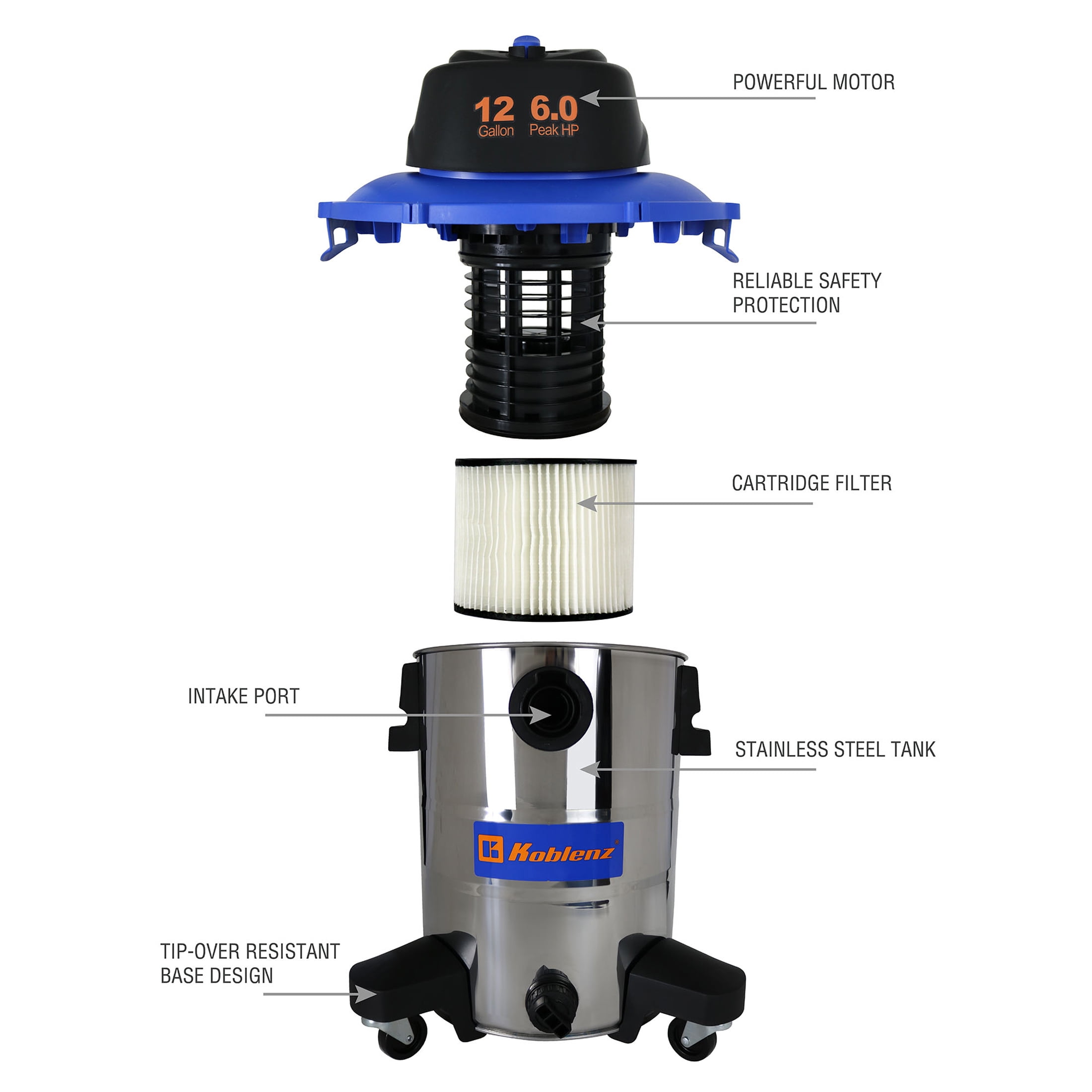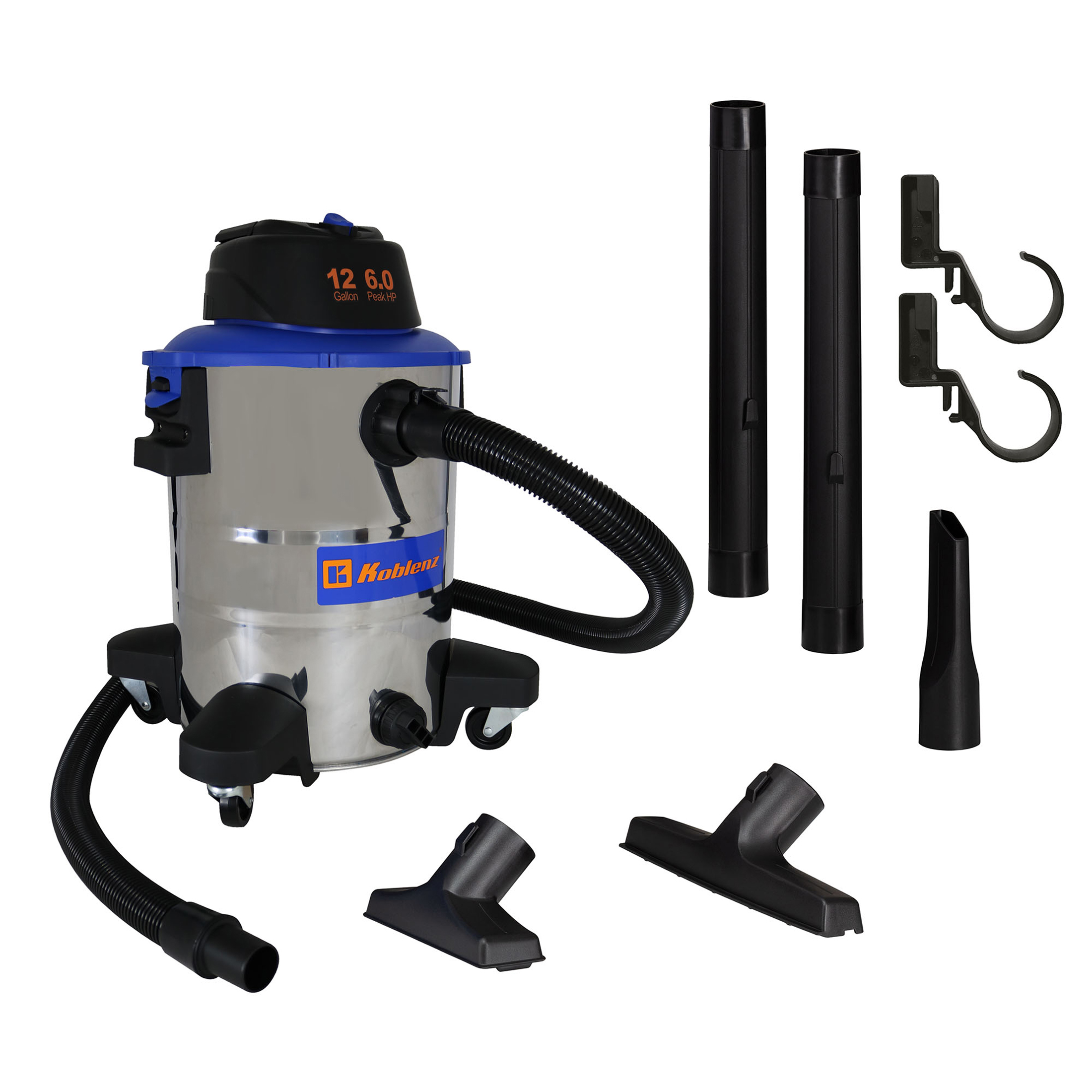 STRONG SUCTION POWER 6 Peak Horse Power Motor with 20 ft. power cord RUGGED AND ELEGANT TANK DESIGN 12 Gallon reinforced Stainless Steel supported by 4 bracket extensions and swivel casters. Liquid drain port included IDEAL FOR LARGER MESSES Around the home, garage, workshop, cars, trucks and vans THREE-IN-ONE CAPABILITY Shop vacuum sucks up dry, wet messes and easily converts into blower mode CLICK-N-LOCK HOSE CONNECTION Securely locks 1-7/8 in. x 7 ft. premium EVA hose into position FILTRATION Cartridge filter provides enhanced dust filtration and extends motor life HOOK-N-STORE ACCESSORIES INCLUDED Hook any accessory around the entire tank parameter, 2-Hose storage clips, 2-Extension Wands, Crevice Tool, Utility Nozzle, Floor Nozzle WARRANTY 5-Year PURCHASE GUARANTEE – KOBLENZ is the industry leading GOLD INNOVATION AWARD recipient manufacturer located in North America, delivering priority shipment service from our US warehouse while providing professional customer service satisfaction for over 60 years.