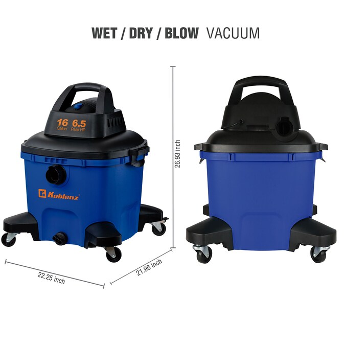 Searching for a vacuum that’s powerful and versatile enough to perform around the home, garage, used to clean the automobiles or extract water from a flooded basement. With KOBLENZ 3-in-1 Wet-Dry-Blow vacuum cleaner unique patented features, rugged 16 Gallon polypropylene tank and powerful 6.5 Peak HP motor your problems are solved. The 2-1/2 inch diameter hose sucks up both wet and dry messes or just conveniently blows away the mess. Think about any wet or dry mess and this vacuum is your friend. Extended 32 feet of reach with power cord, hose and extension wands provide easy and convenient use to pick up dirt and liquid off the floor, on workshop bench, on the furniture, inside your truck or car and around the entire home. Plus, this vac comes with (2) long extension wands, crevice tool, pickup tool and floor nozzle. Desire to blow away dirt and debris off your workshop bench and tools instead of vacuum. No problem, just hook the vacuum hose to the blower port located on the rear side of the vacuum and quickly blow away the mess. Clean with confidence when using KOBLENZ CLICK-N-LOCK secure hose connection that prevents the hose from disconnecting during use. KOBLENZ HOOK-N-STORE accessories and hose clips are uniquely designed to provide easy-to-use and convenient storage around the entire parameter of the tank lid. Unique patented tank design is supported by four extended corner brackets and swivel casters. Liquid drain plug is located at the bottom of tank for quick and easy emptying. Cartridge filter is included to protect motor life. KOBLENZ Fine dust and Washable replacement cartridge filters are also available.