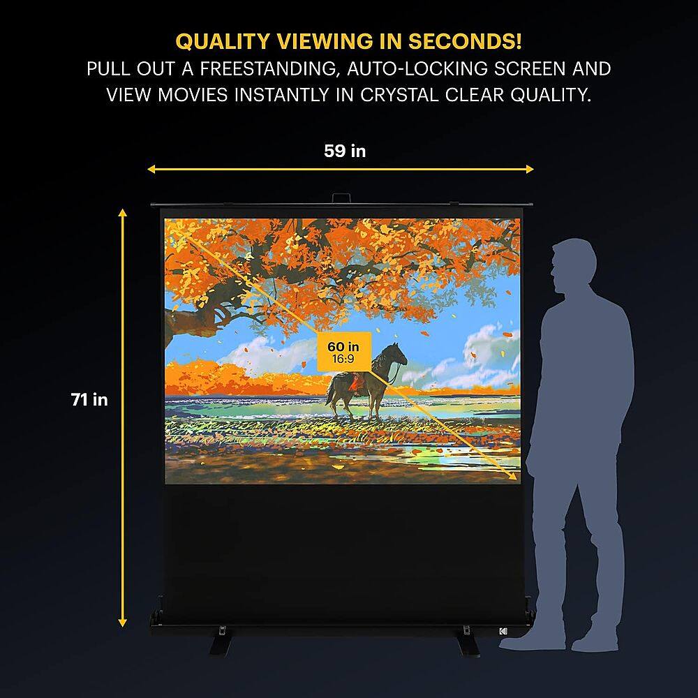 Projecting beautiful entertainment. Watch all your favorite movies and shows in your backyard or meeting with this outdoor projector screen. With the matte quality of this outdoor movie screen, see everything truly pop as you watch projections at home, at work, or in school. The lightweight design makes it easy to take this outdoor screen anywhere and everywhere. Set up the perfect movie night, business presentation, or school lesson using the KODAK Projection Screen with Stand & Handle. In just a few minutes have the set up anywhere you need with this portable projector screen with stand. With this easy-to-clean, grade-A screen, get movie-quality visuals all the time.