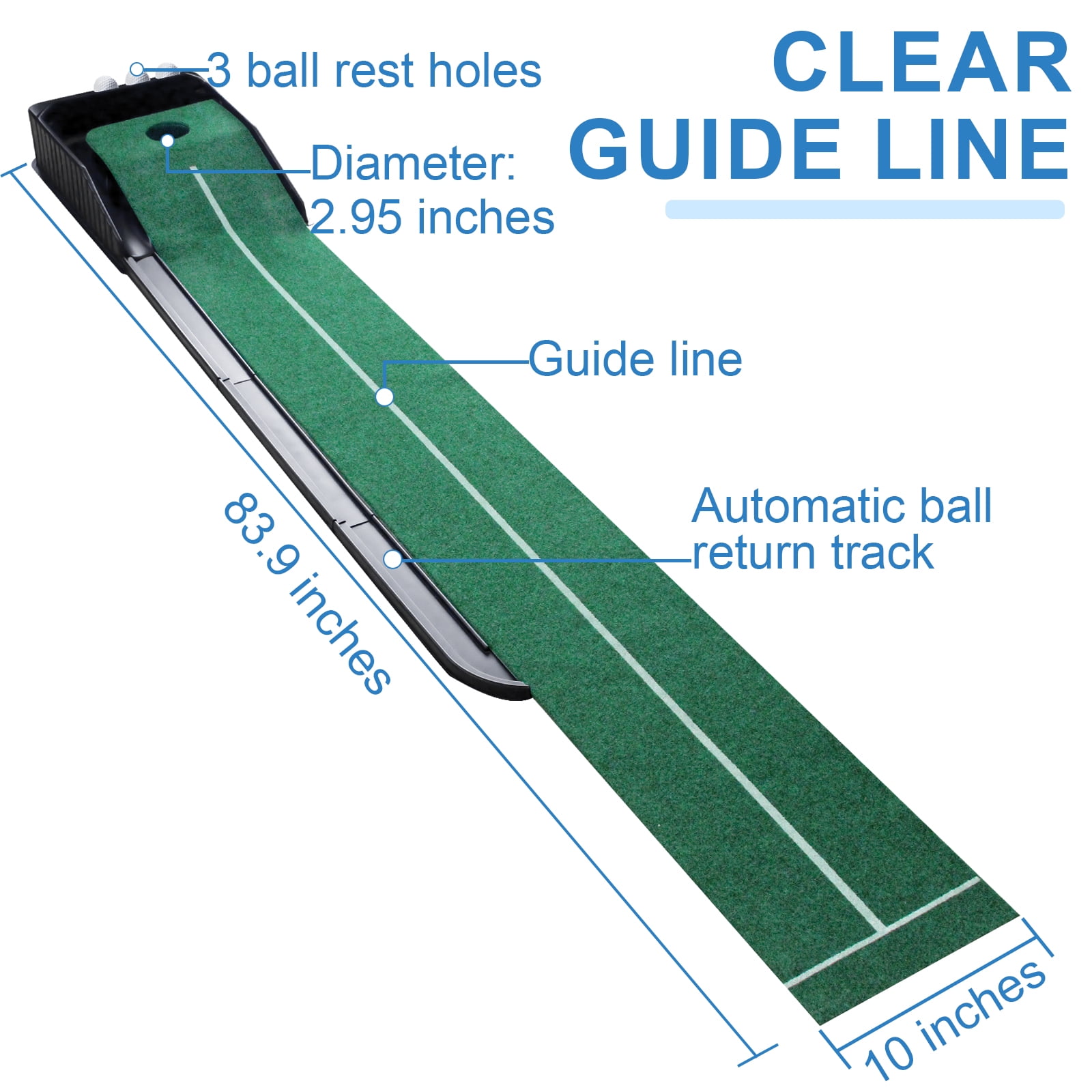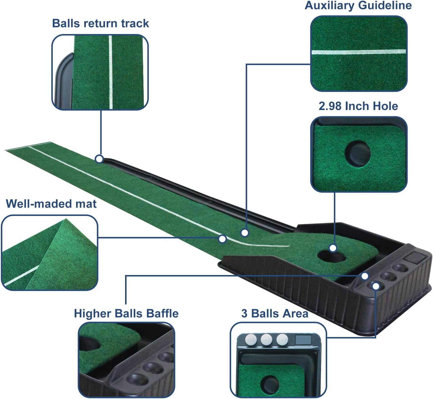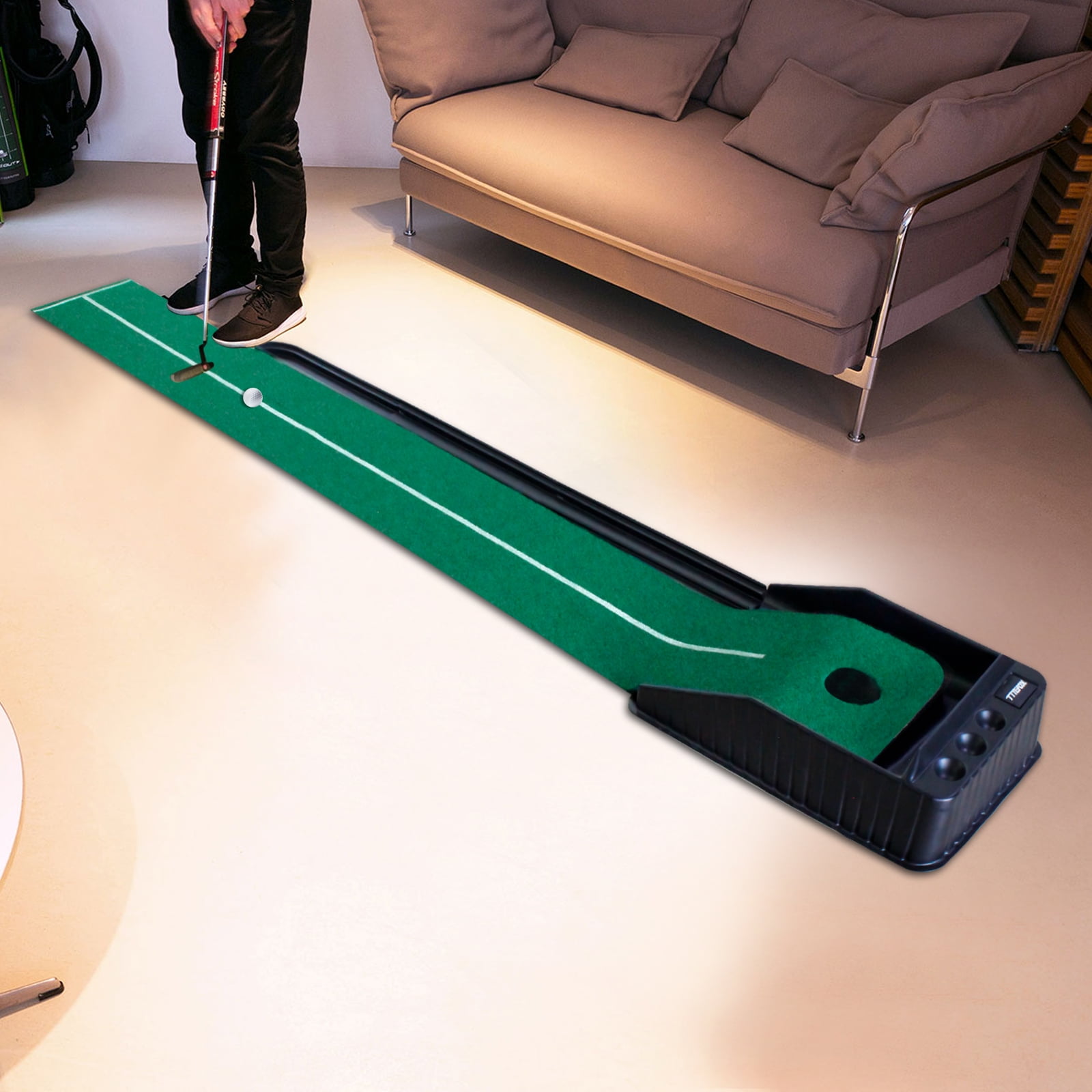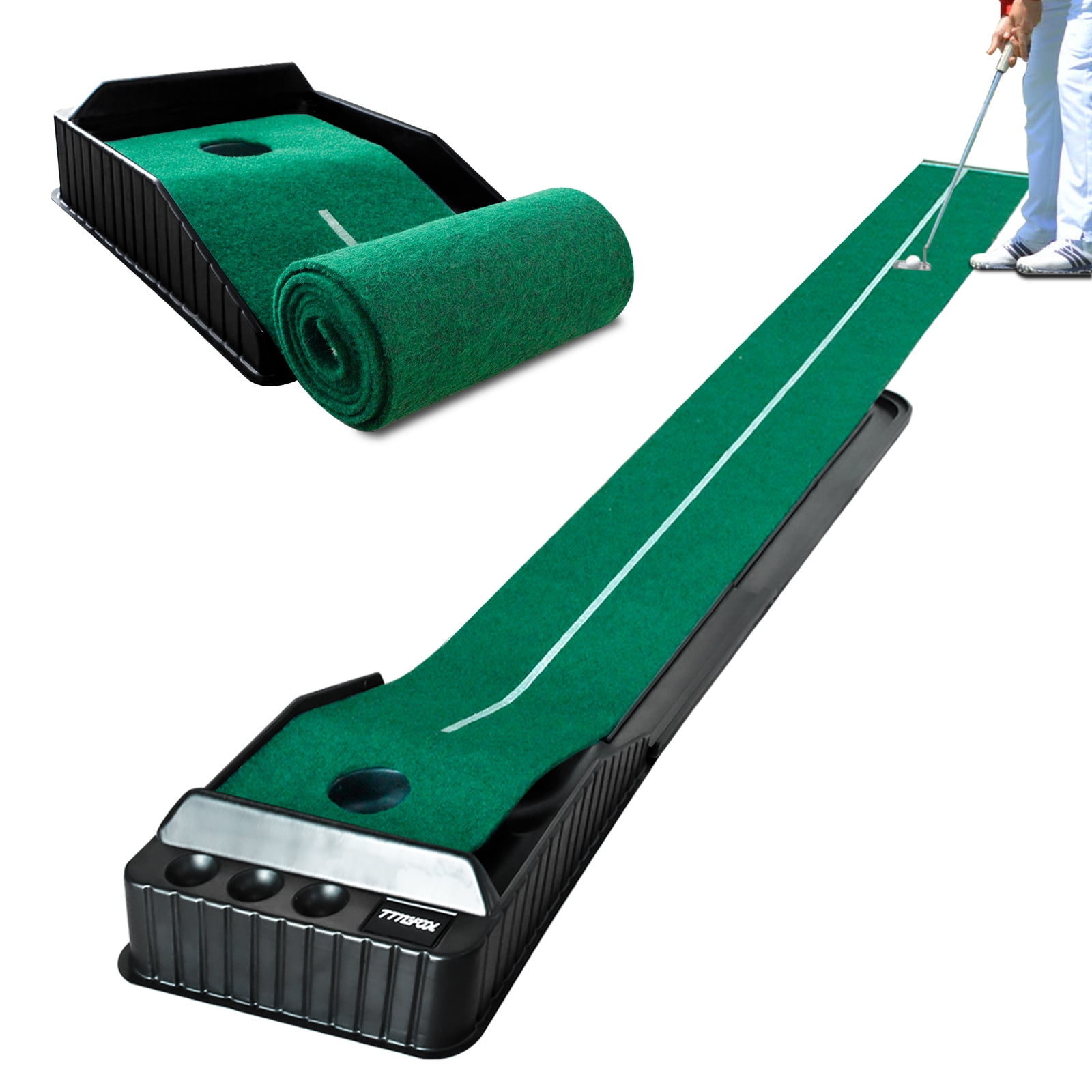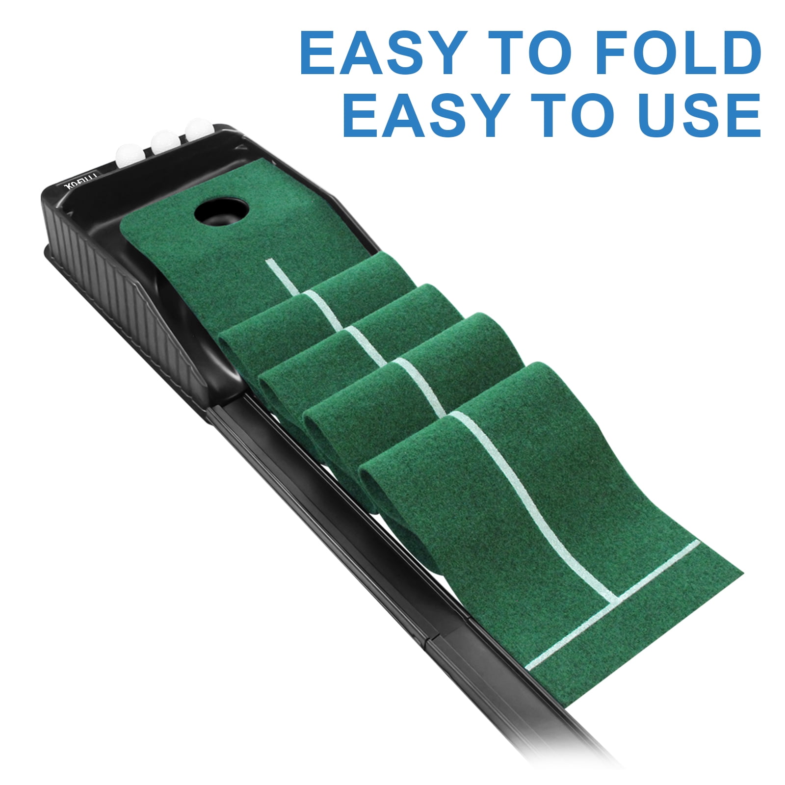 Putting matt for indoors : 7ft indoor putting green with continuous automatic ball return for developing accuracy and control, making your training more efficient and effective. Wrinkle Resistance : The putting green is made of soft flannel. The golf putting mat is not easy to crease and will not affect the path of the golf balls. Clear Guide Line : This golf matt for indoors has an alignment line, helps you improve accuracy and control on every putt. True-roll surface and upslope emulate putts on actual greens. Easy Installation & Space Saving : Carry this portable golf putting green anywhere. It is compact when packaged and easy to assemble without instructions. Ideal Golf Gifts : Giving such a perfect practice golf putting mat as a gift to your family or friends is a wise choice. The mini indoor golf is great for use at home, office or parties.