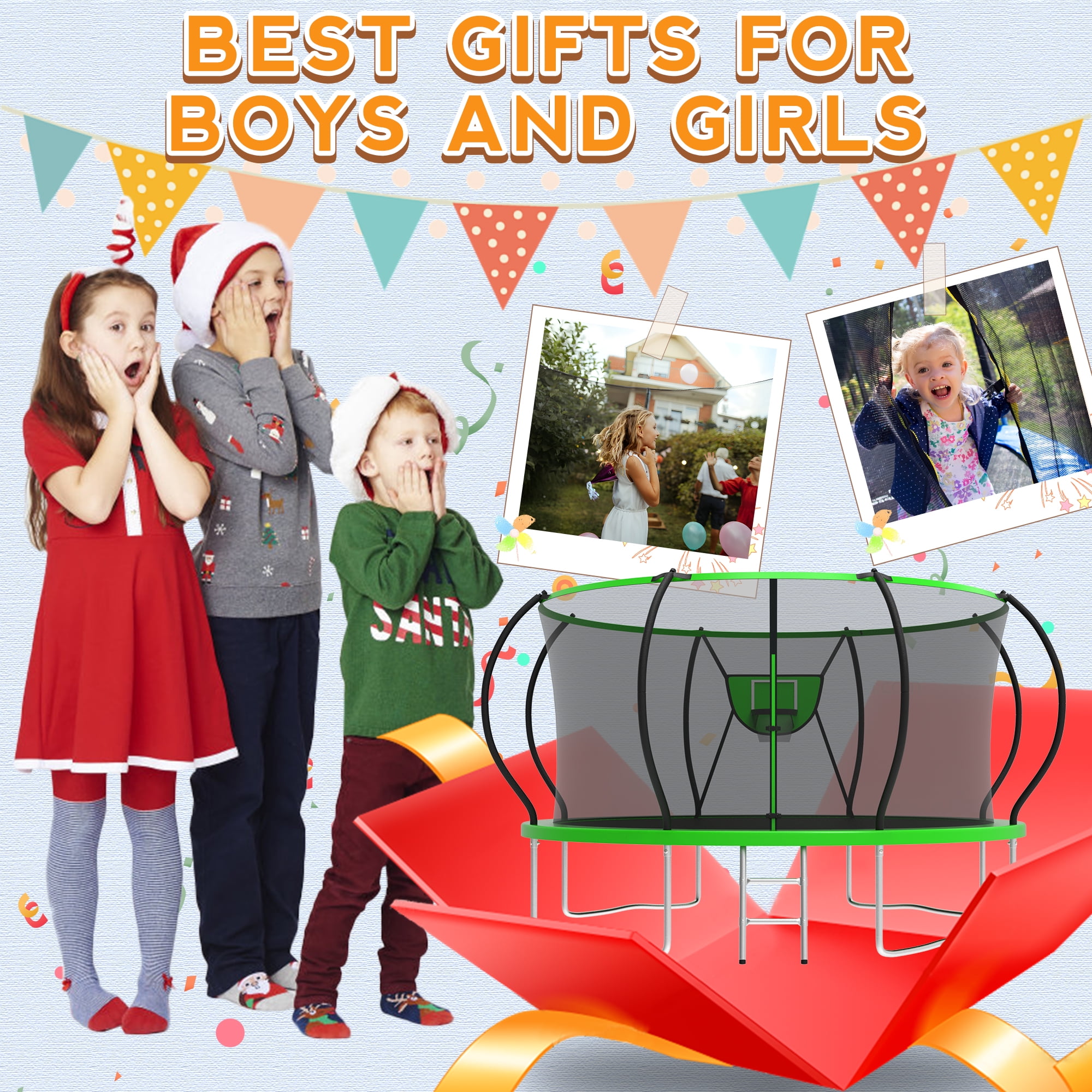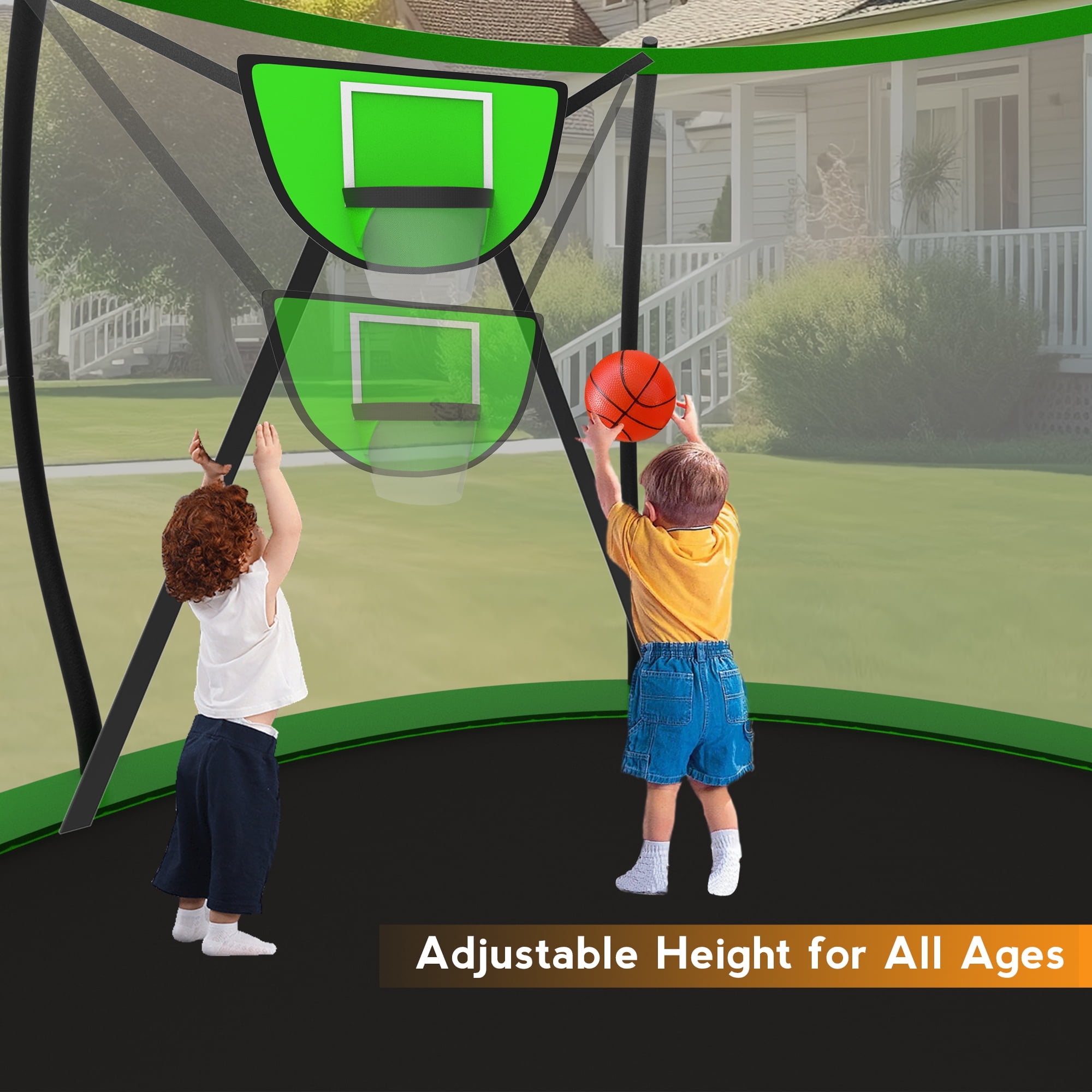 KOFUN Trampoline with Basketball Hoop & Light, 12FT Trampoline for Adults and Kids, No Gap Design Backyard Trampoline with Enclosure Net, Ladder, A Ball, Green