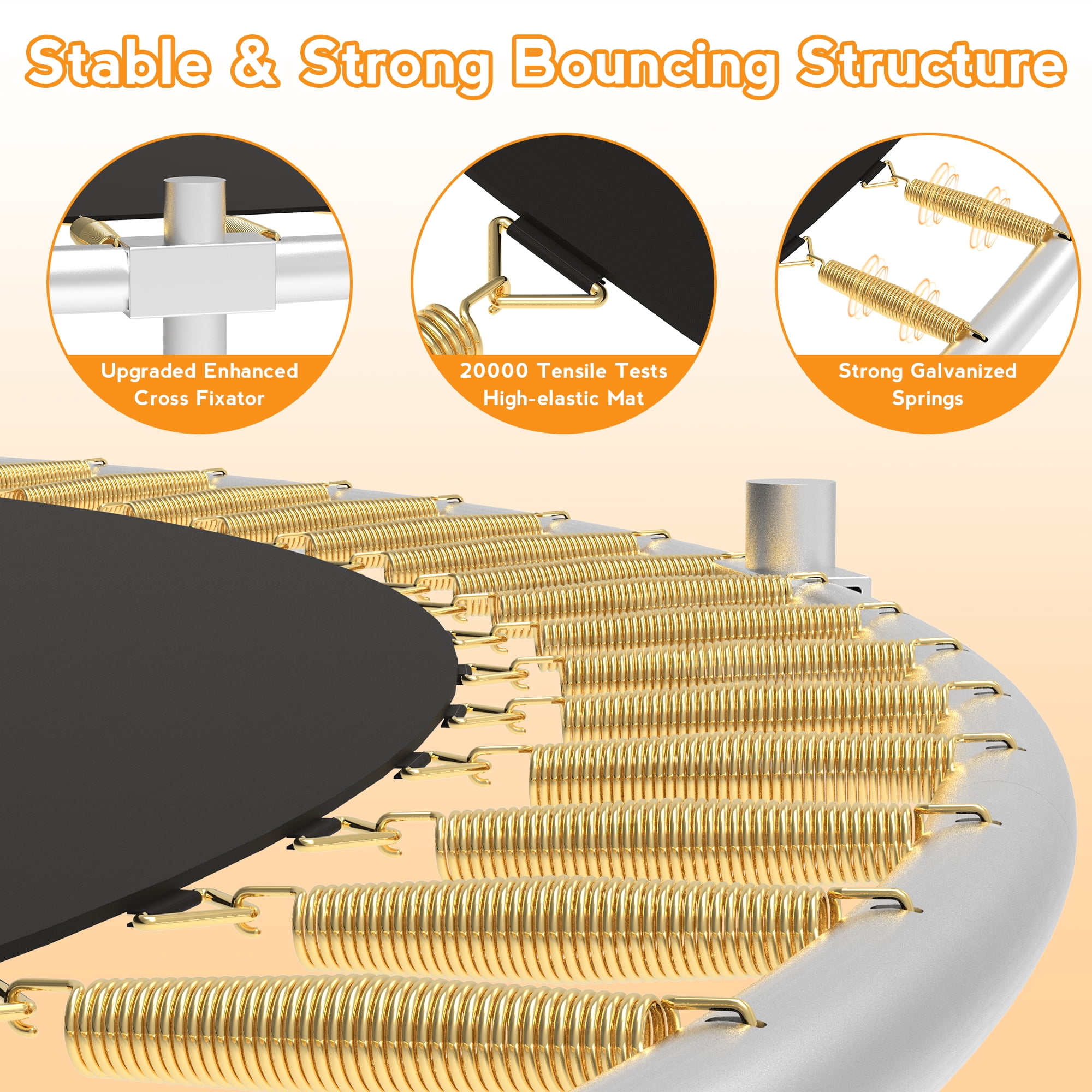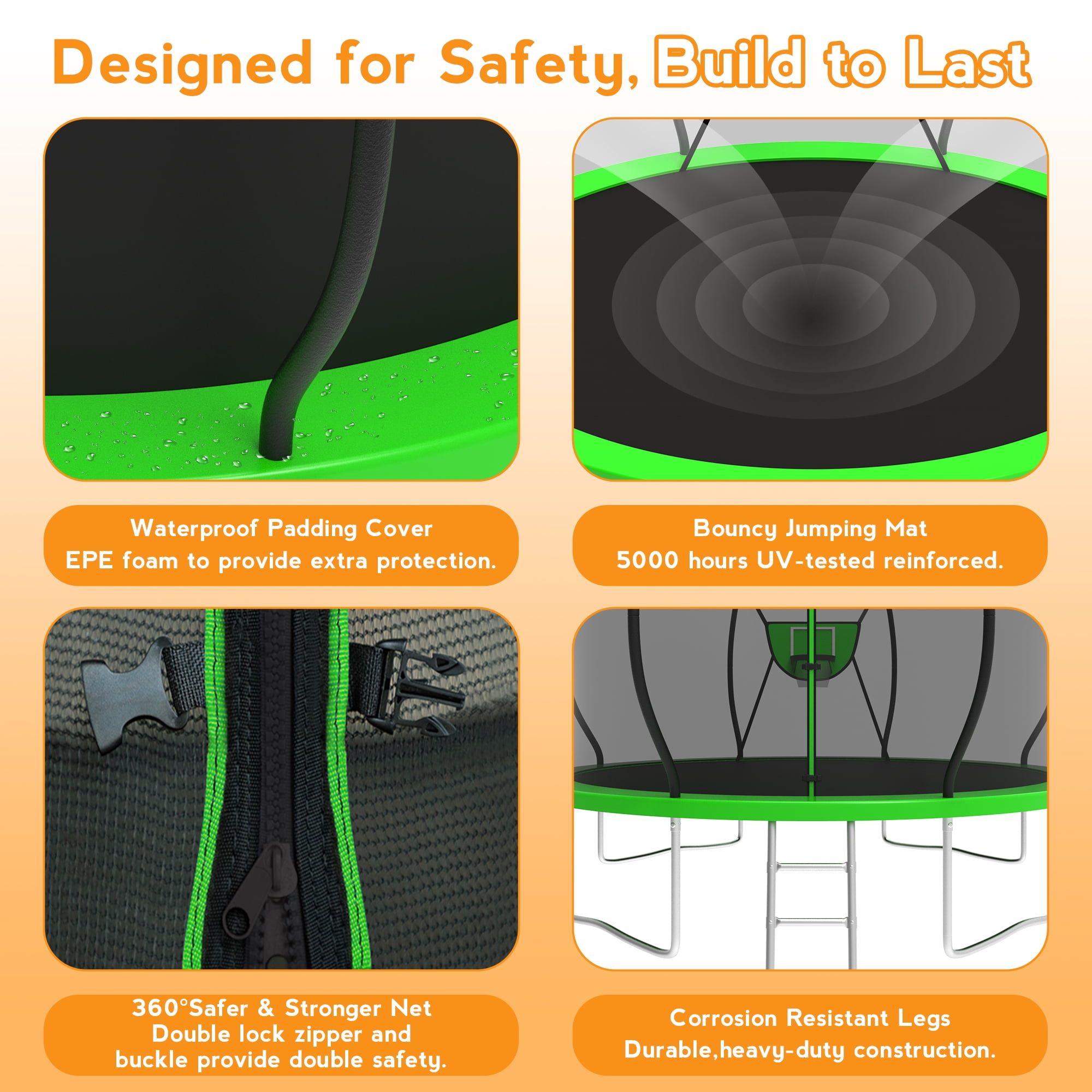 Unmatched Durability & Safety Assurance: Elevate outdoor play with Kids’ outdoor trampoline with safety net designed for lasting joy. We adopt the latest technology of 1.5mm cold-rolled steel, galvanized anti-rust coating, and no gap design when compared to other trampolines in the market. Our Trampoline blends vibrant colors, unwavering reliability, and top-tier safety. The total load capacity is up to 800-1500 LBS, great for the whole family. Details Make Quality: The whole frame is made of a 1.4mm thick W-shape leg covered by galvanized anti-rust coating, more durable and stable; a 7-inch high elastic galvanized spring and high-density and anti-UV PP jump mat provide the best bounce experience; Tightly woven safety enclosure net equipped with the double-sided zipper and double buckle create the safest bounce environment for the families; Anti-oxidation, anti-corrosion, and anti-UV make KOFUN trampoline a longer service life. Easy and Quick Installation: We recommend parents and children install the heavy-duty trampoline together, with the help of our detailed graphic manual, 2 hours are enough; For a better installation experience, the spring tools and gloves are furnished in the package. The families could gain a 100% sense of achievement by installing the super trampoline together. The Best Service on the Planet: KOFUN offers an exceptional trampoline with a basketball hoop, a 12-month warranty including all trampoline accessories, and 7*24 online and telephone service. Any questions or doubts during installing and using the trampoline, please don’t hesitate to contact us. Our customers soon come to realize the exceptional quality and service we provide as a company that truly cares about families. One Box for the Trampoline, One Package for the USB Light: We’ve ensured your new trampoline arrives quickly, with all parts conveniently packed in one box, so you can start assembling it right away. Please note that the LED light is shipped separately in a small package. Once the trampoline is set up, you can easily install the string light.