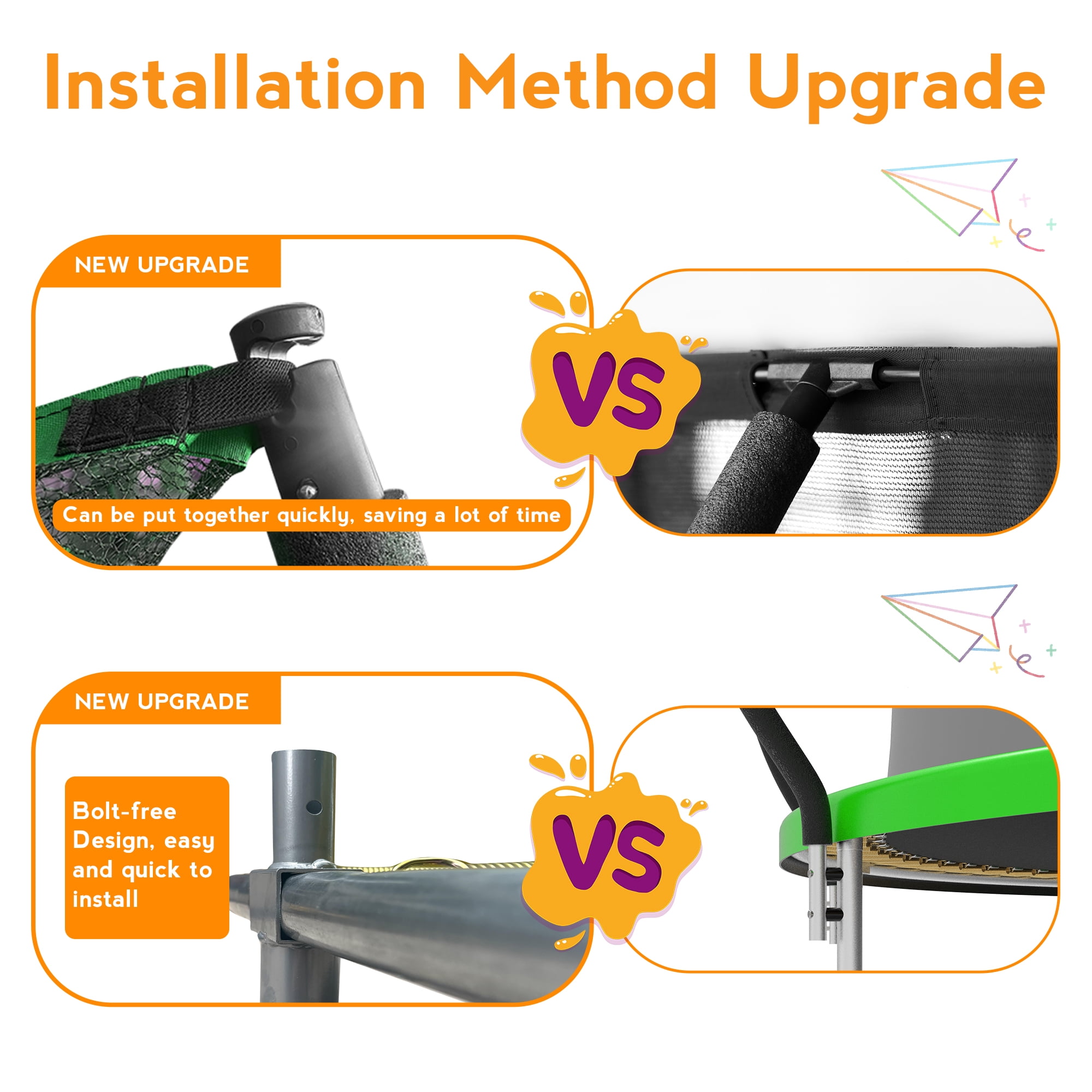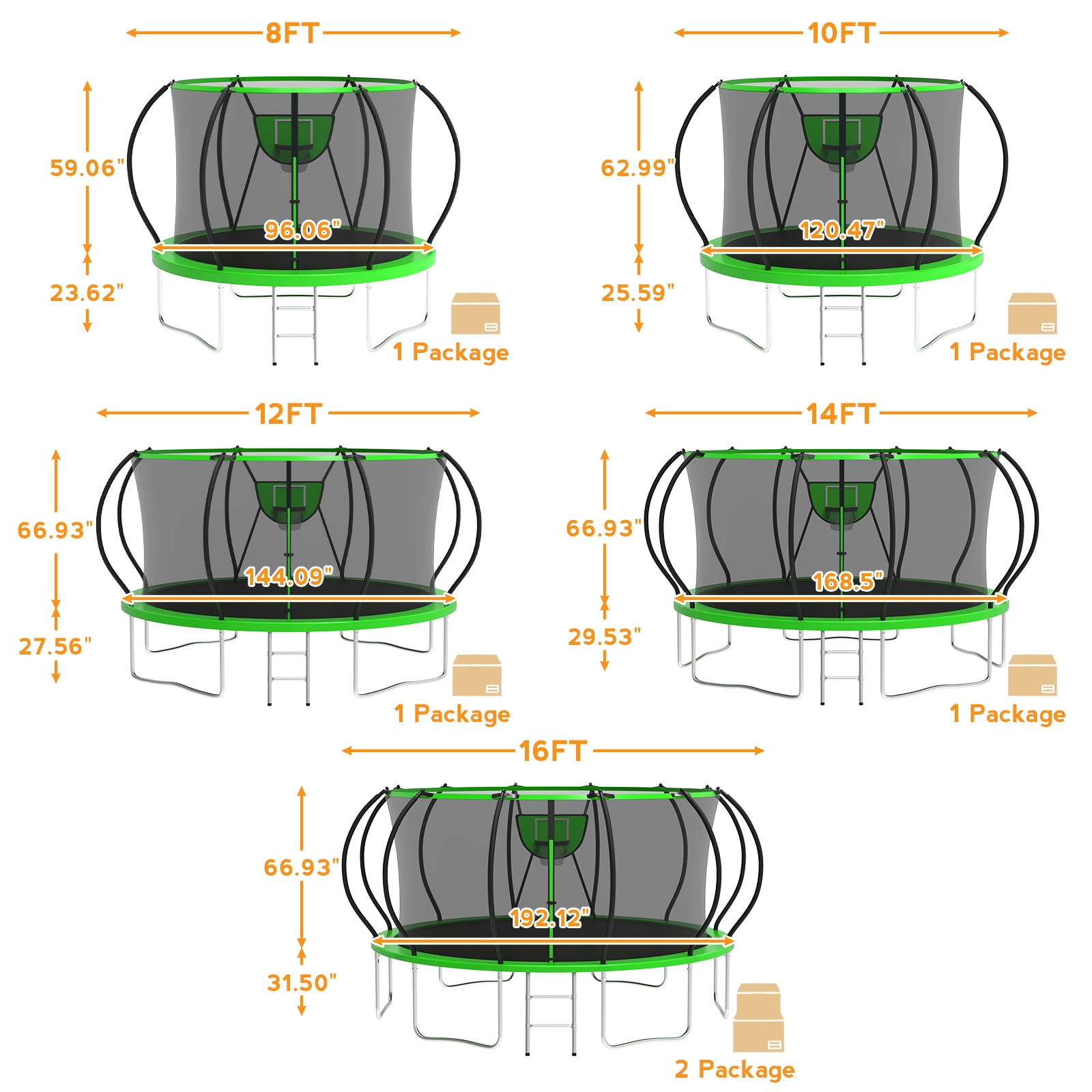 KOFUN Trampoline — Get Your Heart Pumping! The New upgraded KOFUN trampoline is the best gift for kids. All KOFUN trampolines use the latest hot-dip galvanizing technology to make trampoline frames and net poles last for decades. New technology gives the trampoline better safety and longer life. KOFUN trampoline provides a Safer Jumping Environment and Excellent Bounce. It is engaging fun and wonderful memories for all ages. It’s a great source of exercise, perfecting the little ones to strengthen legs and knees. Make your kids stay away from computer games and TV. Let them enjoy the fresh air and sunshine. Trampoline with USB LED light To add extra fun to the trampoline, the KOFUN trampoline includes a colorful trampoline LED light. The USB trampoline LED light is waterproof and can be used with sprinklers together at the same time. Your kids will enjoy a colorful night. (Please note that the LED light is shipped separately in a small packet and it will be delivered to your mailbox, it’s not in the trampoline package.) Worry-free After-sales Service Our outdoor trampoline comes with a 12-month warranty including all trampoline accessories. Please feel free to contact us to get more help if you have any concerns, we will give you a prompt reply within 24 hours. Features Made of hot-dip and double-sided galvanized steel pipes Complete safety protection with high-density enclosure net A thick and soft safety pad protects feet from getting injured Equipped with highly resilient and UV-resistant PP jumping mat Safety buckle and double-headed zipper add dual protection to the entrance Equipped with a basketball hoop for children to enjoy shooting while jumping Products included Basketball Hoop + Inflator + A Ball + 1 Light Strip Specifications Material: Galvanized Steel, EPE foam, PE Cloth Size: 8FT/10FT/12FT/14FT/16FT Color: Green/Blue/Black Weight Capability: 800LBS/1000LBS/1200lbs/1400LBS/1500LBS Number of Legs: 3/3/4/5/6 Number of Safety Poles: 6/6/8/10/12 Number of Springs: 48/60/72/80/108