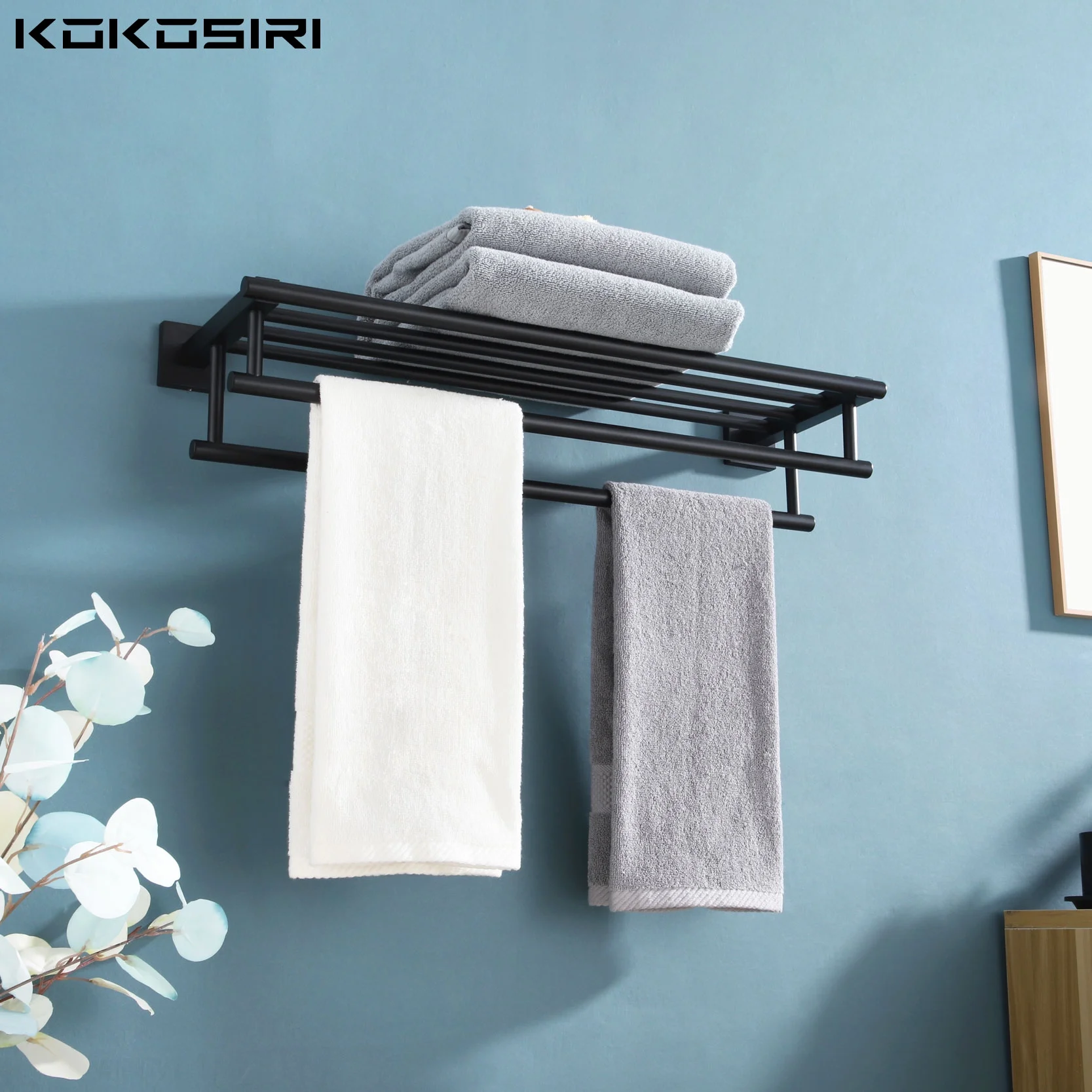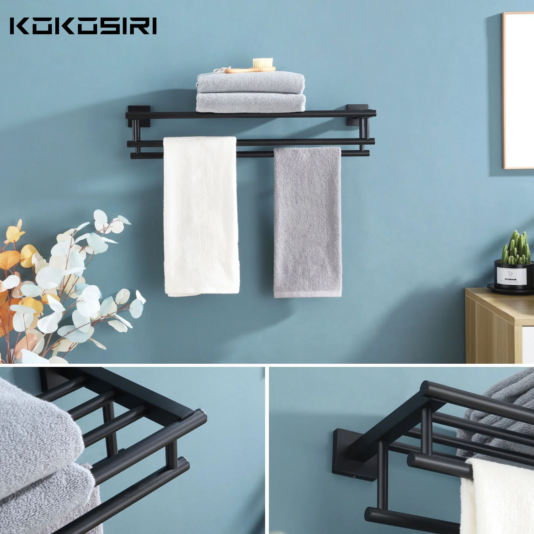 KOKOSIRI Bath Towel Rack with Double Towel Bars Bathroom Towel Shelf 24 Inch Towel Holder Wall Mounted Stainless Steel Matte Black B6005BK-L24