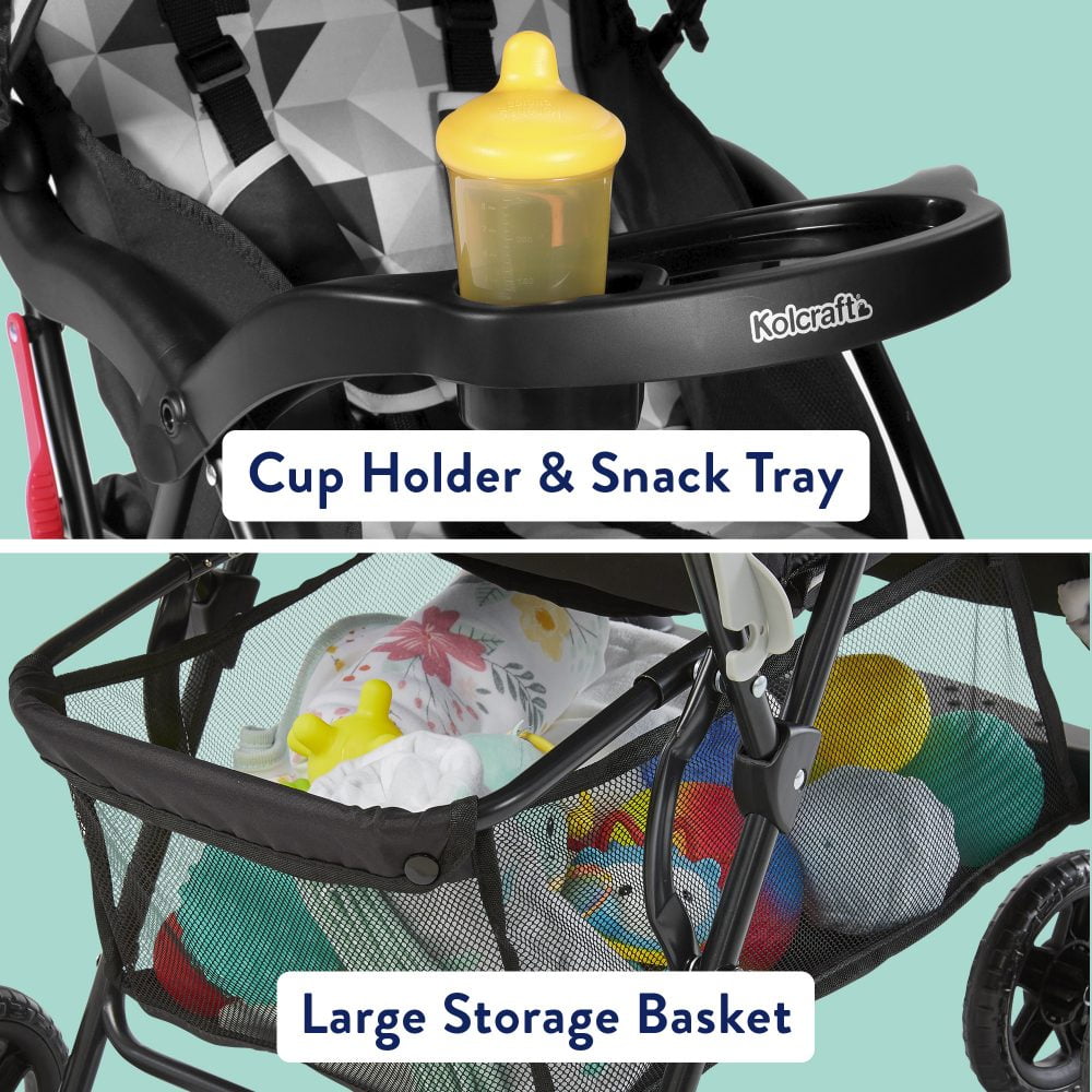 Travel-friendly unisex lightweight design Parent tray with 2 drink holders and extra storage area. Large, easy-to-access storage basket to hold your items BPA-free removable child tray with dual cup and juice box holder Convenient 1-hand and self standing fold, ideal for car travel and vacations Multi-position reclining seat offers 5-point safety restraint system and accommodates child up to 50 lb 3 tier extended canopy for maximum UV protection with peek-a-boo window IMPORTANT – CHECK THE SELLER PRIOR TO MAKING YOUR PURCHASE. Kolcraft cannot guarantee the quality or authenticity of Kolcraft products from unauthorized sellers on . To ensure the very highest safety and quality for you and your family, only buy from listings that are “Sold and Shipped by .” The Kolcraft warranty does not cover products purchased from unauthorized sellers.