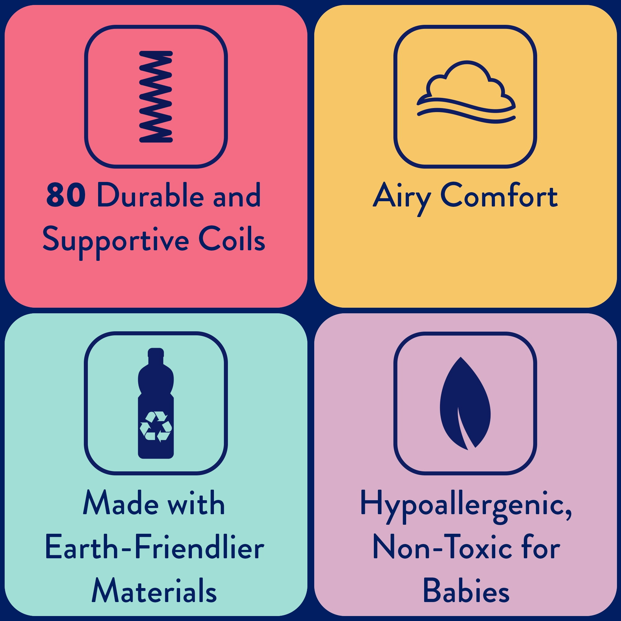 Kolcraft is a family-owned and operated baby crib mattress manufacturer. Since 1946 Kolcraft has proudly led the crib mattress industry to help create safety and quality standards for all companies to follow. Infants and toddlers deserve a safe sleeping environment, which is why every crib mattress we make uses materials screened for air quality, chemicals, comfort and lasting durability. Kolcraft invented 2-stage dual firm crib mattresses, airflow cover designs, and introduced sustainable baby mattresses to the world. In fact, Kolcraft makes every baby crib mattress and toddler mattress in our own factory for hands-on quality control of each component. We never outsource production so you always know you are getting a new, quality tested crib mattress from Kolcraft. Innerspring coil crib mattresses are highly durable and can last forever. Ours are heat-tempered and resilience tested for longevity, making a great solution for growing children! We don’t skimp on the comfort cushioning. Ultra thick and extra ortho layering is always the standard. We invented quality control methods above and beyond any crib mattress standard. This is why parents have depended on Kolcraft for firm crib mattresses, safety-tested, and value-friendly to help you choose the best for your baby. Every baby crib mattress are ASTM and CPSIA compliant, GREENGUARD GOLD Air Quality Certification as well as all federal safety regulations. Our crib fit testing device has become an industry standard, and every baby mattress is firmness tested to help reduce the risk of suffocation. The Kolcraft Dual Firm Pediatric Premier Crib Mattress and Toddler Mattress features lively patterns including moonlight Stars and Moons, Earthy Woodland Forest Animal Friends, and Dreamy Jungle Safari Animals designed with natural colors for baby girl and baby boy nursery decor. Kolcraft Pediatric Premier baby crib mattresses are upgraded with an EPA-registered antibacterial surface that is gentle on baby. Research shows families prefer antibacterial baby mattresses that are laboratory-tested and validated to help stop the spread of bacteria on baby’s crib mattress. Also, essential waterproof crib mattress surface is easy-clean, wipeable, and comes with lock-stitched waterproof edges all around. Resists stains and odors! No washing required, simply wipe down with damp cloth or mild soap and water. An airflow pocket helps the mattress to breathe without any metal zippers or metal holes. Durable 80 coils baby mattress with extra-thick steel. Grow-with-me 2-stage dual firmness means a firmer infant side and a cozier toddler side. Sustainable comfort cushioning on both sides. Non-toxic air quality certified cushioning made without any toxic fire retardants. Fits snugly in full standard size cribs and toddler beds. Ultra-lightweight crib mattress weighs only 10 pounds to easily flip and change crib sheets. Measures about 52″L x 27.5″W x 5″ thick. 10-year warranty for workmanship and materials. Parents have depended on Kolcraft for quality baby products for over 77 years!