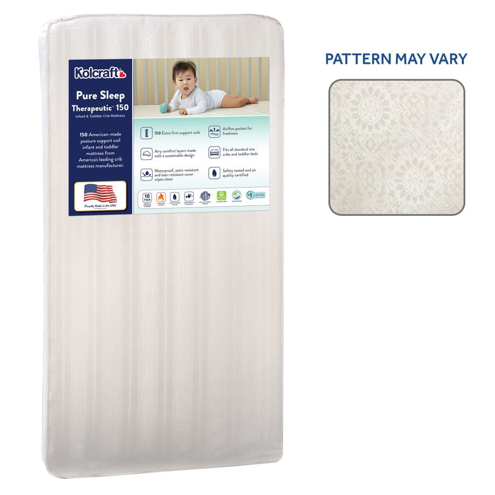 Kolcraft is a family owned and operated baby gear company. The Kolcraft Pure Sleep Therapeutic 150 crib mattress is an extra firm baby and toddler mattress with 150 durable coil springs, a waterproof surface and comfy cushioning throughout. The entire mattress passes GREENGUARD GOLD certification and ASTM crib mattress standards helping to ensure top quality and safety features. The mattress core is durability tested for years of use and carries a 10 year warranty on workmanship and materials. Use this mattress in your infant’s crib as well as your child’s toddler bed as he or she grows. The waterproof cover is reinforced to help prevent tearing and the entire surface and lock-stitched binding won’t allow leaks to seep inside the mattress surface. This offers an easy-clean, wipe-clean surface.