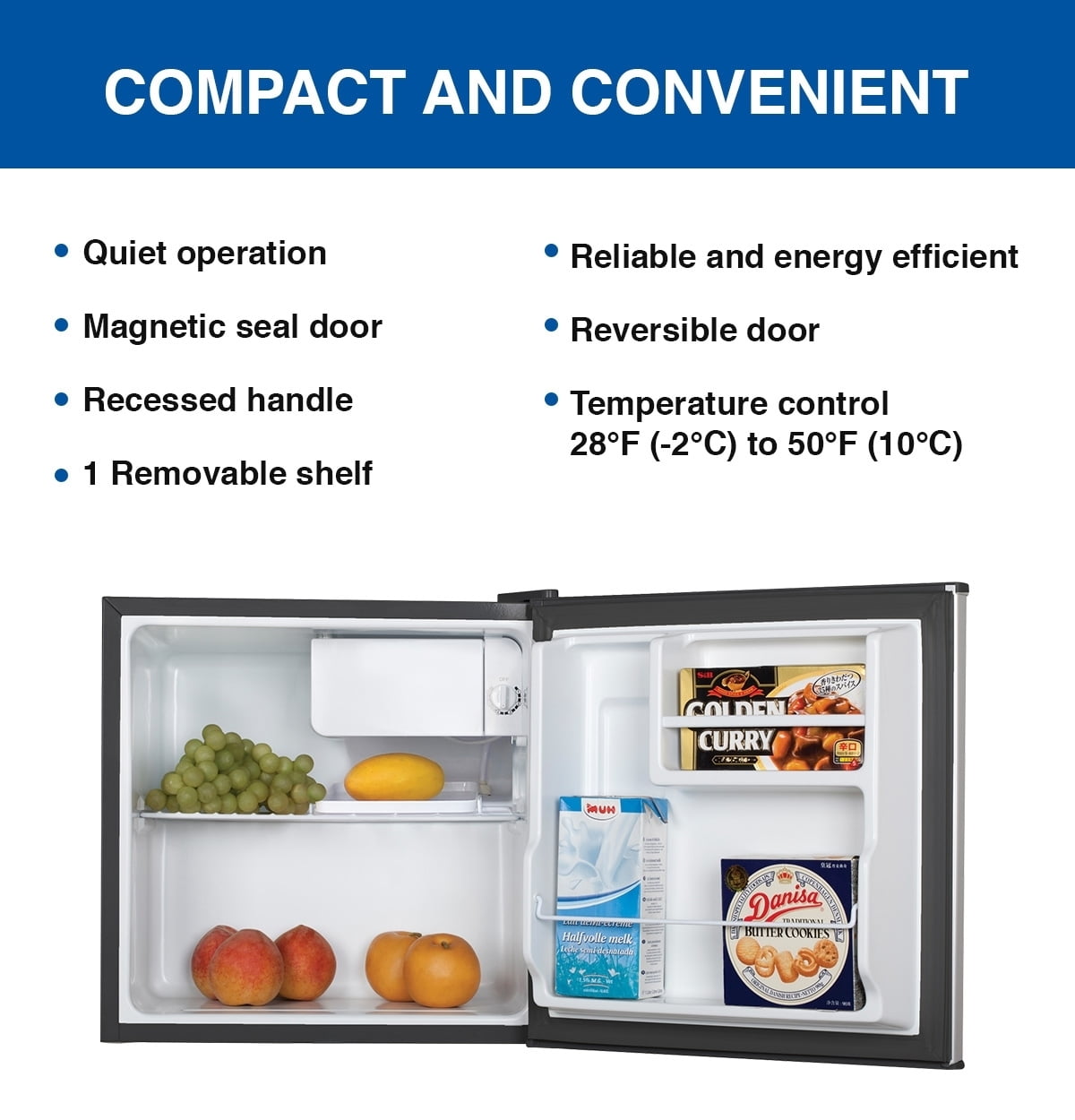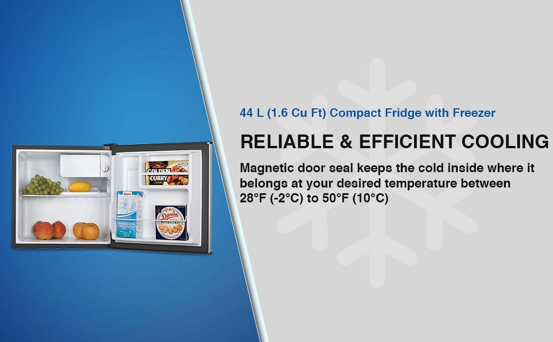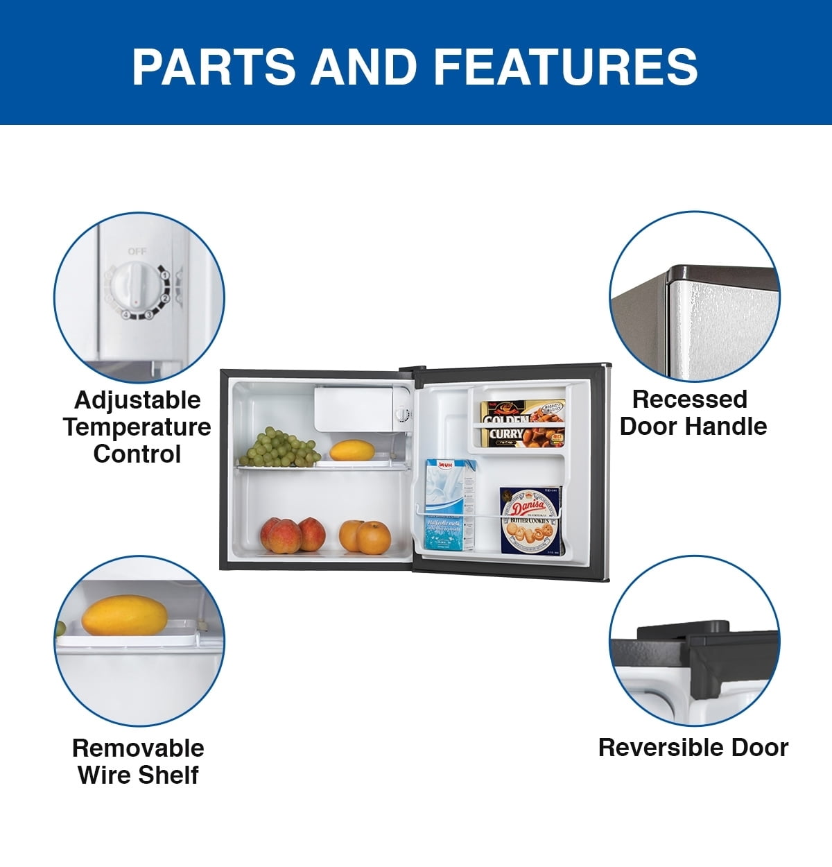 1.6 cubic foot (44 L) capacity Space-saving flat-back design Built-in freezer compartment Compact size fits easily on a countertop or table Wire shelf can be repositioned or removed to fit different sized items Reliable and energy-efficient compressor cooling technology Adjustable temperature with simple dial control Temperature range from 28°F (-2°C) to 50°F (10°C) Drip/defrost tray included for easy cleaning and defrosting Contemporary stainless steel and black exterior Reversible door with recessed handle can be installed to open left or right