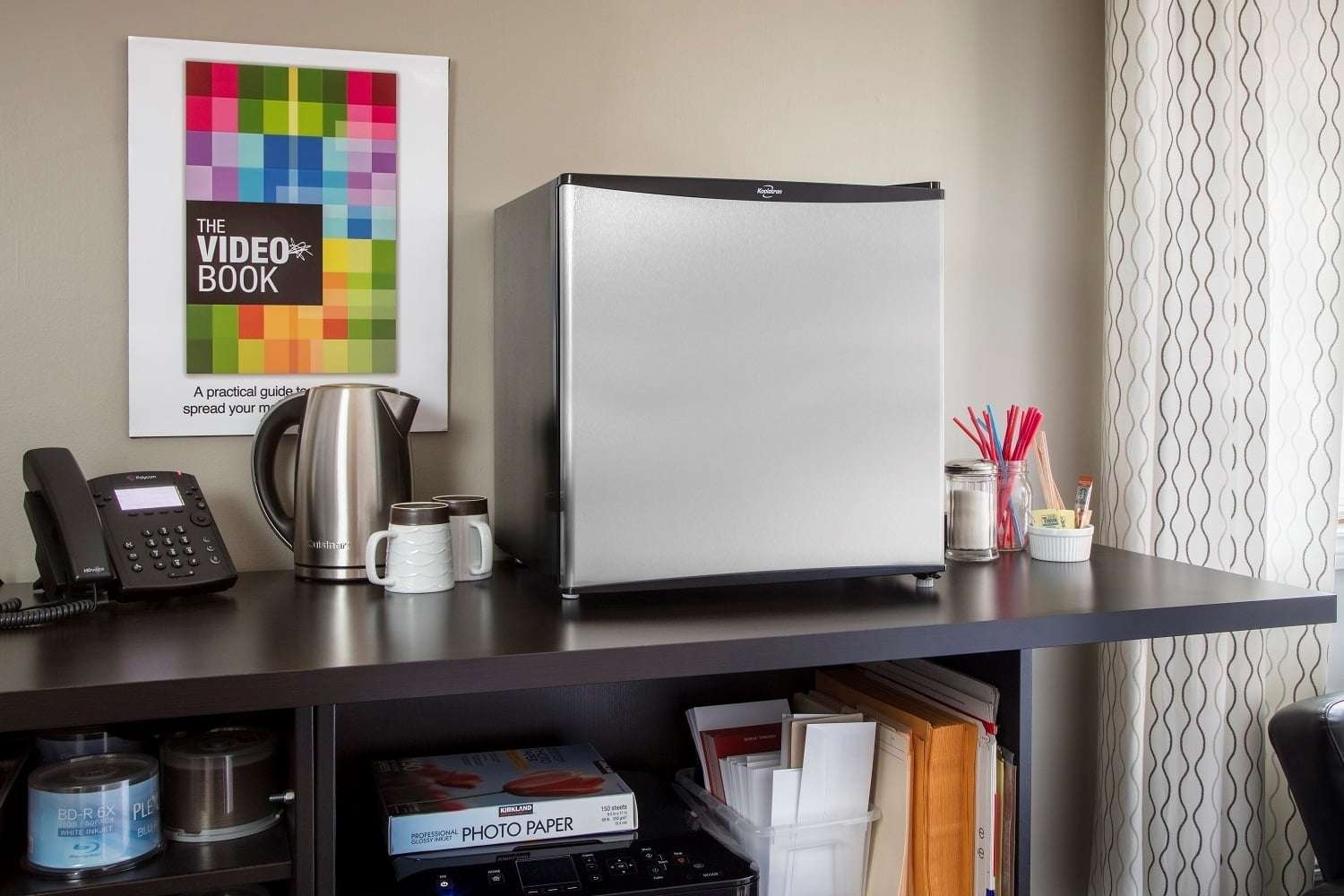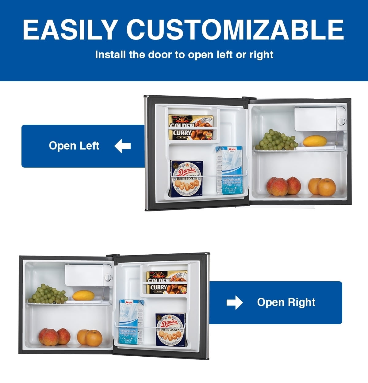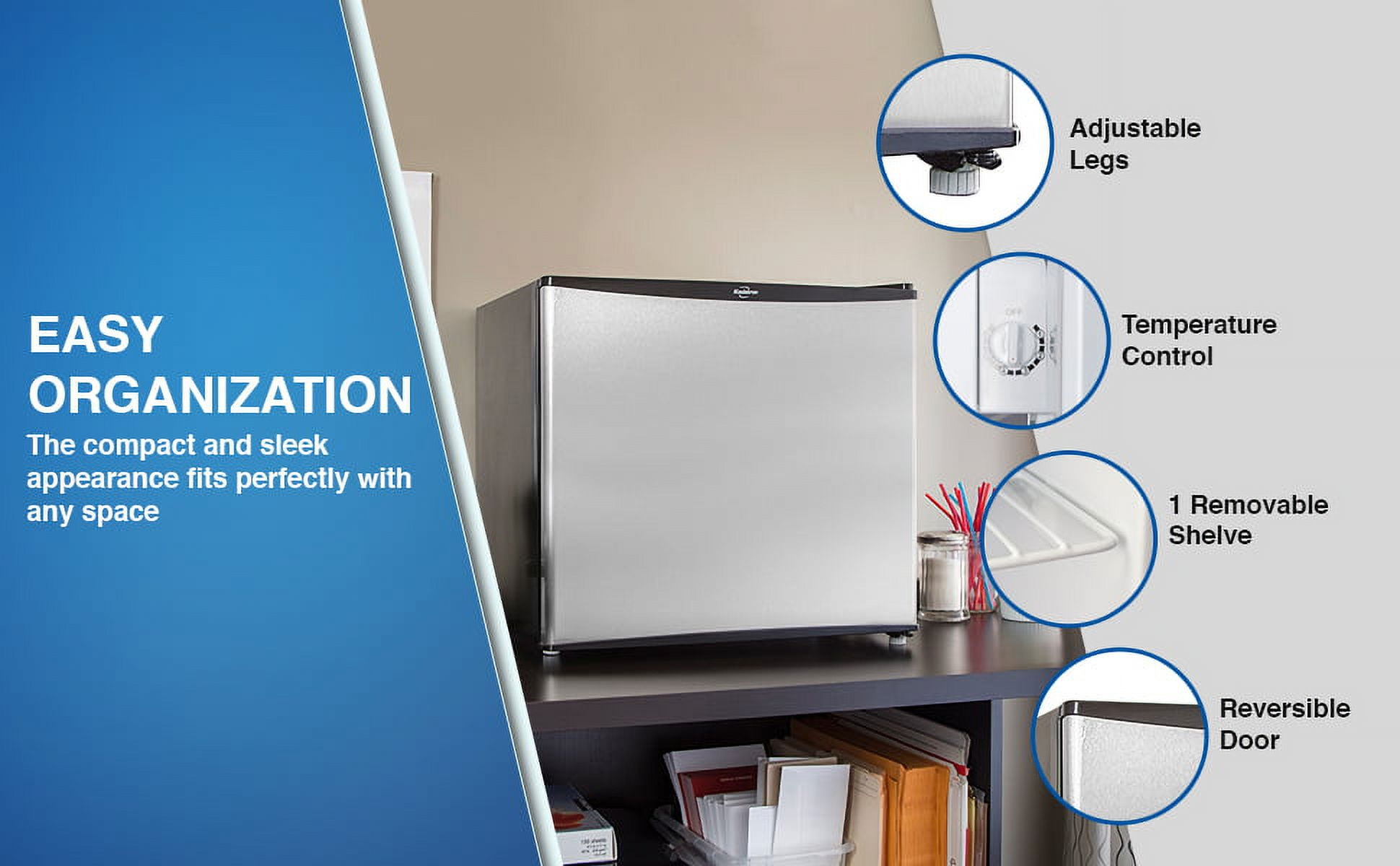 1.6 cubic foot (44 L) capacity Space-saving flat-back design Built-in freezer compartment Compact size fits easily on a countertop or table Wire shelf can be repositioned or removed to fit different sized items Reliable and energy-efficient compressor cooling technology Adjustable temperature with simple dial control Temperature range from 28°F (-2°C) to 50°F (10°C) Drip/defrost tray included for easy cleaning and defrosting Contemporary stainless steel and black exterior Reversible door with recessed handle can be installed to open left or right