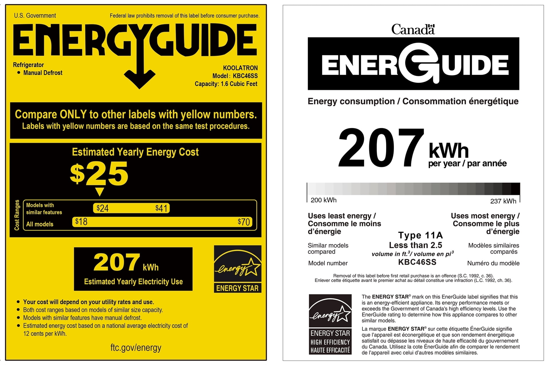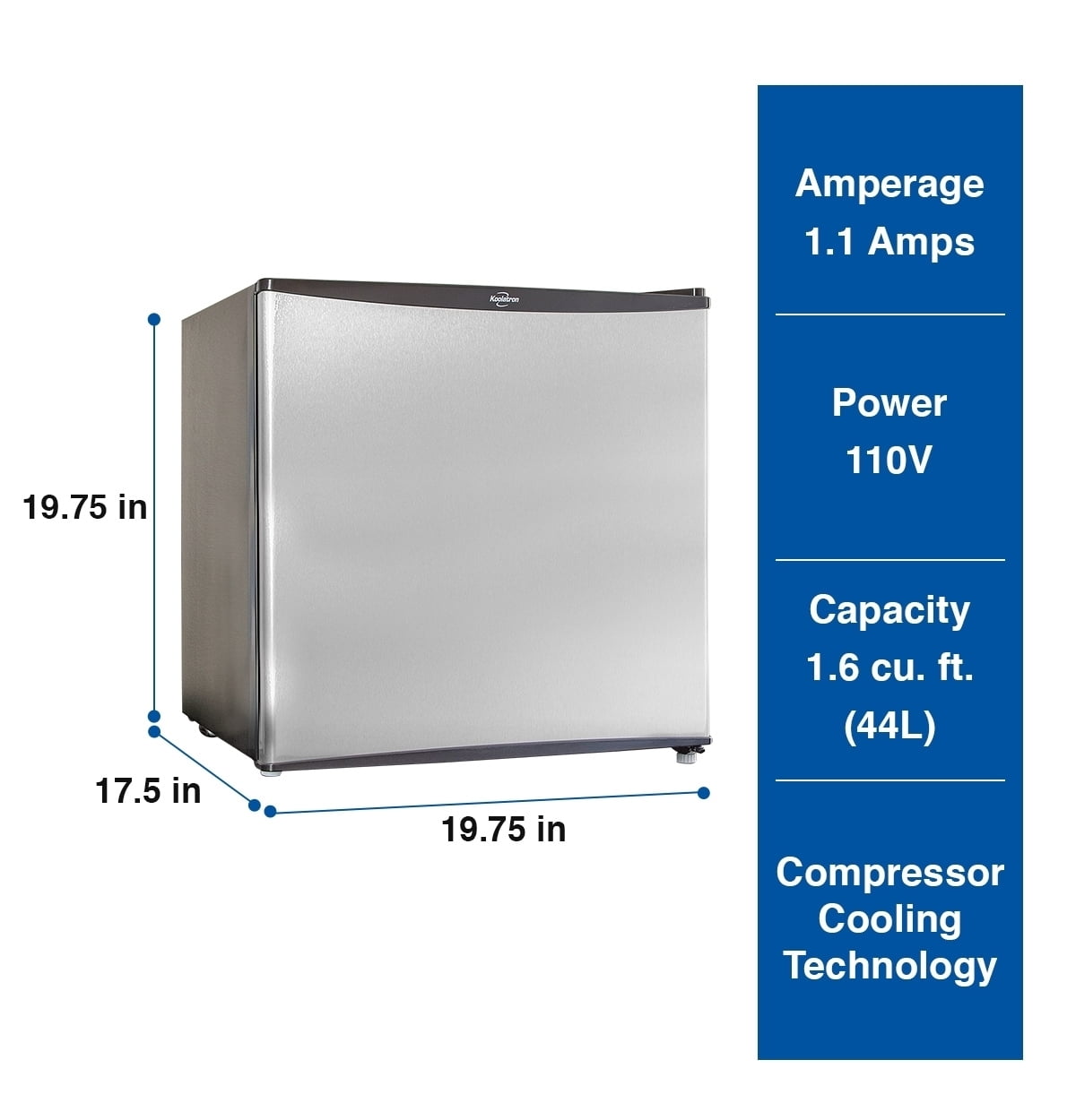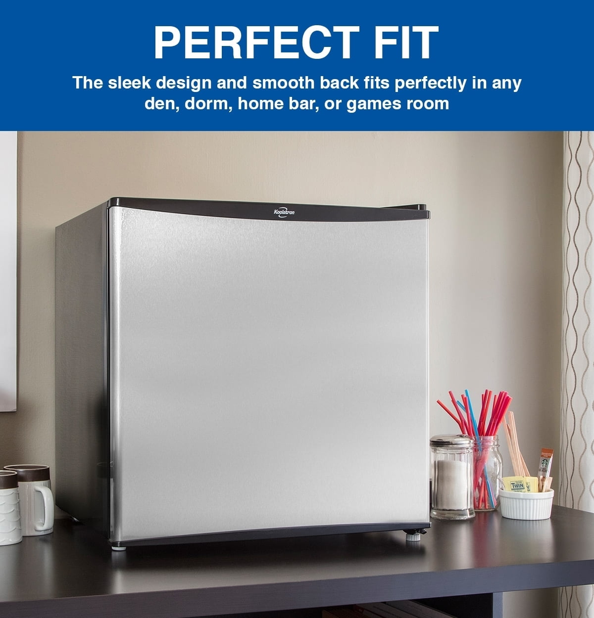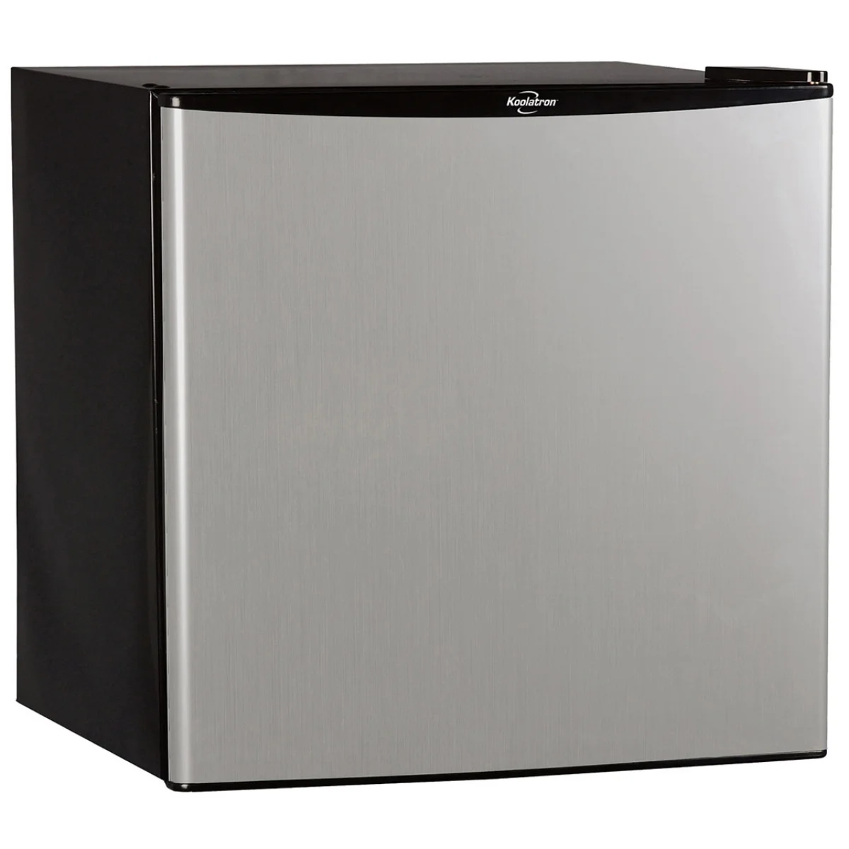 The Koolatron 1.6 Cubic Foot Stainless Steel Personal Refrigerator is a great addition to any kitchen, rec room, dorm room, home bar, or anywhere a compact fridge is needed. The Koolatron Compact Fridge will keep your favorite drinks and food cold. The stainless steel refrigerator is powered by a high-quality compressor that requires minimal power. Compressor cooling ensures reliable, quick, and efficient temperature control. With the adjustable thermostat, you can set the temperature between 32°F and 50°F (0°C and 10°C). You can set your desired level of cooling to ensure that the stored food and beverages are cold and fresh. The personal fridge also boasts of a compact freezer section with a capacity of 0.14 cubic foot that can be used to store frozen food. The compact refrigerator also features a reversible door with magnetic seal. The door compartment can hold a 2-liter container with ease, and the removable shelf helps you keep your food organized. With its flat-back design, the refrigerator can be placed against a wall to take up minimal space. The stainless steel appearance offers a modern and sleek look to fit with any design or décor.