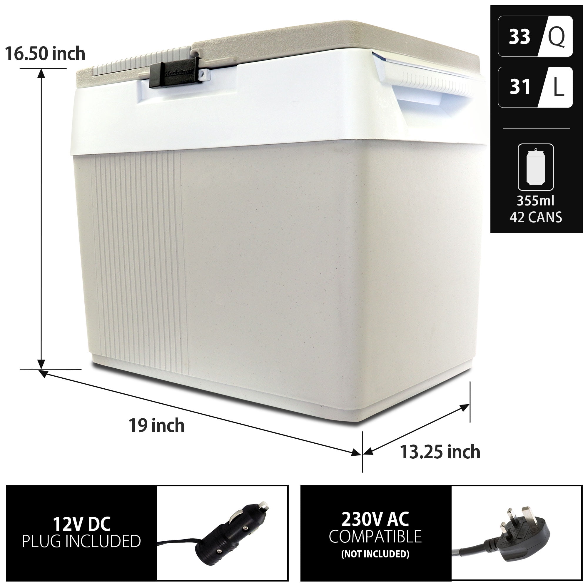 Koolatron’s Kargo Kooler features a versatile design that lets you use it as a classic ice chest or upright as a convenient mini fridge while the unique split lid allows easy access to contents even in a tightly packed vehicle. Advanced thermoelectric technology offers cooling or warmer functions in one unit and will not be affected by the movement of your vehicle, making this cooler the perfect choice for long road trips, family picnics, camping, or boating. Just pack your Koolatron Kargo Kooler with your family’s favourite food and beverages and plug into your vehicle’s 12V outlet for reliable iceless cooling or efficient warming. With a 31L capacity that can hold up to 42 standard cans, the Kargo Kooler has room for all your favorite drinks or snacks. And with the AC adapter (sold separately) you can seamlessly transfer the cooling power from your vehicle to the cottage, home, or hotel room.