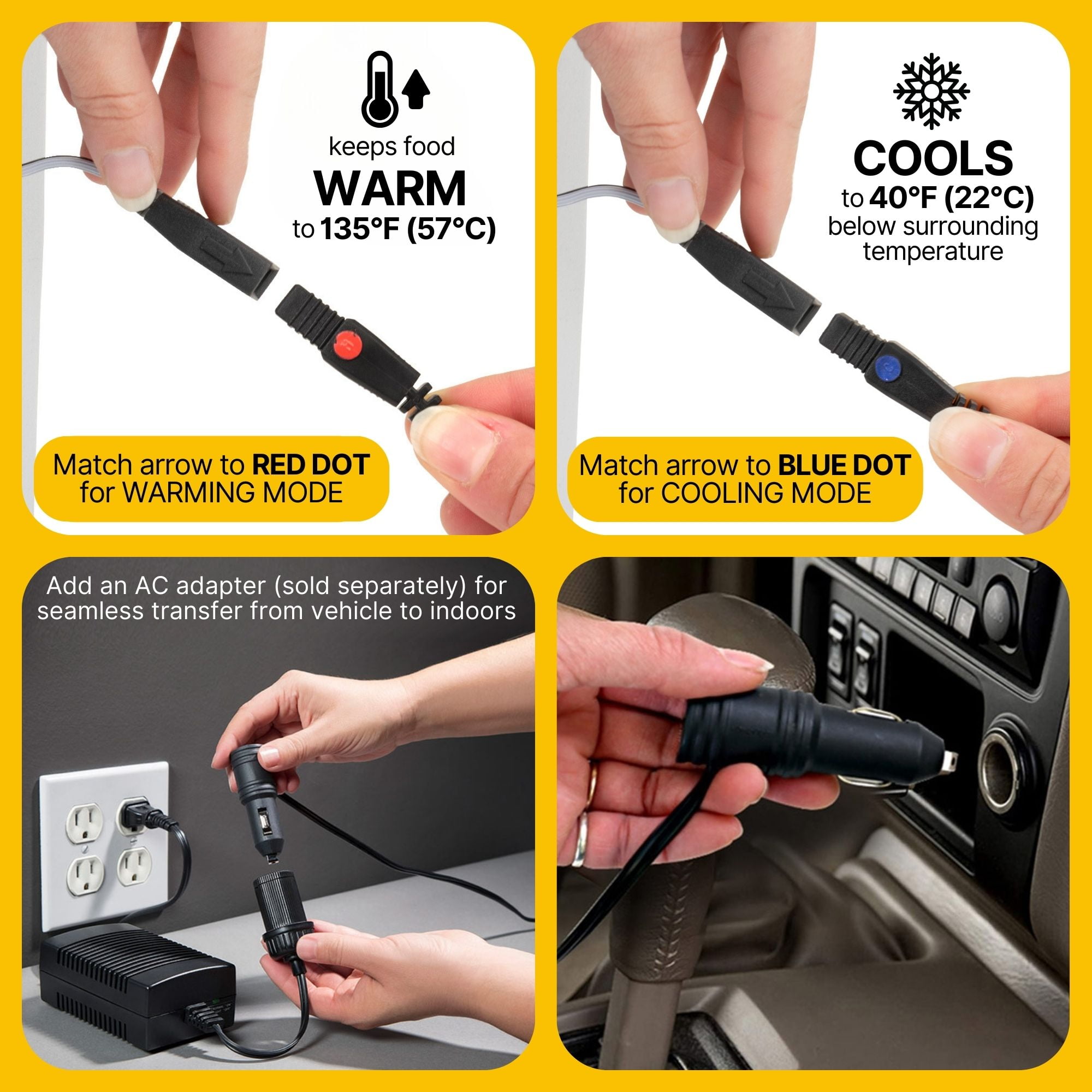 Cools to 40°F (22°C) below surrounding temperature or warms to 135°F (57°C) Can be used chest-style or upright as a portable mini-fridge Includes basket-style removable shelf/divider for easy organization Powered by included 12V DC cord (5 Amps/60 Watts) Compatible with 110V AC adaptor (sold separately) Strong magnetic latch prevents accidental opening Sturdy molded inset handles for easy carrying with no pinching Advanced insulation provides reliable temperature control Durable injection molded hard exterior and stain-resistant interior
