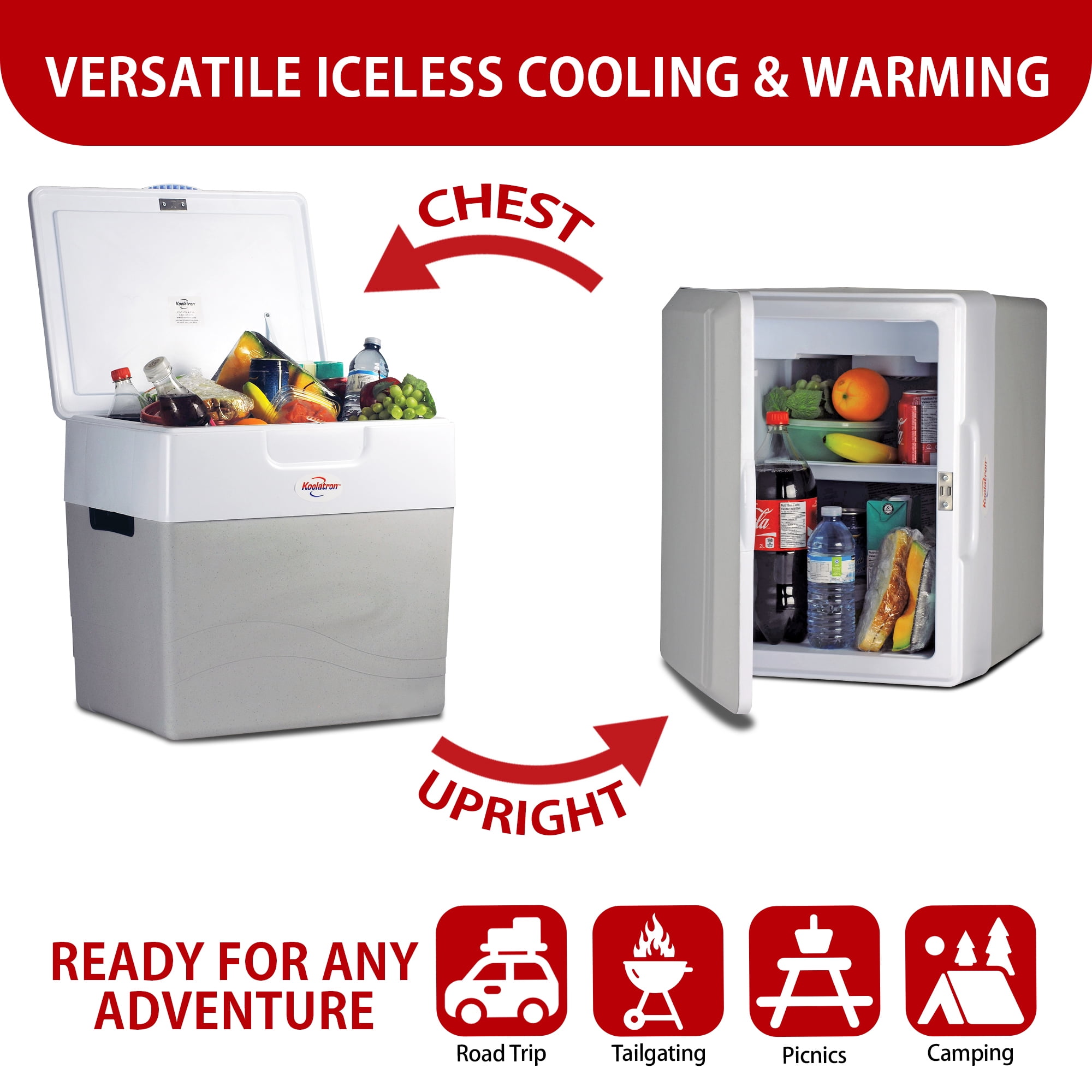 Cools to 40°F (22°C) below surrounding temperature or warms to 135°F (57°C) Can be used chest-style or upright as a portable mini-fridge Includes basket-style removable shelf/divider for easy organization Powered by included 12V cord and compatible with 110V AC adaptor (sold separately) Strong magnetic latch prevents accidental opening Sturdy molded inset handles for easy carrying with no pinching Durable injection molded hard exterior and stain-resistant interior Advanced insulation provides reliable temperature control Thermoelectric technology will not be affected by the movement of your vehicle