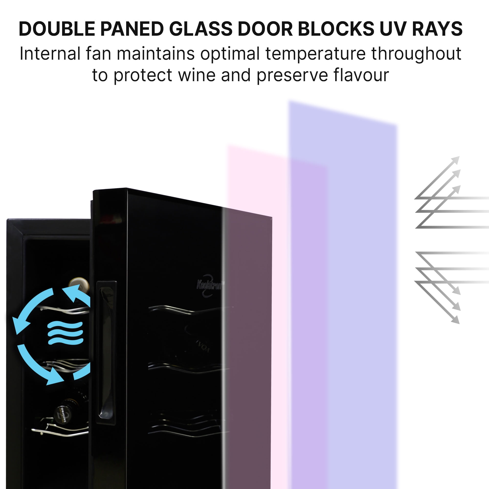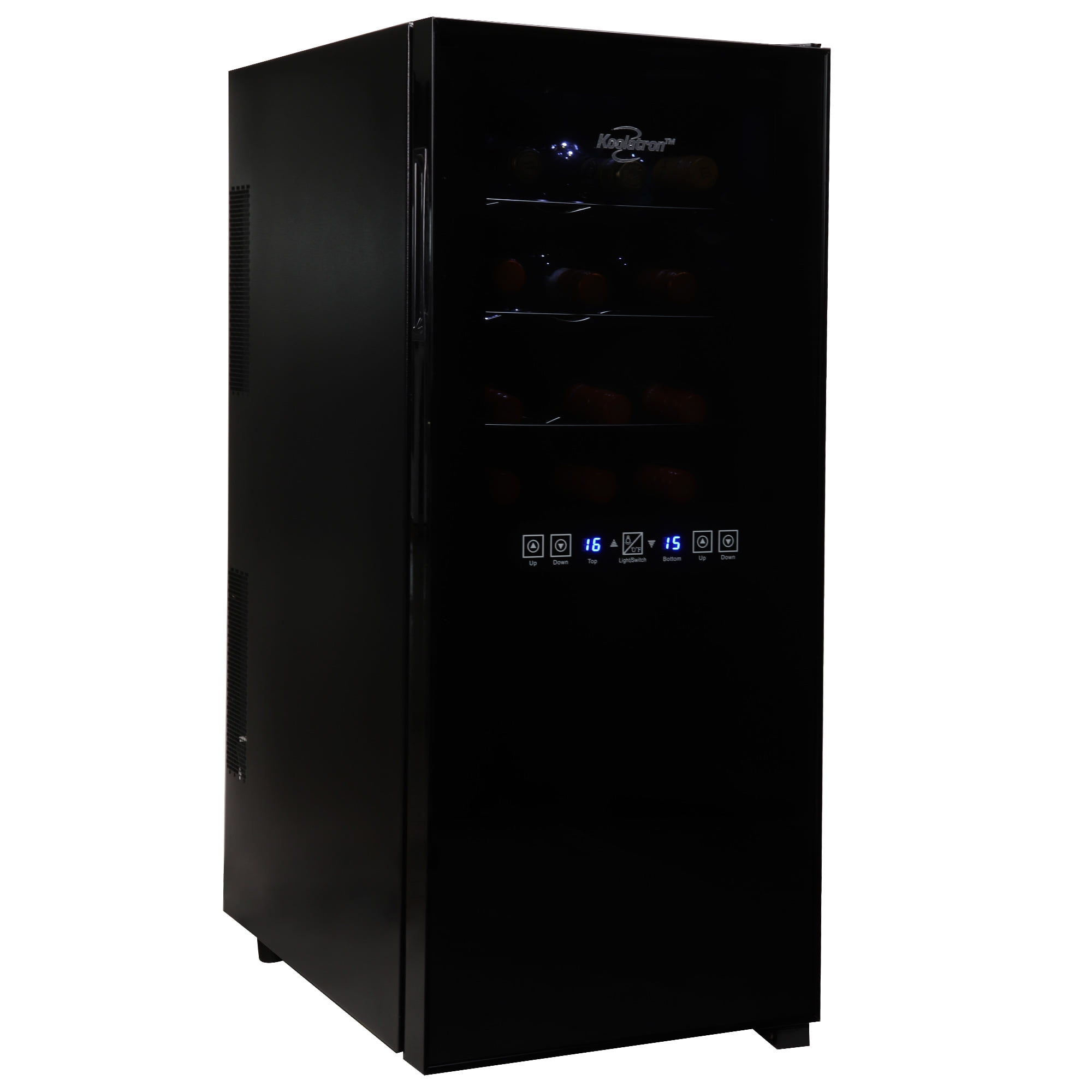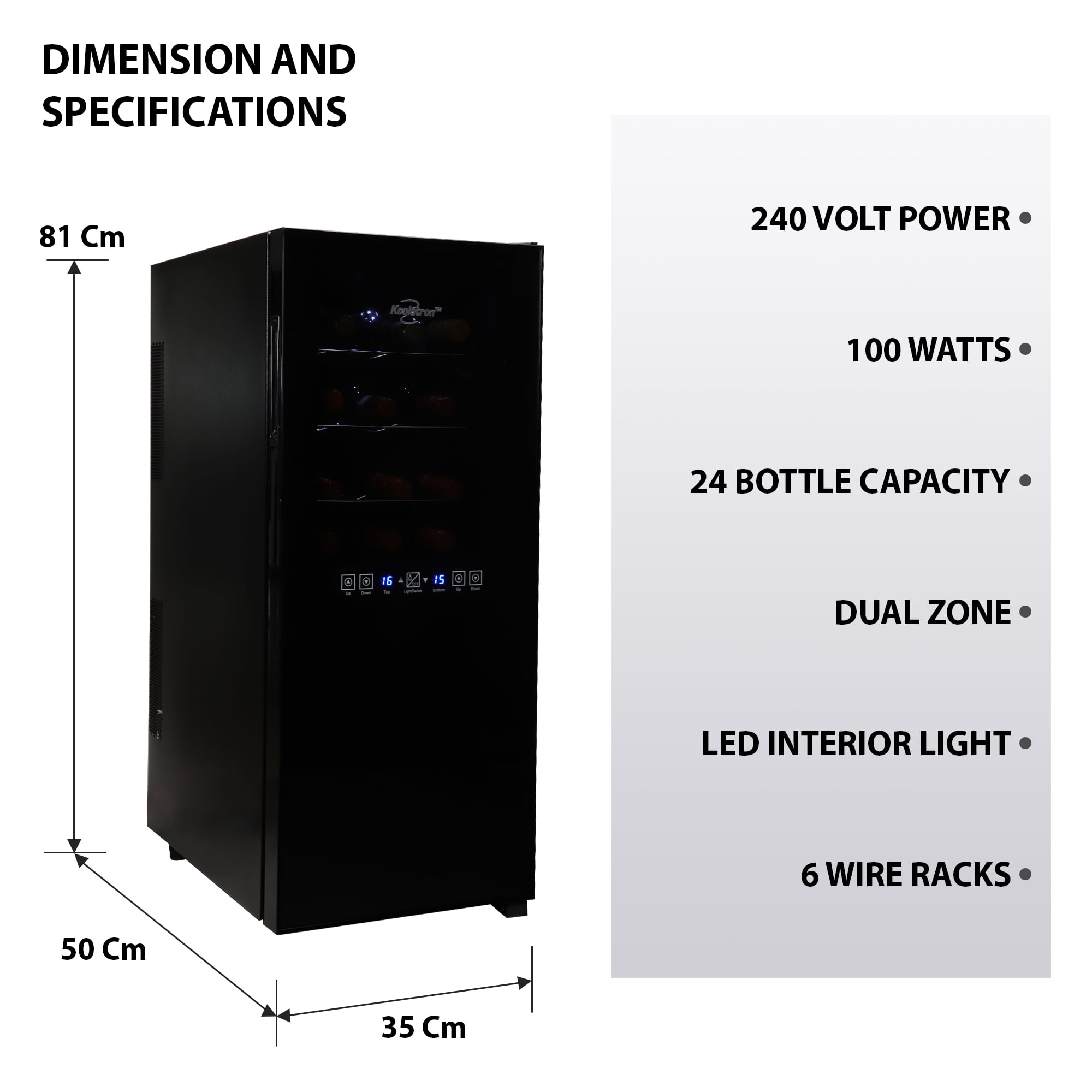 Efficient and reliable luxury wine storage: Koolatron®’s 24-bottle capacity freestanding wine cellar makes a stylish addition to any kitchen, office or condo with enough capacity for two full cases of wine. Separately controlled temperature zones provide the ideal climate for your red, white, and sparkling wines and the external control panel lets you view and adjust the temperature without opening the door. This compact wine cellar brings together functionality and style with a mirrored glass door that protects from UV rays and soft interior lights and removable wire racks which let you customize how to showcase your collection. Technology meets style in this elegant wine cooler: The Koolatron®Dual Zone 24 bottle unit lets you store up to 12 bottles of red wine in the upper zone at 54-66°F (12-18°C) and up to 12 bottles of white or sparkling wine in the lower zone at 46-55°F (8-12°C). Advanced thermoelectric technology cools efficiently with no noise or vibrations, keeping your wine at a consistent, ready-to-serve temperature with the sediment undisturbed. Why buy a dedicated wine fridge?: Experts recommend storing wines at higher temperatures than your typical refrigerator provides, especially for long term storage. Temperature variations can cause both the wine and the cork to expand and contract, which can allow oxygen to seep into the bottle and spoil your wine. Keeping wine in a climate controlled environment slows that aging process significantly, preserving the quality, color, aroma, and flavor of your wine.