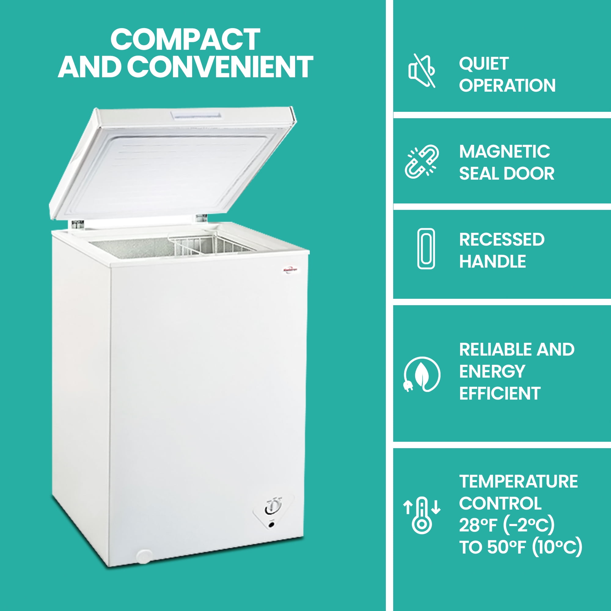 3.5 cubic foot compact freezer 99 Litres capacity chest freezer Freezer has a convenient stay-open lid that keeps both hands free Energy-efficient manual defrost design Keeps food fresher than self-defrosting freezers A hanging wire basket keeps small and commonly used items accessible Space-saving flat back and narrow footprint chest freezer Reliable compressor cooling with range 0°C to -24°C (32°F to -11.2°F) Front-access drain with leak-proof plug for easy defrosting and cleaning External thermostat control lets you adjust the temperature without opening the door Classic white exterior compact freezer suits any decor Ideal size for cottage, apartment, or condo