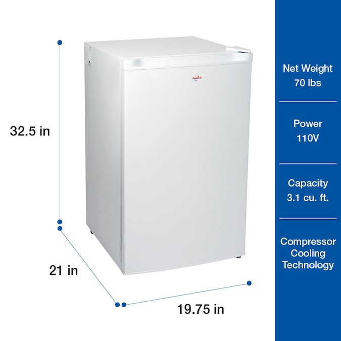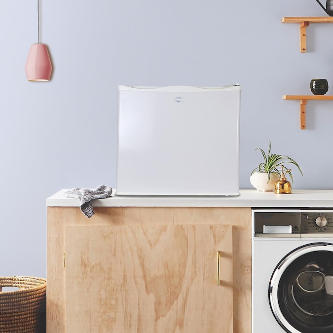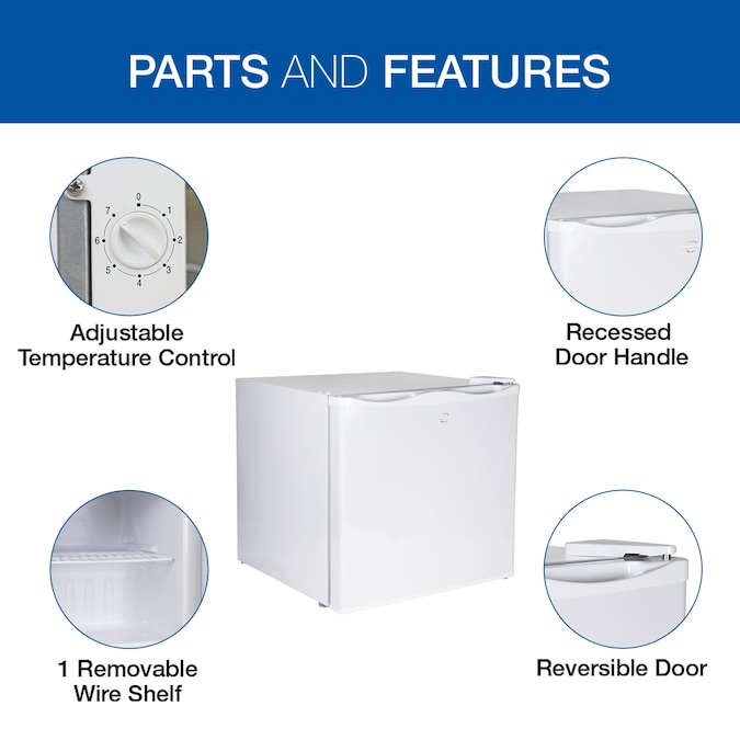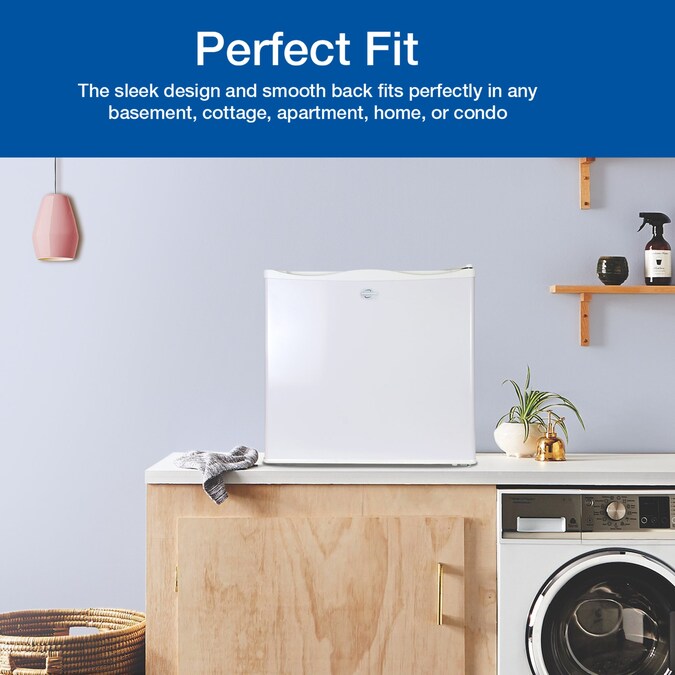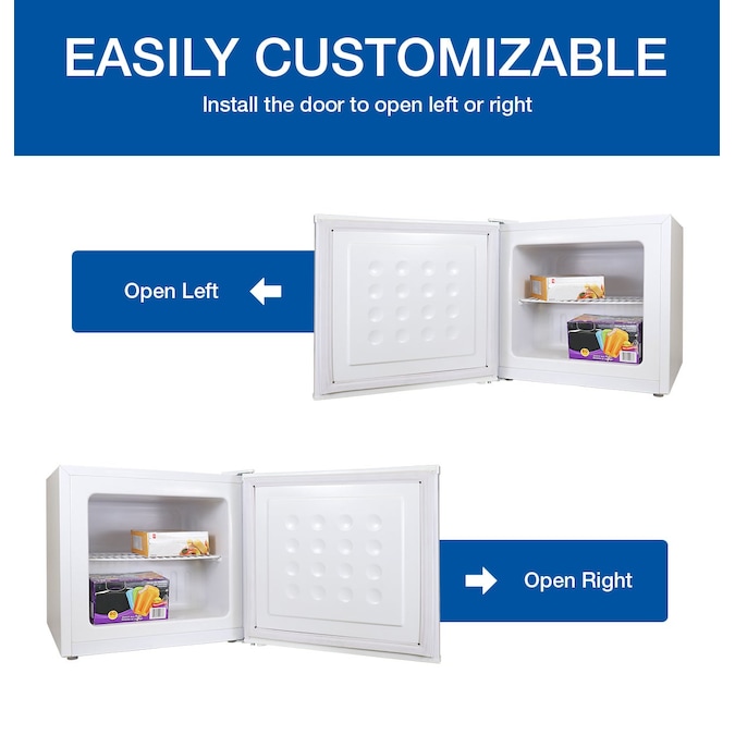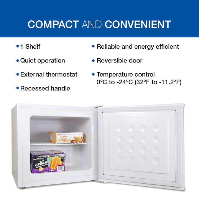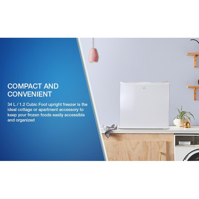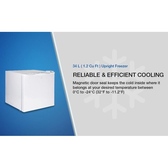 This compact 34 L/ 1.2 Cubic Foot upright freezer is ideal for small office or apartment kitchens. It features wire shelving to keep small items readily accessible and a door that easily installs left or right to fit your space. The reliable, efficient compressor cooling system keeps contents between 0°C and -24°C (32°F and -11.2°F) and magnetic door seal keeps the cold inside where it belongs.