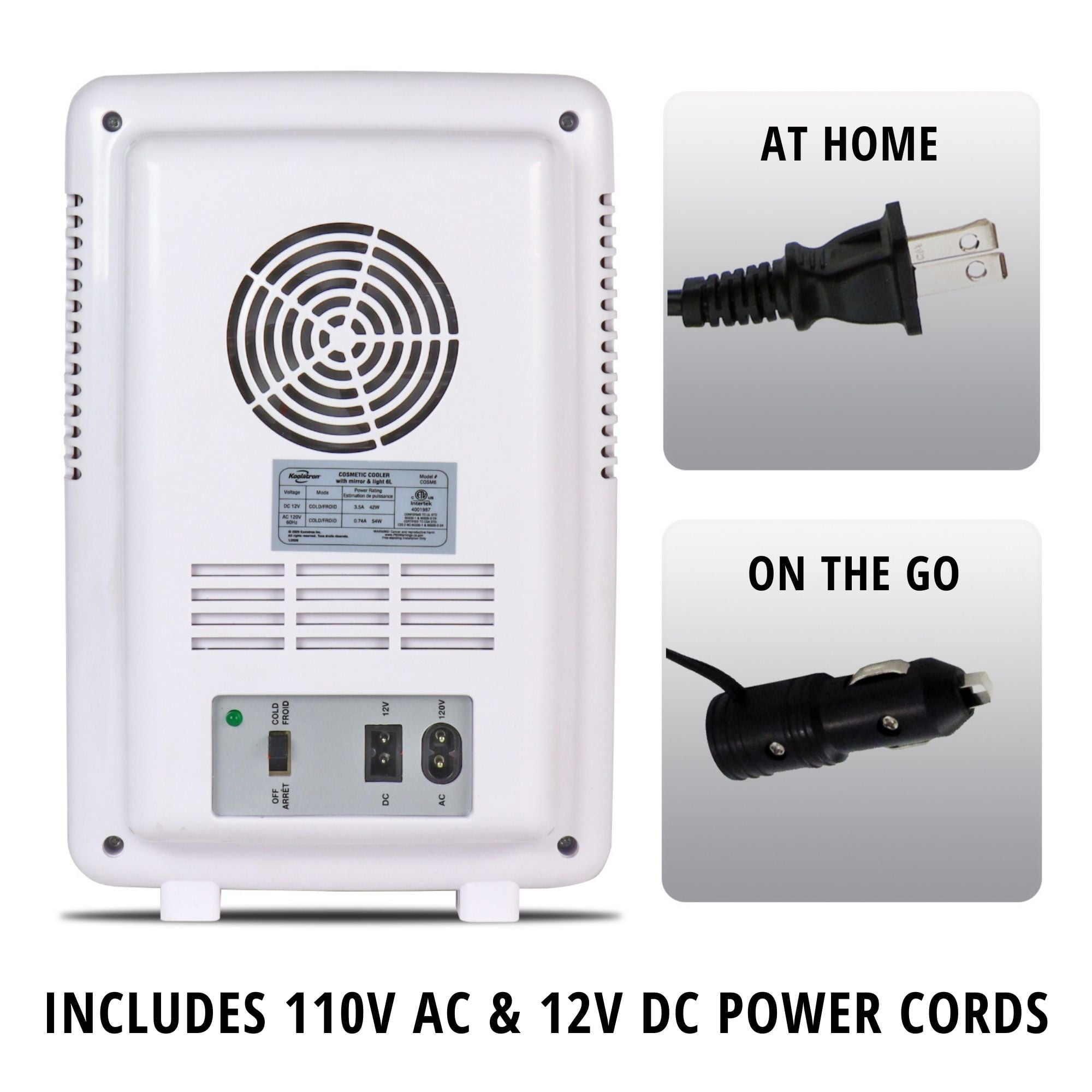 Store, transport, and apply your cosmetics at home or while traveling with one convenient AC/DC-powered device. This lightweight, portable cosmetic fridge does double-duty: Its mirrored door includes dimmable LED lighting so you can apply your makeup perfectly every time. Extend the life of your fine cosmetics and quality skincare products by keeping them refrigerated and feel like every day is a spa day when you apply them! Minimize opening and closing and ensure the door is closed properly The lowest possible temperature depends on surrounding temperature To avoid draining your vehicle’s battery when using 12V mode, only run cooler when the engine is on