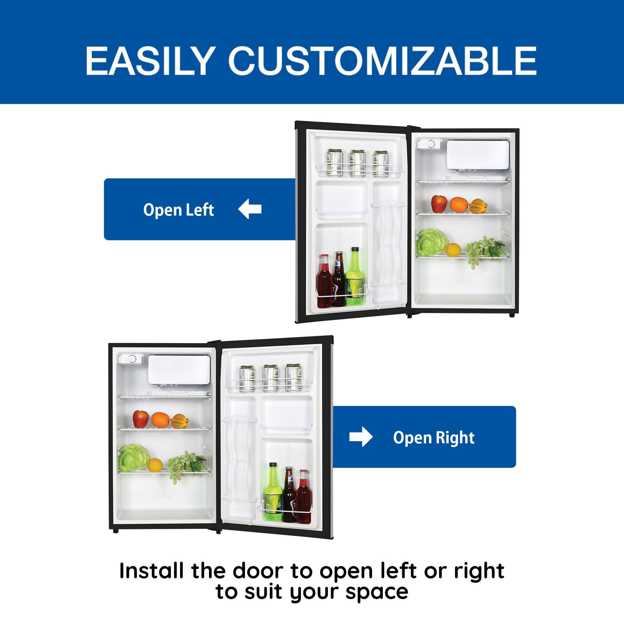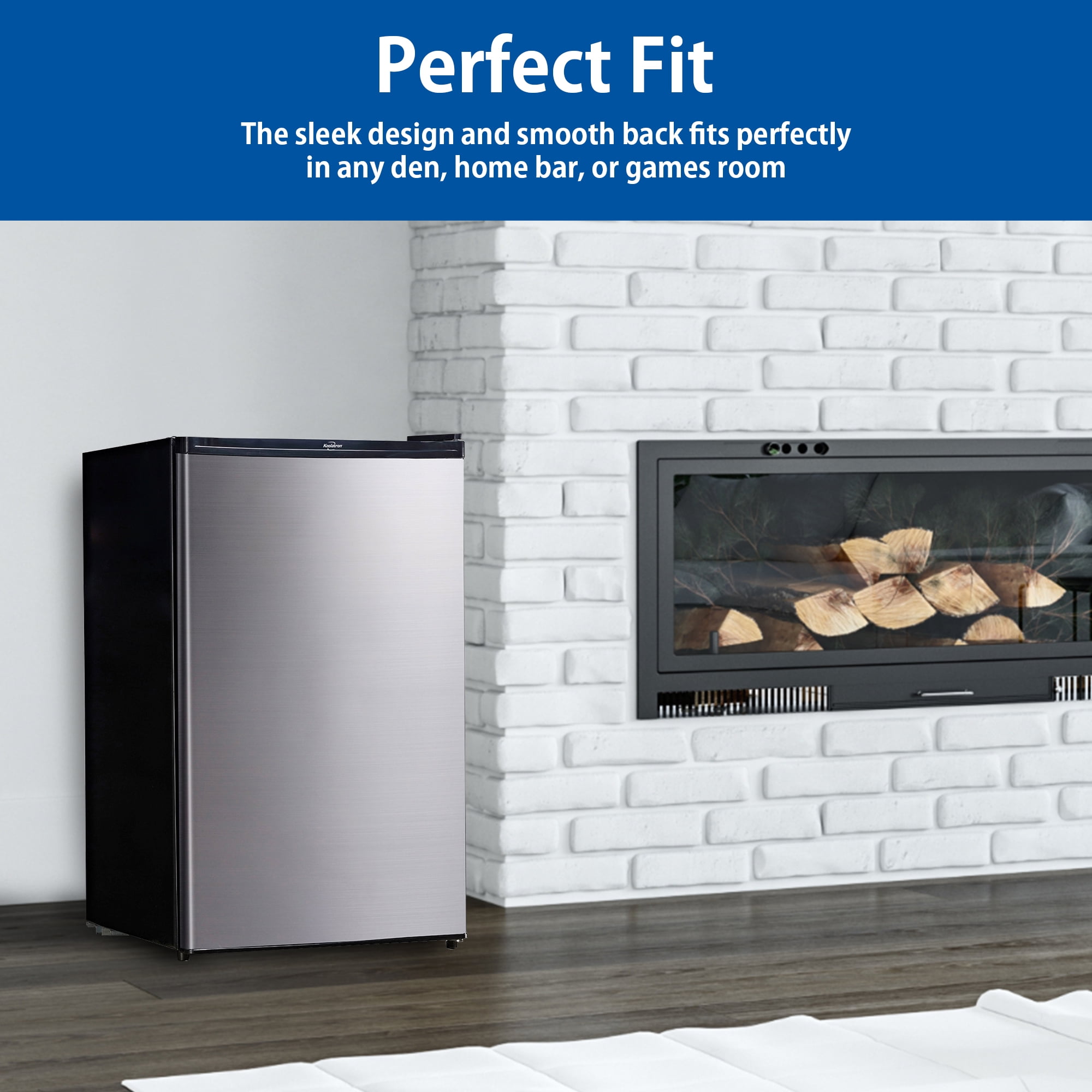 Compact 124 L/ 4.4 cu ft mini fridge with freezer compartment features a contemporary stainless steel exterior with black accents and plenty of door storage. Efficient, reliable compressor technology keeps contents at your desired temperature between 28°F (-2°C) and 50°F (10°C) so you can keep all your favorite snacks, soda, and beer right at hand in your den, office, dorm, home bar, or games room. Koolatron Stainless Steel Compact Fridge with Freezer 4.4 Cu Ft (124L) Refridgerator