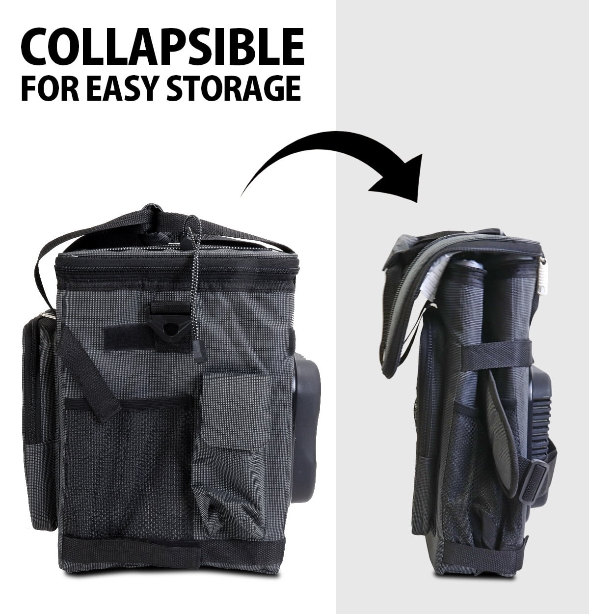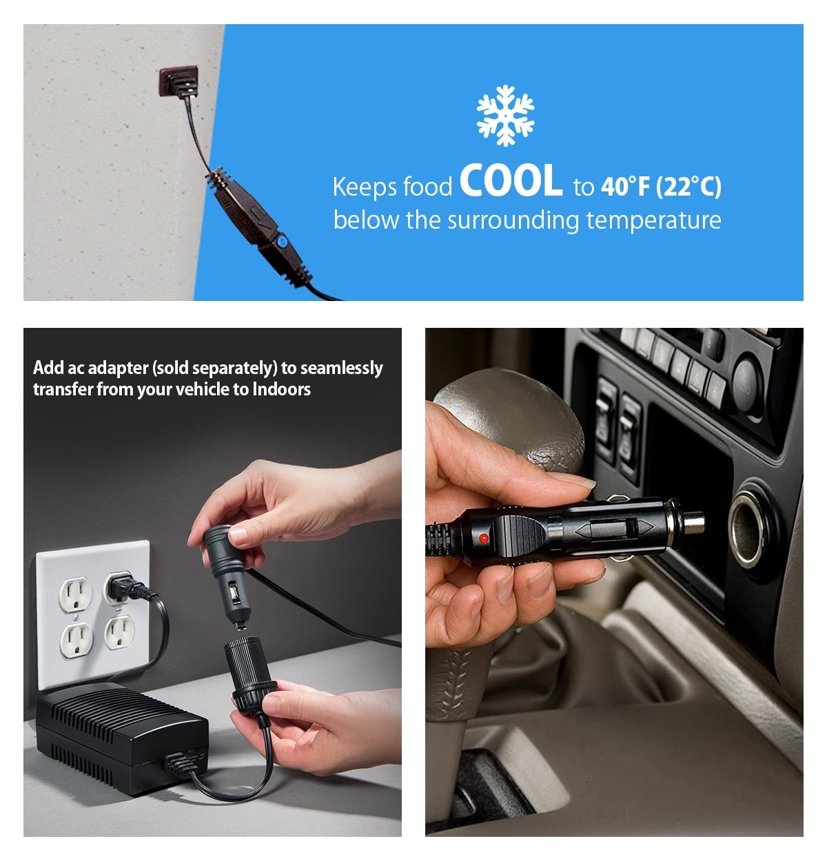 Cools to 40°F (22°C) below surrounding temperature Dual carry handles and adjustable padded shoulder strap Exterior pockets and bungee ties for easy organization Powered by included 12V cord Compatible with AC adaptor (sold separately) for indoor use Empty cooler collapses for space-saving storage Built-in cord storage compartment Stain-resistant interior is easy to clean Reliable & efficient thermoelectric technology will not be affected by the movement of your vehicle Save time and money by bringing your own snacks and drinks to work or on day trips