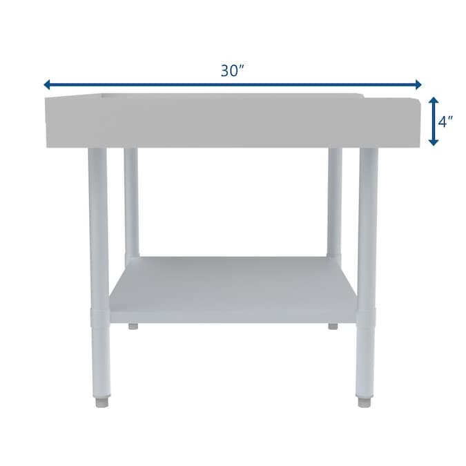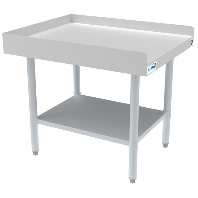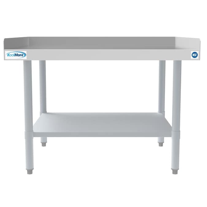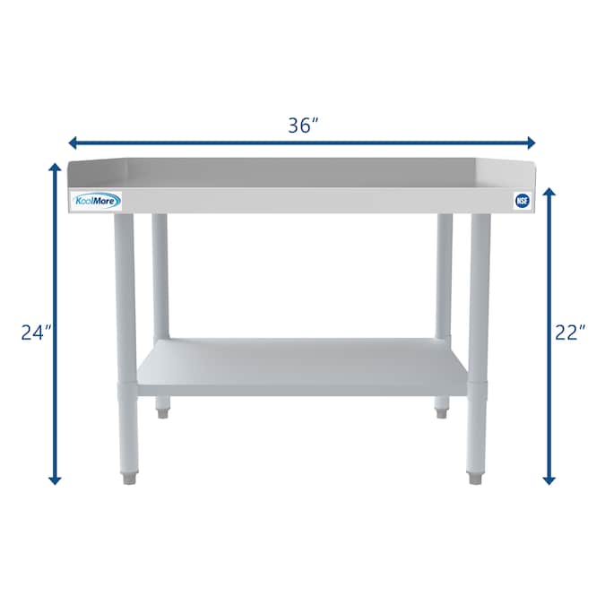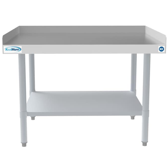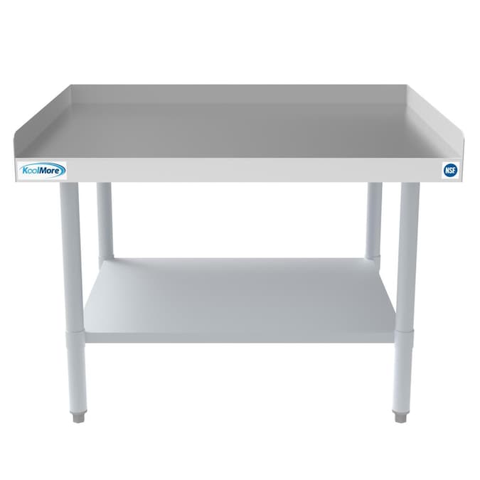 The KoolMore equipment stand is built with 16 gauge heavy duty stainless steel it is durable and sturdy and has a weight capacity of 792 Lbs. It can accommodate all types of commercial equipment from griddles to ice machines, charbroilers beverage dispensers, slushy machines, Espresso machines, or mixer. The galvanized steel undershelf has a weight capacity of 583 Lbs. and is extremely useful for keeping supplies or ingredients at arm’s reach, it is also adjustable so that you can raise or lower it depending or your particular needs. NSF certification means this table can safely be used in all types of commercial kitchens. Adjustable bullet feet ensure the best possible stability for your valuable equipment. The 2-inch edging will protect your equipment and supplies from slipping off the table, the stainless steel look is super sleek and easy to clean. Overall dimensions 36”L x 30”W x 24