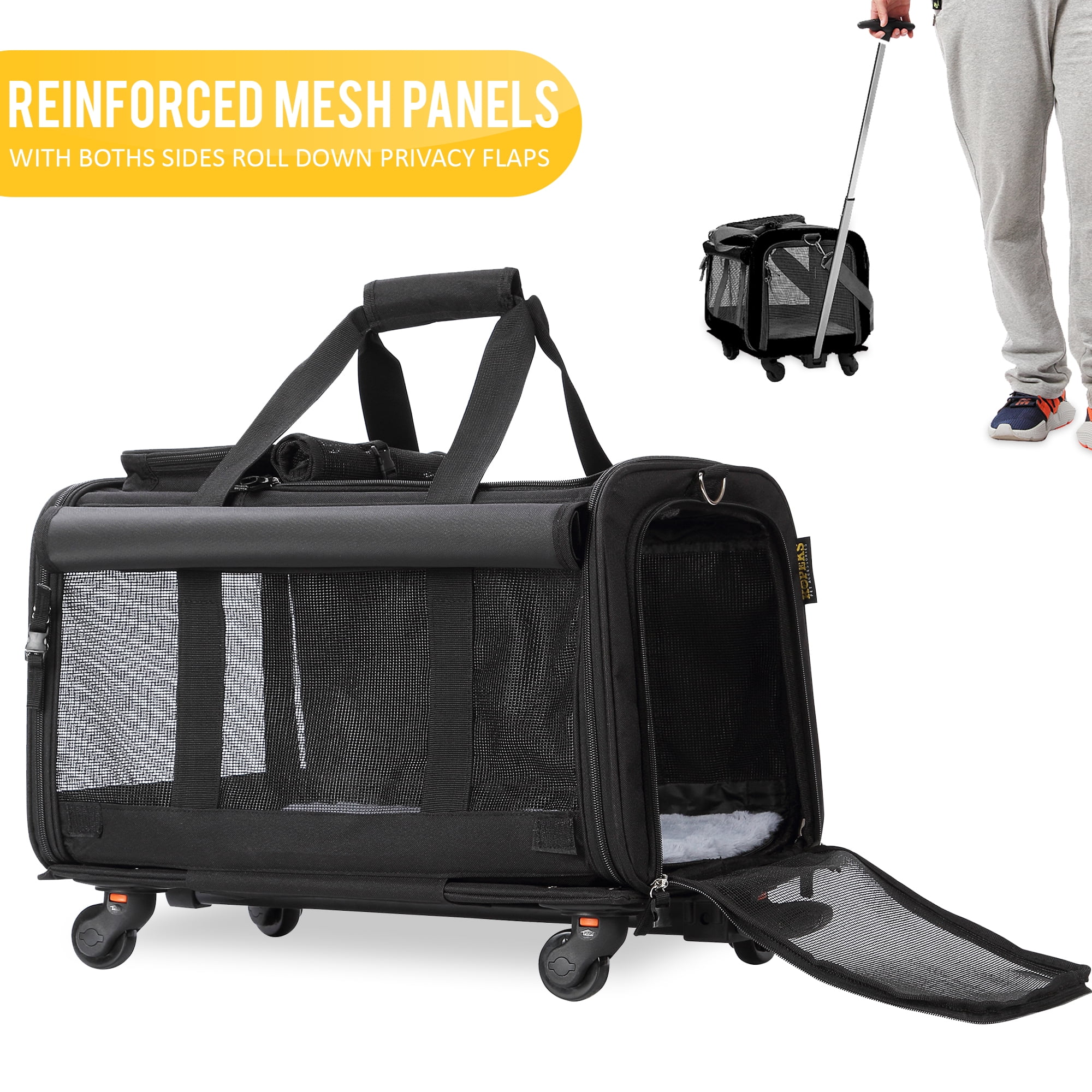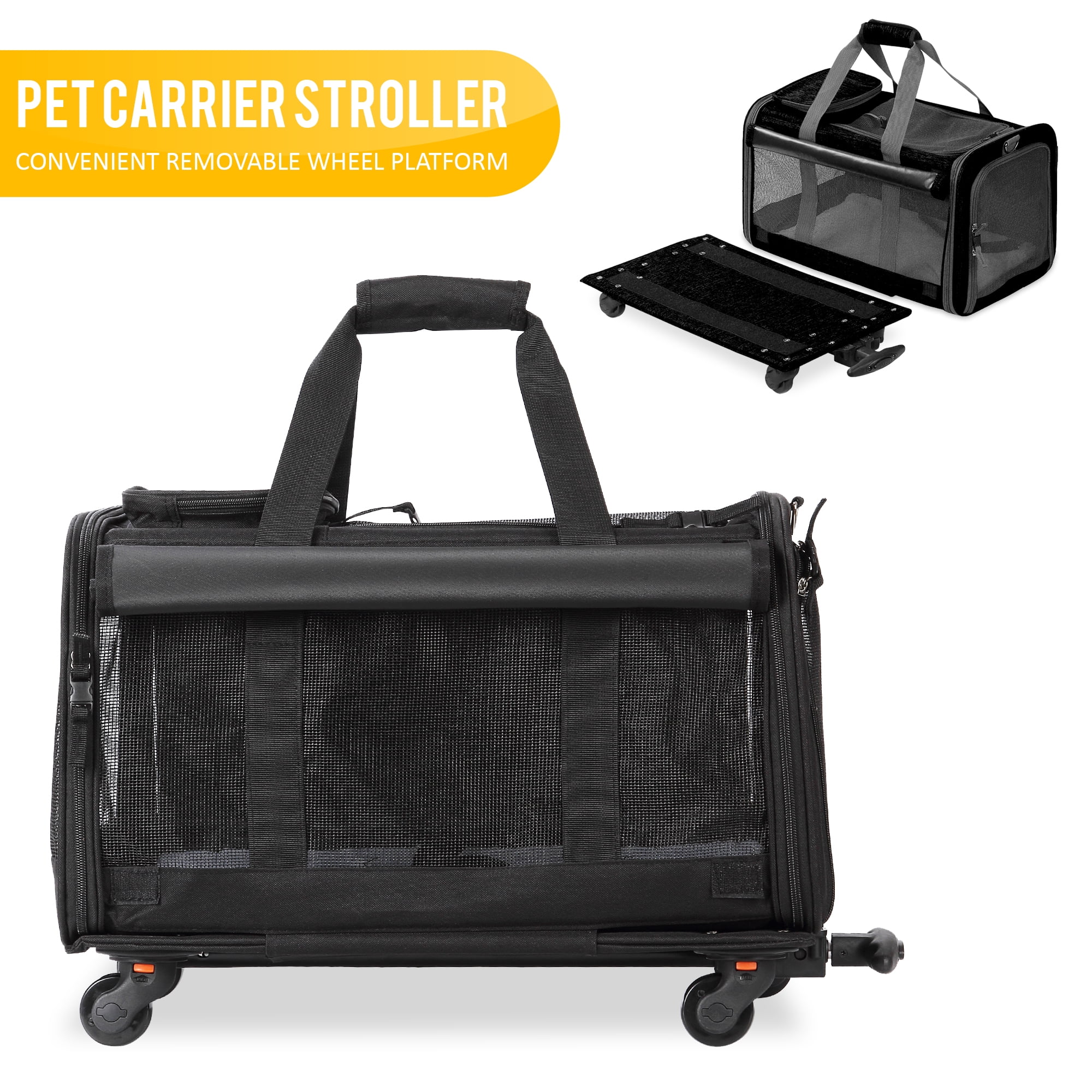 Take your furry friend along for the ride with the KOPEKS Pet Carrier With Wheels For Dogs and Cats. This easily transportable carrier is made from durable 600 denier black oxford fabric to withstand rugged traveling conditions, designed with mesh panels all around for easy visibility and steady, cooling air flow. The dog travel bag also has zippered openings at the ends and the top for easily loading and removing your pet. A large pocket top pocket makes it easy to bring treats and other animal care essentials with you wherever you roam. The dog carrier bag features a travel-friendly design, outfitted with a telescoping handle and polyurethane wheels. A shoulder strap and additional handle empower even easier carrying; the platform attached securely to the bag with Velcro, so it can be converted from a bag to a stroller with ease.