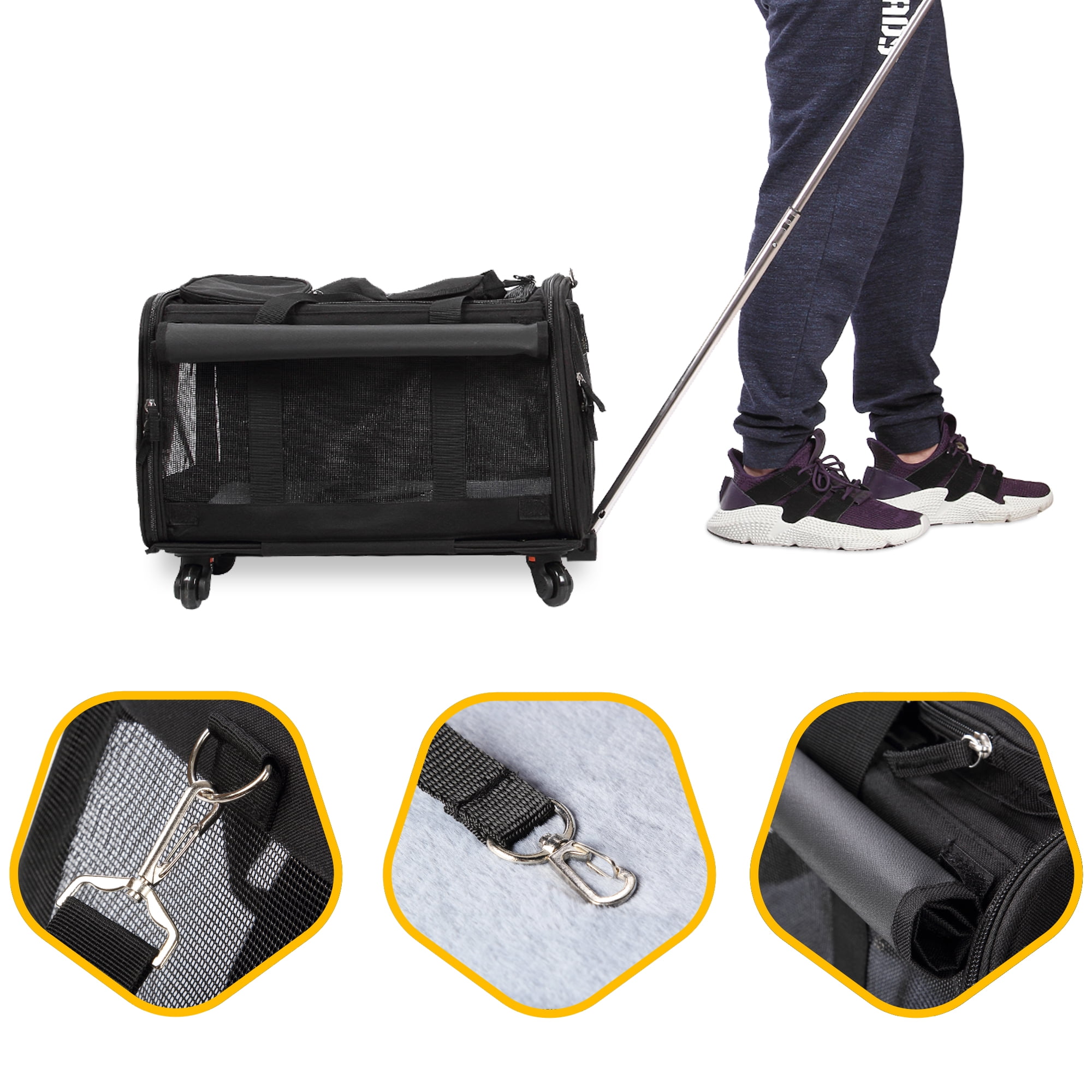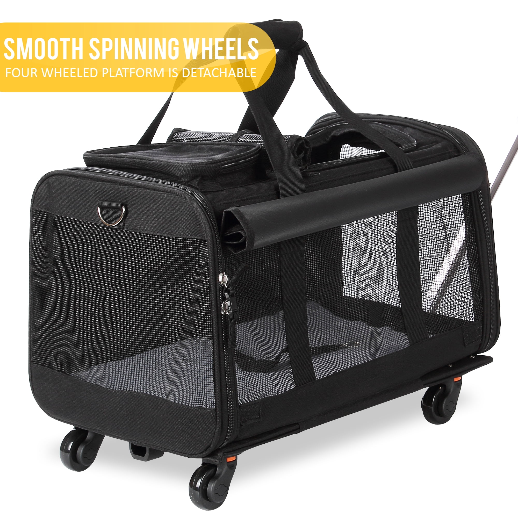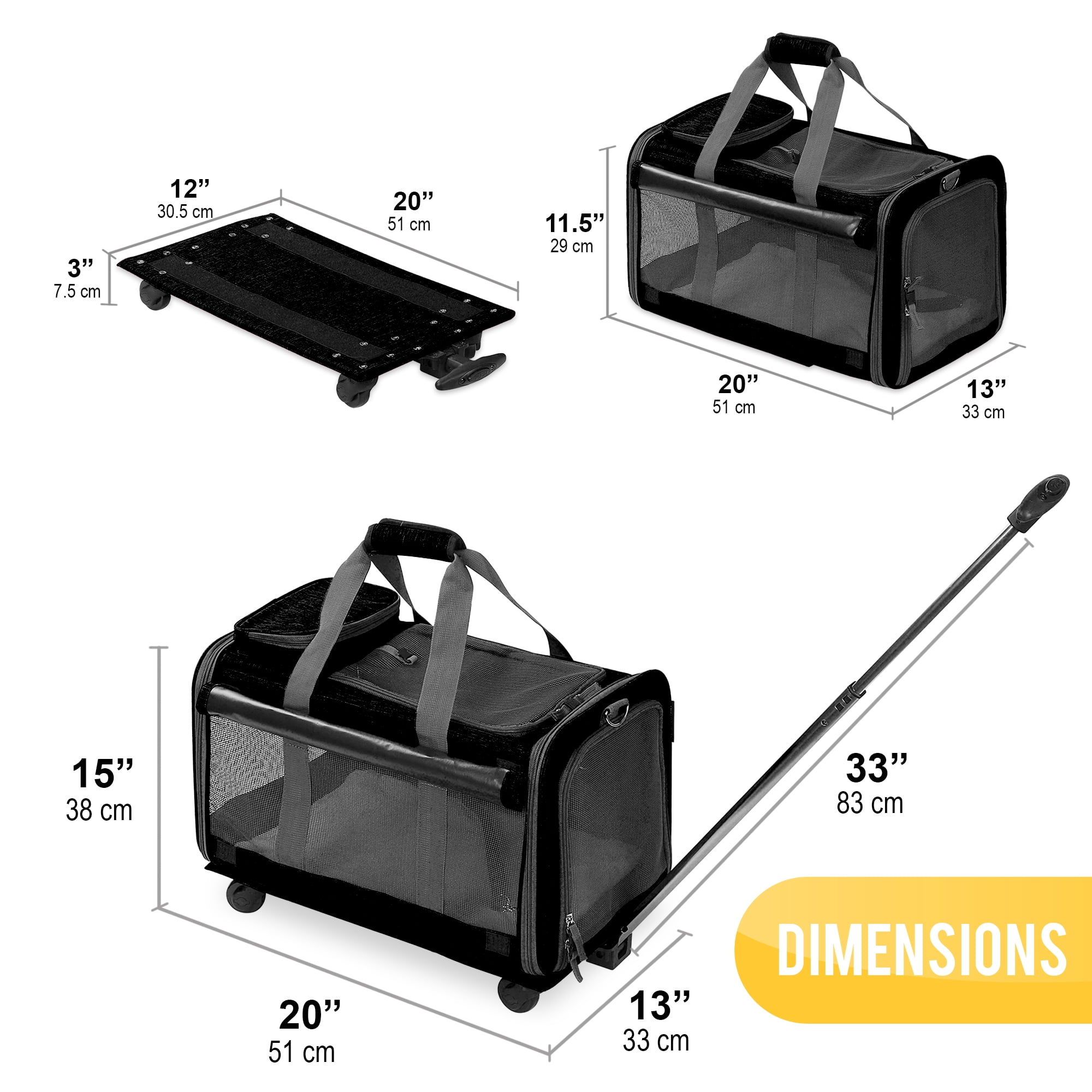 KOPEKS Pet Carrier For Dogs and Cats Travel Bag with Detachable Wheels – Black: Durable, heavy-duty materials Carrier: 600D oxford fabric with 4 ventilation mesh panels that provide a cool environment and easy visibility Telescoping handle made with industrial grade aluminum alloy rods for steering and control: High-quality polyurethane double wheels provide extra stability and durability Lots of storage: 1 large pocket is convenient for safely storing the stuff your pet can never be without 3 different ways to carry: a telescoping handle, a shoulder strap and a handle provide 3 easy and convenient carrying solutions for different everyday needs Pet carrier/stroller: a removable platform with 4 wheels and a telescopic handle easily converts the dog carrier bag into a stroller Platform is securely attached with high grade Velcro Zippered top and front and back ends Dimensions: 20″L x 13″W x 11.5″H Please see product images for more detailed dimensions