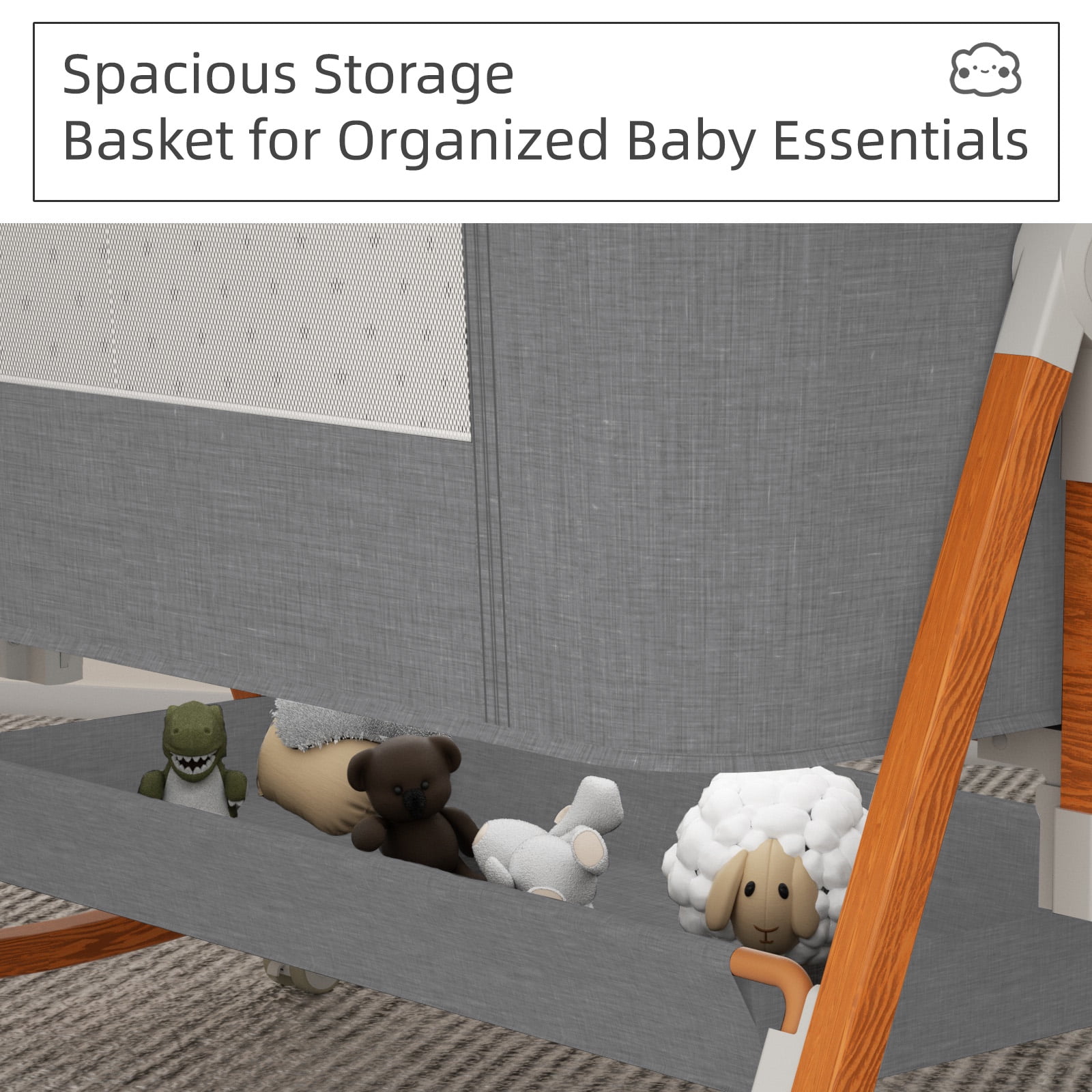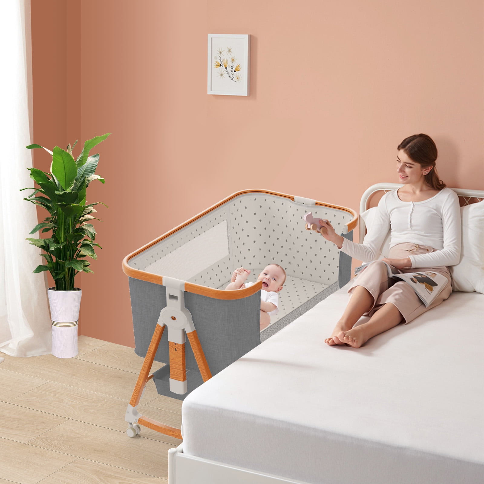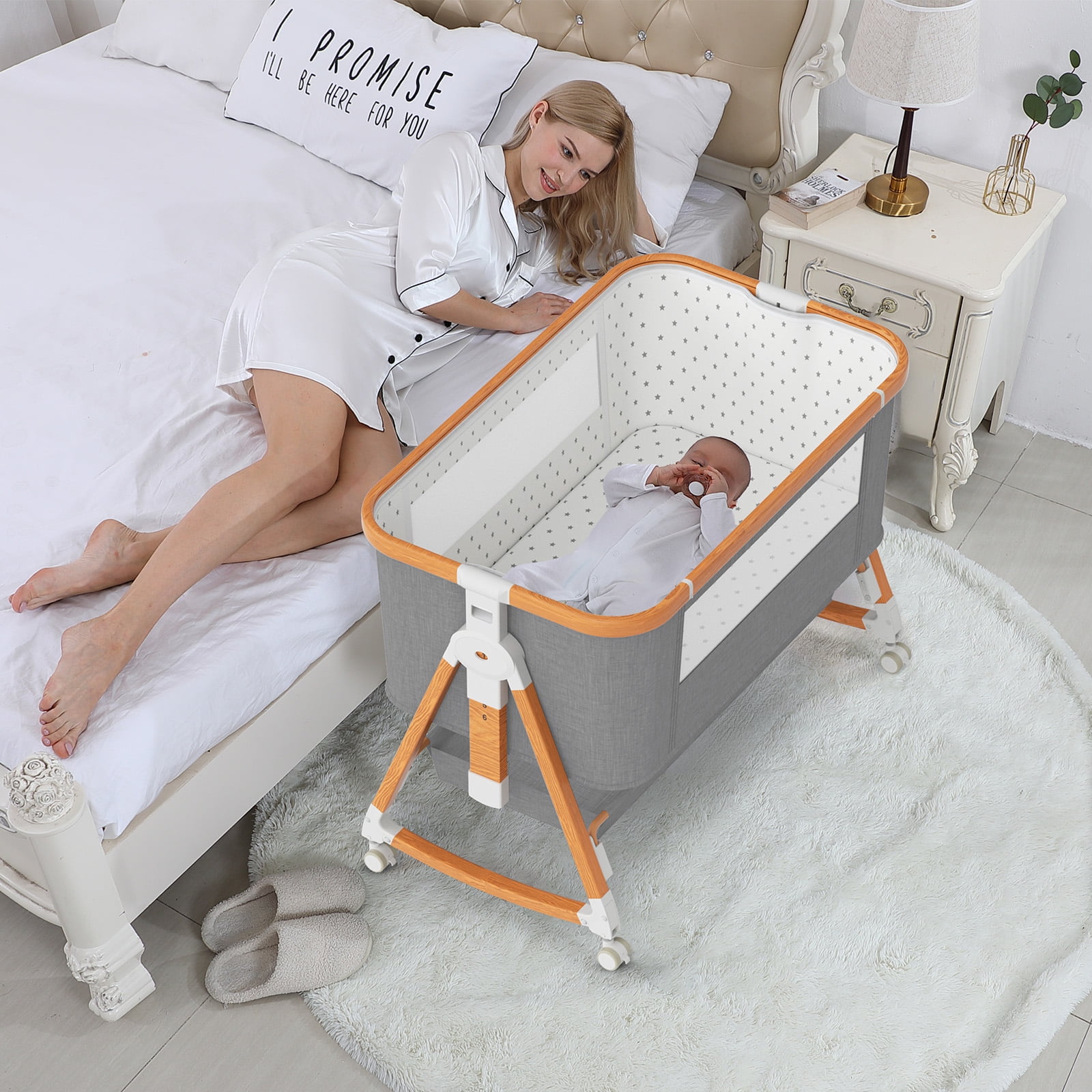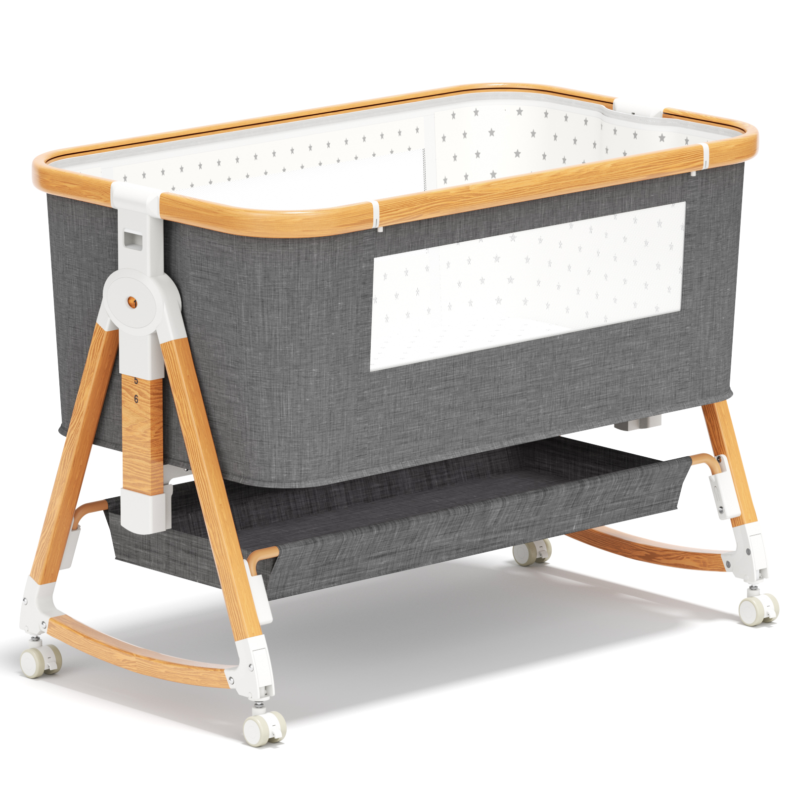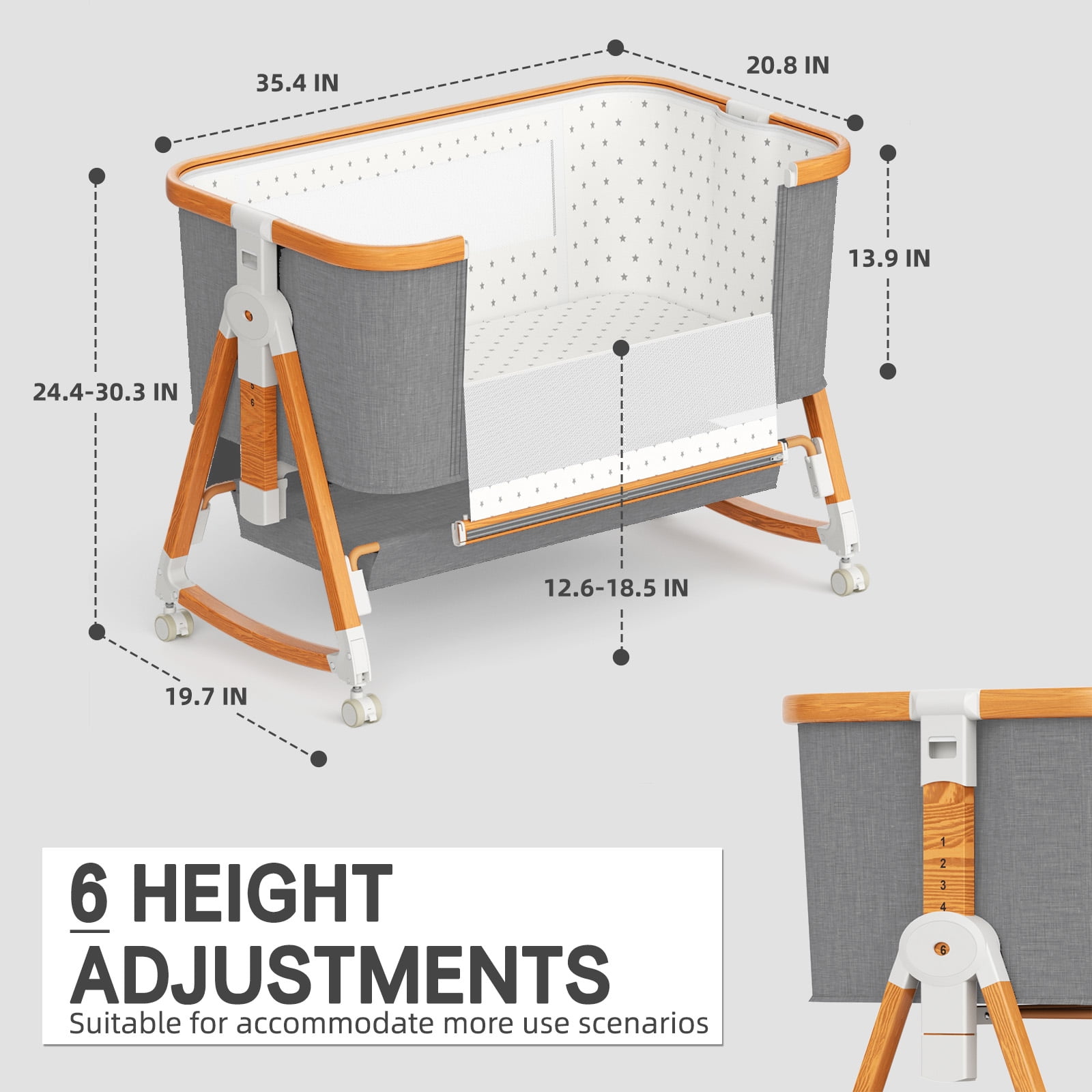 【4 in 1 Baby Bassine】KORIMEFA Unisex baby beside bassinet sleeper can be used as bedside sleeper, baby bed with mosquito net,independent cradle,tilting bed for nursing.You can easily push the crib anywhere and lock the wheels to keep the baby safe. 【Storage Space Design】We design a large storage space for the baby bassinets bedside sleeper.Parents can put commonly used baby stuffs inside, never fear of forgetting. Side pockets allow you to put in and take out more easily. 【Height Adjustable】Two different height positions, parents can easily adjust the height to suit adult bed height by adjusting the button. Unzip the side zip it immediately change into bedside mode. 【Breathable mesh material】Mesh sides provide lots of breathability and visibility to baby, allows baby to be as close to you as possible while sleeping in their own comfortable space in the bedside bassinet. 【Tool-Free Assemble】Easy to assemble and use, adults can be assembled in 10 minutes without using any tools. 【Safety First】 Rest easy knowing that our KORIMEFA Baby Bassinet is designed with a firm and flat sleeping surface, meeting or exceeding all safety standards set by the U.S. Consumer Products Safety Commission. Your baby’s safety and well-being are our top priorities.