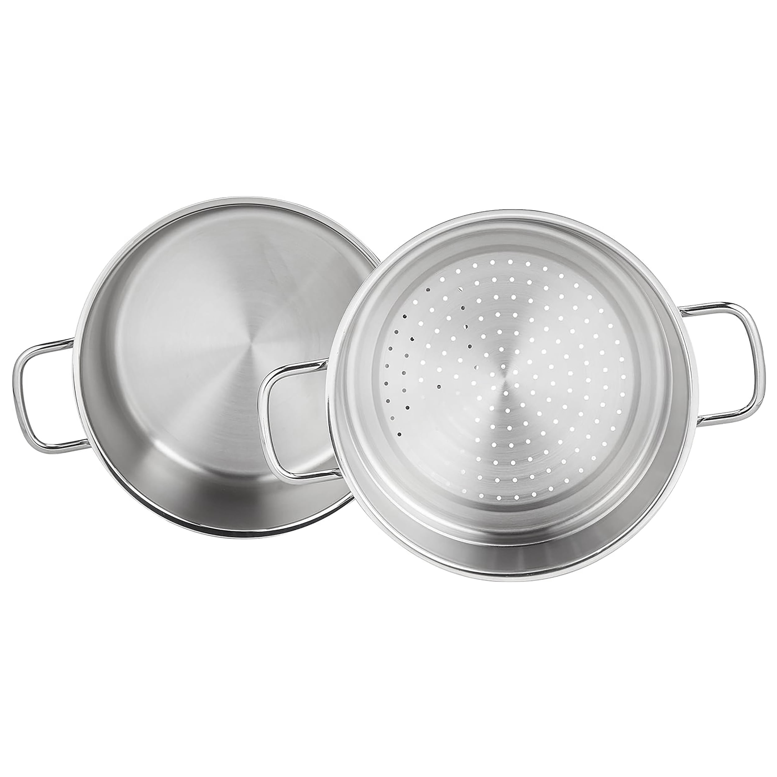 Set: 3 Piece Steamer Set Ergonomic, Stay Cool Handles Heavy Bounded Capsule Bottom Mirror Polish Exterior Set Includes: One 6.9 L Casserole One 5.2 L Steamer One Glass Lid Per Item Measurements: Casserole- 13.8″ length, 10″ diameter, 6″ height, 6.9 l capacity, 3.25 lbs weight Steamer- 13.8″ length, 10″ diameter, 4.5″ height, 5.2 l capacity, 1.85 lbs weight Lid- 10″ diameter, 3″ height, 1.3 lbs weight Material: 18/10 Stainless Steel Color: Silver Shape: Round Dishwasher Safe High Tempered Glass Lid