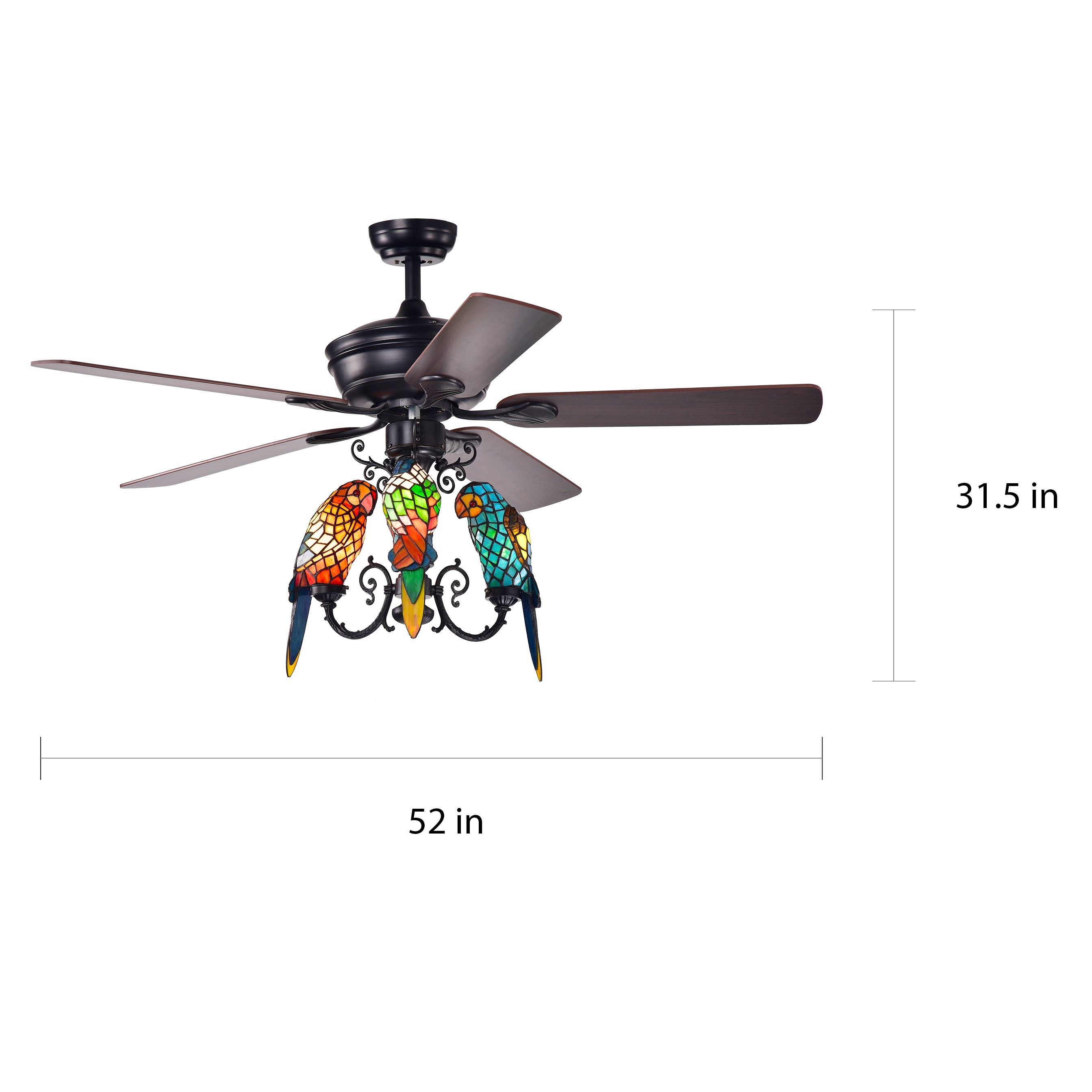 Create a unique atmosphere in your home with this delightful ceiling fan, featuring three Tiffany-style parrots acting as shades for three light bulbs. The five wooden blades circulate air throughout your room, and three speeds are available through the included remote control. The motor is also reversible to keep you warm in the winter and cool in the summer. Features: Remote controlled Made of iron, wood, and Tiffany-style glass Forged black iron finish 5 wooden blades Blades are reversible (red walnut to black walnut) 3 lights Tiffany-style parrot shades Requires 3 E12 bulbs (not included) Forward/reverse 3-speed motor Speeds are 173 RPM, 113 RPM, and 62 RPM Assembly and installation required Dimensions: Overall: 52 inches in diameter x 31.5 inches high Motor size: 6 inches in diameter x 0.6 inches high Motor house size: 11.8 inches in diameter x 10.2 inches inches high Downrod Lengths: 5.1 inches / 9.8 inches (max) Shade: 16.5 inches in diameter x 15.7 inches high Blade Length: 20.5 inches Blade Width: 5.4 inches (head); 4.7 inches (tail) Blade Thickness: 0.2 inches Blade Pitch: 12 degrees Canopy: 5.9 inches in diameter x 2.25 inches high Note: This product requires a Professionally Licensed Electrician for installation.