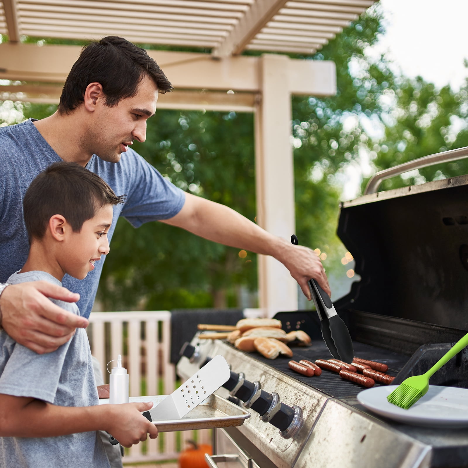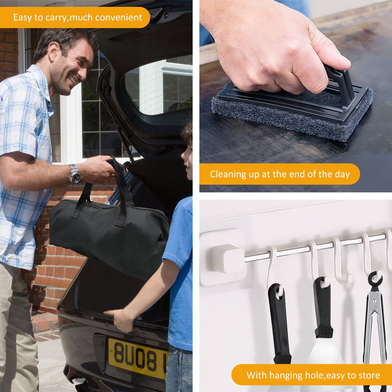Features: Package Includes: [High Quality Stainless Steel] Compared with other ordinary barbecue tools,our flat top grilling accessories kit are made of thicker stainless steel,so you can enjoy your BBQ grill,no worry about bending, breaking or rusting.And the plastic handle with hanging hole,easy to store,high heat resistant and not easy to slip. [15 Pieces Griddle Accessories] Professional griddle accessories set has all the grill tools you need,including 2 oversized spatula,1 regular sized spatula,1 hamburger turner,1 grill scraper,1 scraper chopper,1 basting cover,1 grill tongs,2 egg rings,2 sauce bottles,1 basting brush,1 cleaner brush and 1 carry bag. [Professional and Convenient] Long grill spatula can move large amounts of food quickly and accurately.scraper & chopper to dice food and scrape griddles clean.egg rings can shape your eggs in round or love-shaped that is more delicate.basting cover helps to reduce cooking time and splatter.turner is great for pancake flipper, fish, burgers, omelet & more. [Great Gift Choice] With beautifully designed gift box and carry bag, which is a great grilling gifts for men and women on birthday,fathers day,mothers day,thanksgiving or Christmas day and all other festivals,backyard BBQ grill griddle. [All Tools In One Bag] Outdoor Camping BBQ grill with our 15pcs bbq accessories kit and you will not need any other tools for cooking.dishwasher safe for quick and easy clean up.with handy carry bag to help you take all the tools for every cooking occasion. Food grade stainless steel,hold and flip more food at one time, more pressure without bending. Spatula with holes can helps drain excess grease or oil off of cooked meat when taking off of griddle. Anti-leakage lid design on the top,can prevent spillage and leakage,and the lid is linked to the bottle,no worry about losing it. Provides a great hand feeling and easy control,heavy duty and sharp blade used to chop, flip and scrape food directly while cooking. Easy to use,makes oil splattering down to a minimum, retains the heat and allows cheese to melt quickly. Locking mechanism keeps bbq tongs slim, secure for easy storage in drawers or utensil holders when not in use. Good for cutting cookie dough,precise measurement units,for your home kitchen or backyard barbecue. The basting brush make of food grade silicone,bpa-free,easy to use low carbon and lead free odourless. 2 * Oversized spatula 2 * Egg rings 2 * Sauce bottles 1 * Regular sized spatula 1 * Hamburger turner 1 * Grill scraper 1 * Scraper chopper 1 * Basting cover 1 * Grill tongs 1 * Basting brush 1 * Cleaner brush 1 * Carry bag