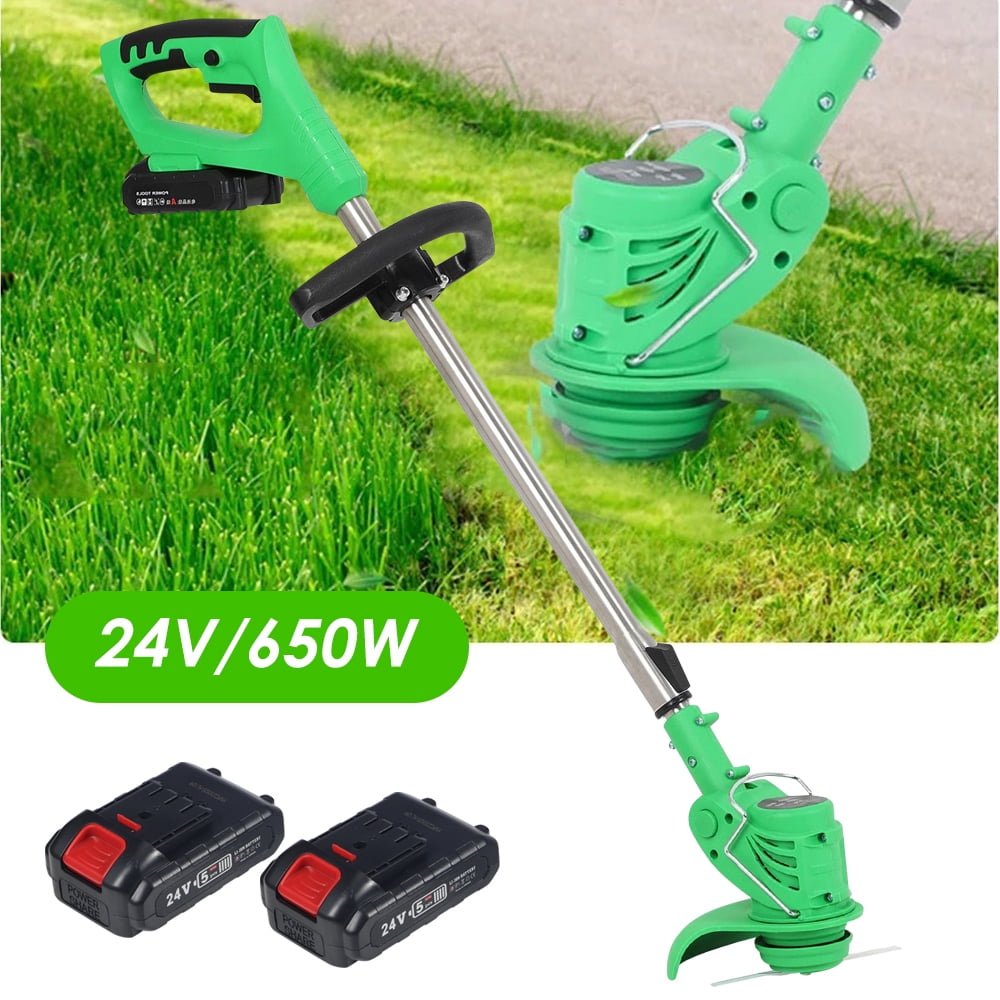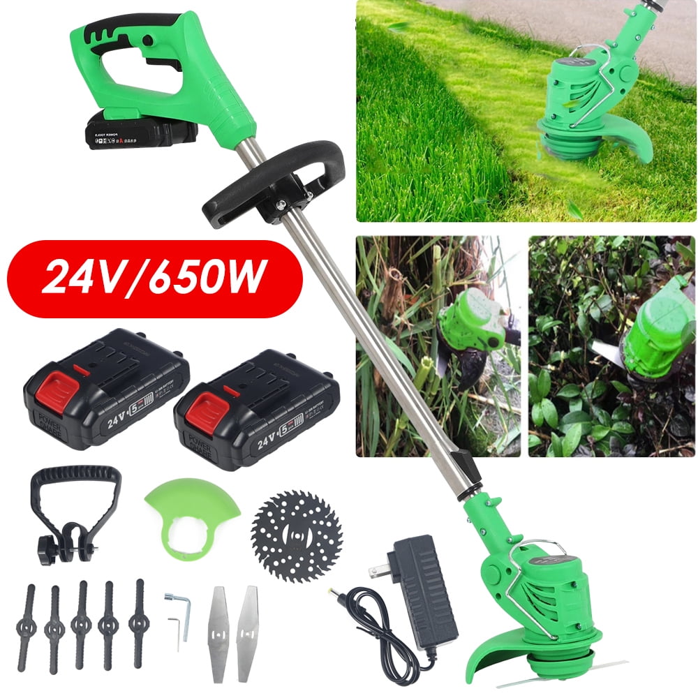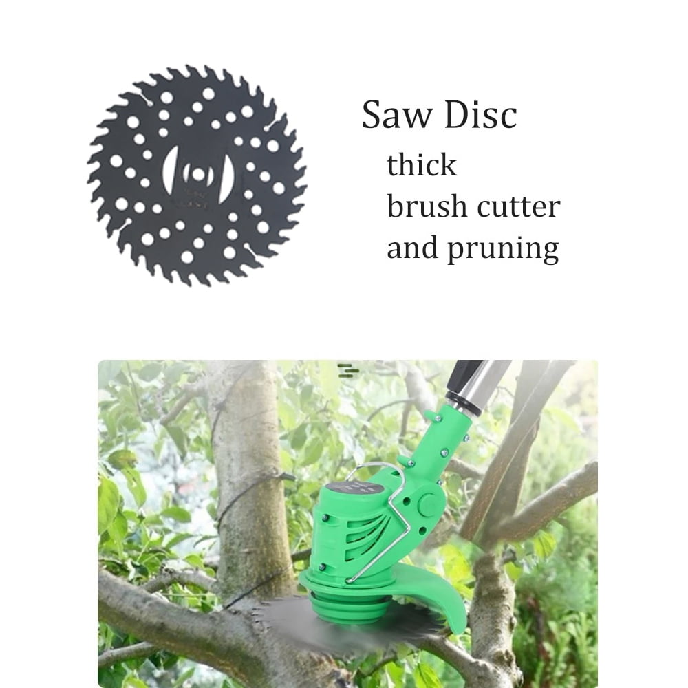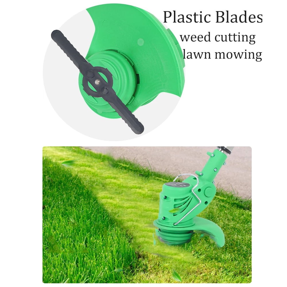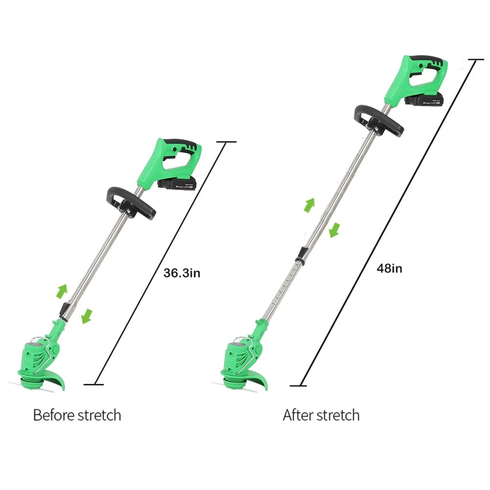 Description: ???? 【ASSISTANTHANDLE】Ergonomic assistant handledesign,the handle can adjust thedirection at will, it is comfortableto hold, and it is not tired to workfor a long time. ???? 【GRASS GUARDBOARD】With grass guard board,it canprevent weeds from splashingduring weeding ???? 【WATERPROOF LOWNOISE HANDPIECE】650W high power waterproof andlow noise head,easy to clean. ???? 【DOUBLE CONTROL SWITCH】Two switches must to be started by pressing the bottomat the same time, which is saferto prevent accidental touch. ???? 【SAFE & COMFORTABLE DESIGN】light weight, easy to carry, making work easier and labor-saving.Telescopic rod design, one-button control rod can easily change the length from 36.3in to 48in to adapt to the user’s height and posture. ???? 【More Types of Blades】There are 3 types of this weedeater with heavy duty metal blades, 2 large metal circular saw blades and 5 plastic blades, it is used for trimming without damaging the grass and providing neat grass or the lawn. Professional lawn mower can solve all kinds of weeding problems, and can be used in villas, yards, communities, lawn parks, parks and other areas. It is the best choice for garden pruning. The metal version of the metal blades is nice. Cuts through grass, weeds, milk thistles, cuts through vines, dense growth like a hot knife through butter, small branches. Specifications: ???? Material: Aluminum + Plastic ???? Color: Green ???? Battery: 24v ???? Power: 650W,2000mAh*2 ???? Cutting diameter: 140mm ???? Speed: 2100 RPM ???? Contraction length: 920mm/36.3in ???? Stretch length: 1220mm/48in Packaging includes: ???? 1 x lawn trimmer ???? 2 lithium-ion batteries ???? 1 charger ???? 5 plastic blades ???? 1 metal blade ???? 1 metal disc blade (as shown in illustration)