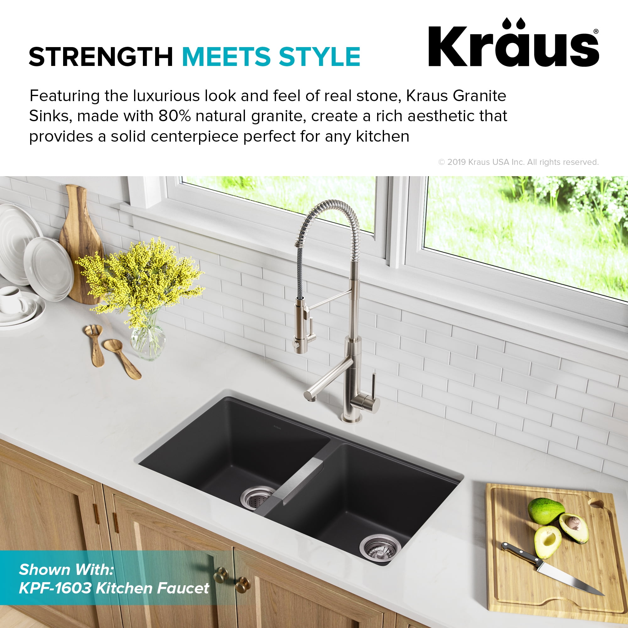 Kraus undermount granite sinks create an instant style upgrade for the kitchen. Constructed from 80% natural granite, with the look and feel of real stone, these modern kitchen sinks look striking in a variety of settings. Clean lines and thoughtful design details highlight the organic elegance of granite, for an eye-catching look with contemporary appeal. The extra-deep basins accommodate large dishes with ease, while the gently rounded corners make sink maintenance simple. Each non-porous sink is protected with a thermal finishing process, creating a surface that is highly resistant to heat, chemicals, scratching, chipping, and discoloration. This double bowl sink provides a lifetime of functionality with refined style. The 50/50 split basin adds flexibility for a variety of kitchen tasks. For added convenience, a basket strainer drain assembly and complimentary towel are included free with purchase. Constructed from premium stainless steel, the top-quality basket strainer assembly creates a tight seal to prevent food and debris from clogging the drainpipe. For easy installation, all mounting hardware is provided. Experience Kraus Quality and bring your best kitchen ideas to life.