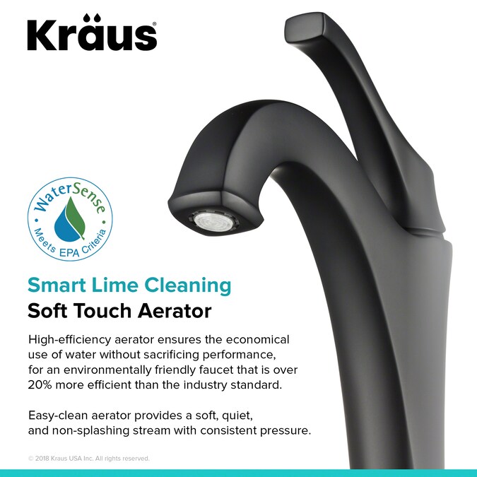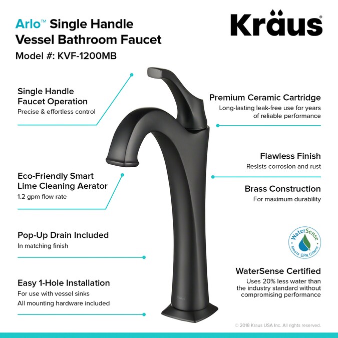 Add elegant style to any bathroom with the KRAUS Arlo™ vessel faucet (KVF-1200MB). A stunning combination of clean, refined lines and an arched spout give the classically-inspired design a timeless appearance. The gracefully curved single lever handle complements the shape of the spout, and allows you to easily adjust water temperature and volume. Featuring an eco-friendly aerator for maximum water savings, this faucet delivers up to 1.2 gallons per minute with a splash-free aerated stream. For a personalized look, Arlo™ comes in a choice of Spot-Free all-Brite™ Brushed Nickel, Chrome, Oil Rubbed Bronze, and Matte Black finish. A KRAUS pop-up drain in matching finish is included for convenient installation and a seamless look.