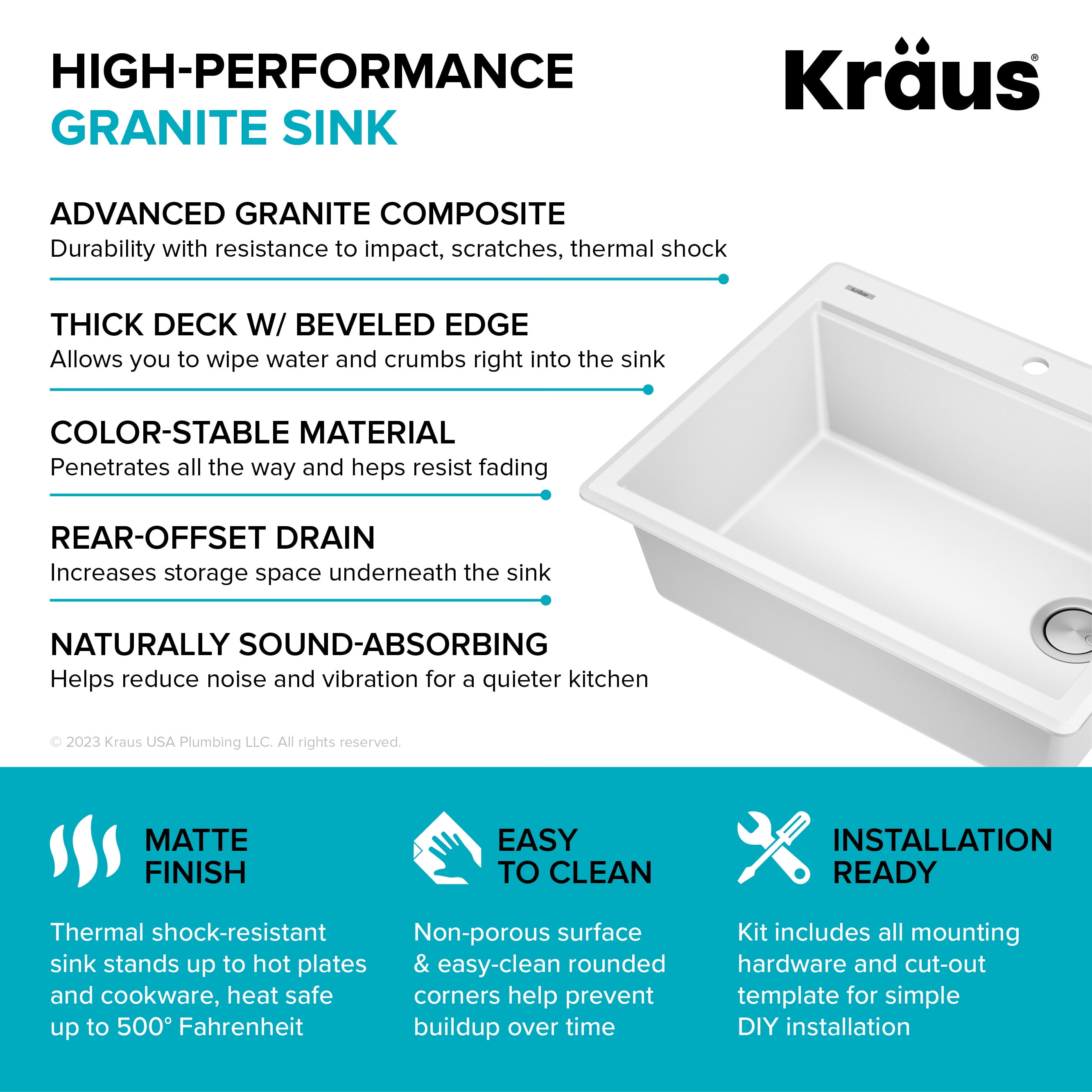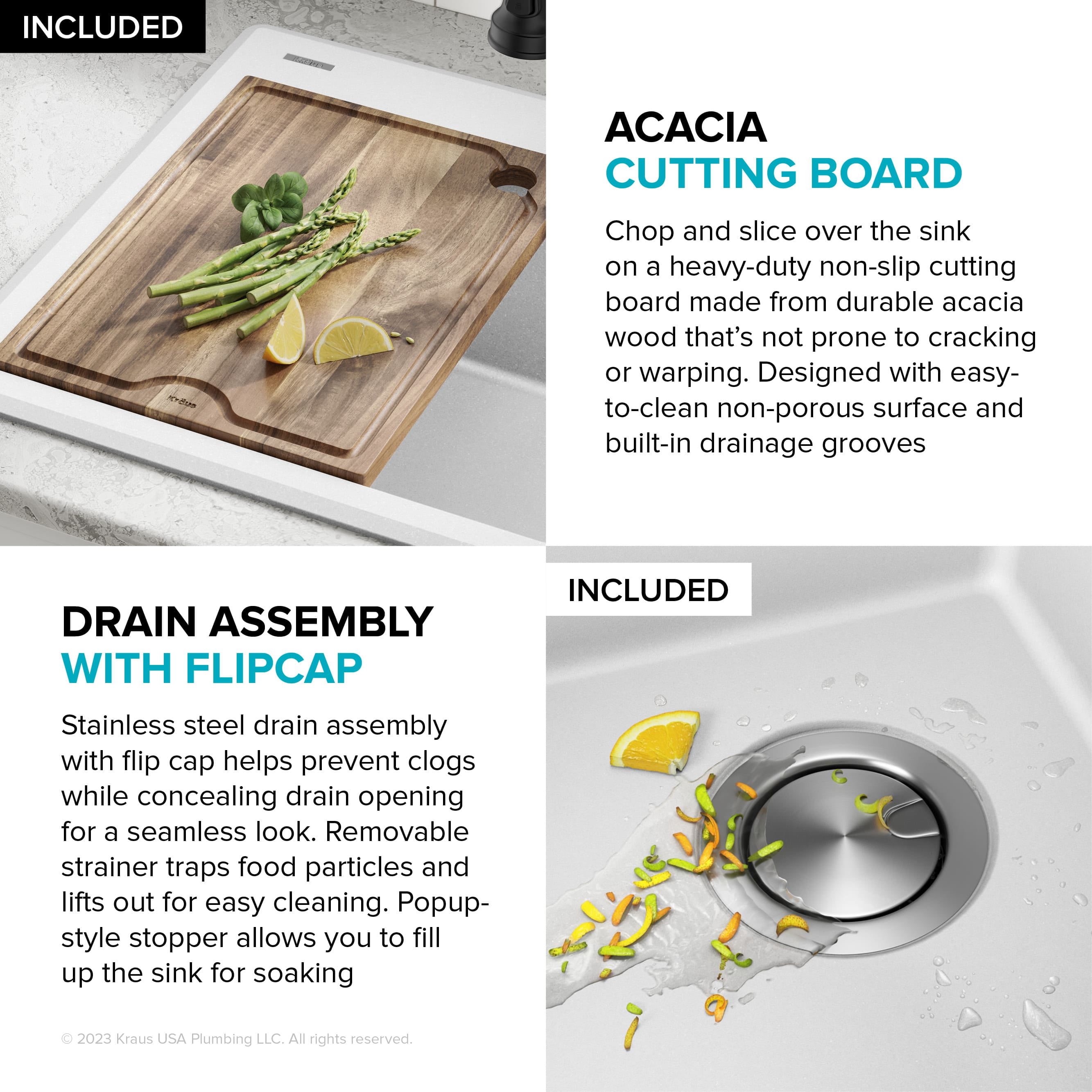 Outer sink dimensions: 28” L x 22” W x 9 5/8” D Bowl dimensions: 25” L x 16” W x 9” D Minimum cabinet size: 30” Sink kit includes: Granite composite drop-in workstation sink, heavy-duty acacia hardwood cutting board, stainless steel drain assembly with strainer Drop-in / top mount sink: Ideal for retrofitting, you can install this sink as a drop-in with any type of kitchen countertop. Thick deck sits flat against the countertop for a beautifully finished look The extra-thick mounting deck is designed with a low-angle beveled edge for easy cleaning. 1 pre-drilled hole and 4 pre-scored knockout holes in the mounting deck allow for easy installation of faucet and accessories A spacious single bowl with an uninterrupted surface provides a generous workspace for large cookware and stacks of dishes. Rear-offset drain increases storage space underneath the sink Easy-to-clean surface: Helps prevent food and liquid from sticking to the sink surface. Easily wipes clean with soap and water Engineered for easy draining: Gently sloped bottom helps prevent water from pooling in the sink. The optimized slope helps keep your fragile stemware from tipping over Heavy-duty cutting board made with durable ACACIA hardwood creates a stylish accent for your sink. Not prone to cracking or warping, with a non-slip design and built-in grooves that prevent spills. Premium drain assembly: Stainless steel drain assembly with flip cap cover helps prevent clogging while concealing the drain opening for a seamless look. The removable strainer traps food particles and lifts out for easy cleaning Color-stable material: Matte sink is available in metallic black, metallic brown, metallic grey, and white. Heat safe up to 500 °F Naturally sound-absorbing material helps reduce noise and vibration from dishes and garbage disposals for a quieter kitchen experience Recommended accessories (sold separately): Roll-Up Dish Drying Rack (KRM-11) made with heavy-duty stainless steel and non-slip silicone is perfect for drying dishes right over the sink. Holds up to 85 lbs., is dishwasher-safe, heat-safe, and rolls up for easy storage