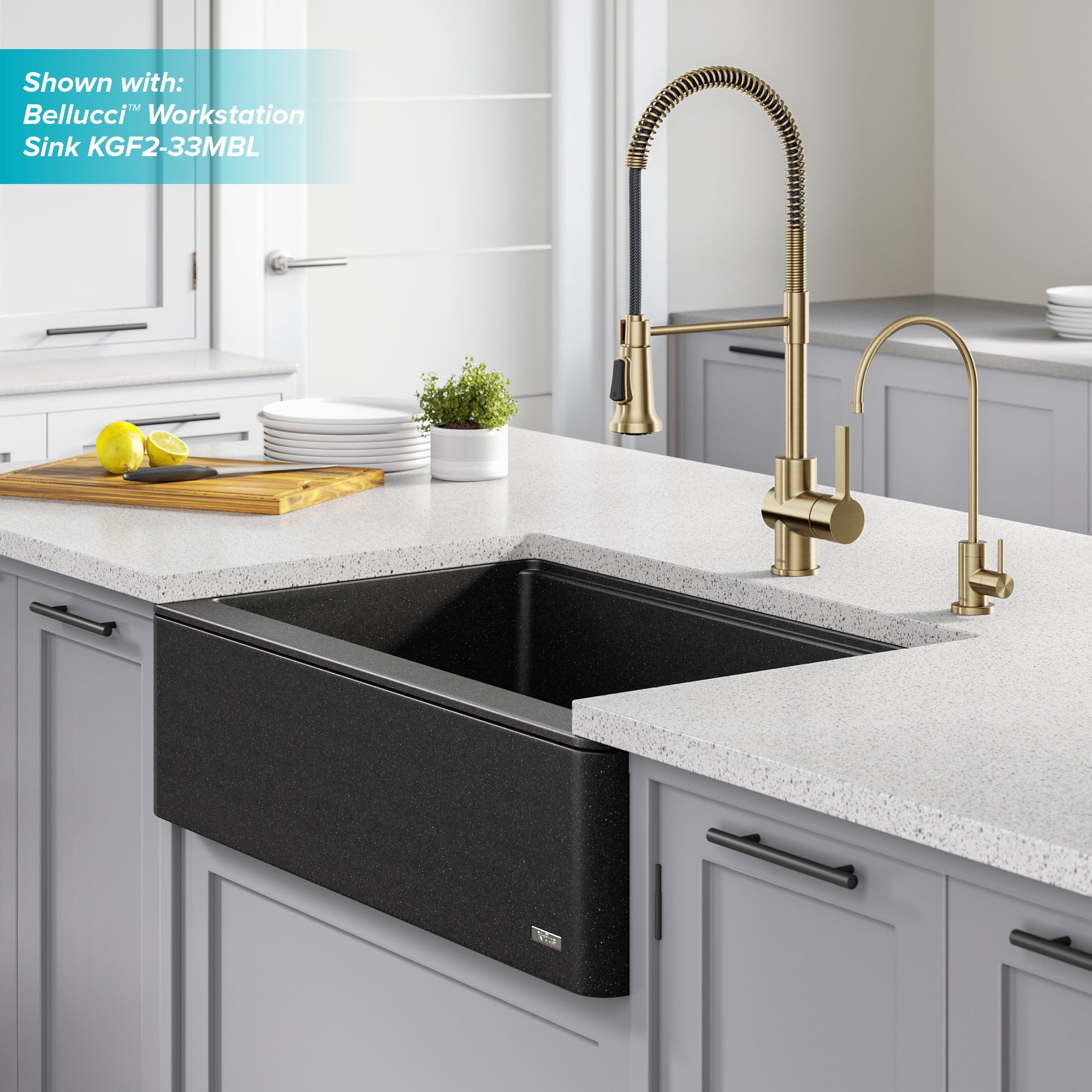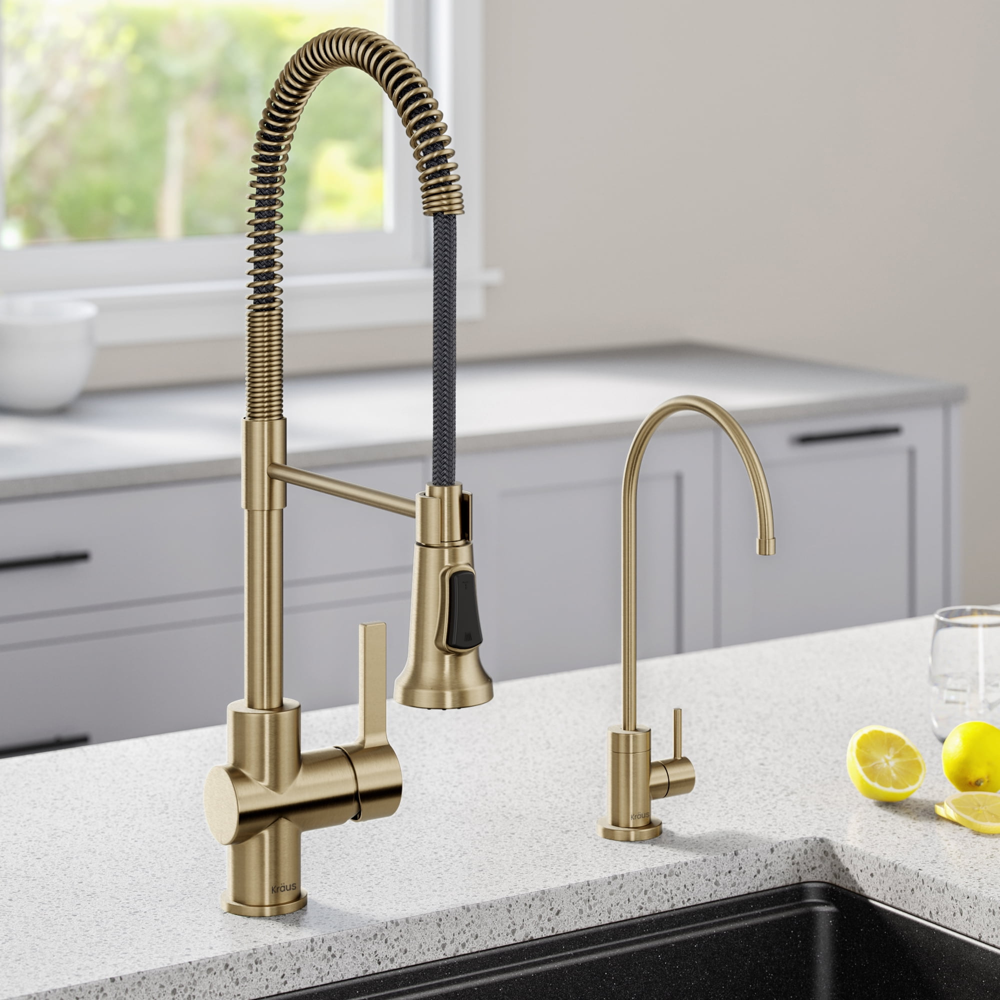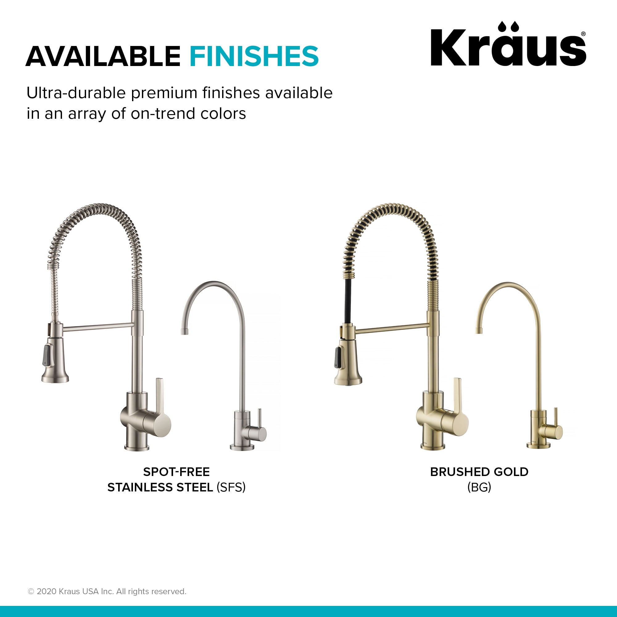 PERFECT MATCH: Create striking modern style and redefine the functionality of your kitchen with a commercial style faucet and coordinating water filter faucet HIGH-ARC OPEN COIL SPOUT creates a distinctive professional look and provides ample room for cleaning large cookware 3-FUNCTION SPRAYHEAD switches from aerated stream for everyday cleaning to powerful spray for heavy-duty rinsing, and allows you to pause the flow of water when needed LEAD-FREE FILTER FAUCET delivers filtered water on demand and saves money on bottled water. Non-air gap faucet design works with most Reverse Osmosis and under-counter filtration systems (not included) FLAWLESS RUST-RESISTANT FINISH will not dull or fade over time. Also available in Spot Free all-Brite™ Stainless Steel that prevent water spots and fingerprints COMMERCIAL FAUCET HEIGHT: 20 5/8 in. – Eco-Friendly Flow Rate 1.8 gpm – High Arc Spout swivels 360° for a broad range of motion FILTER FAUCET HEIGHT: 12 in.; Flow Rate 1.0 gpm; Gooseneck Spout swivels 360° SINGLE-HOLE INSTALLATION: Commercial faucet comes installation-ready with pre-attached water lines COMPATIBLE WITH: Kraus® Purita™ 2-Stage Carbon Block Under-Sink Water Filtration System improves water quality by removing contaminants as small as 0.5 microns so that you can enjoy safe, clean, great-tasting water on demand (sold separately) HEAVY-DUTY CONSTRUCTION: 100% lead-free brass water lines and metal body ensure reliable long-lasting performance that will add value to any home Certifications: cUPC (ASME A112.18.1/CSA B125.1), NSF/ANSI Standard 61 and 372 certified by IAPMO, MASS, CEC, DOE, ADA compliant LIFETIME LIMITED WARRANTY: Satisfaction guaranteed with top-rated customer service that puts you first NOTE: Due to their reflective nature, the appearance of gold finishes can vary depending on lighting. Warm or cool light, as well as surrounding colors, can affect the look. Actual appearance when installed may differ slightly from the images shown UNIVERSAL DESIGN: Non-air gap filter faucet works with most under-counter Reverse Osmosis and simple filtration systems (not included)