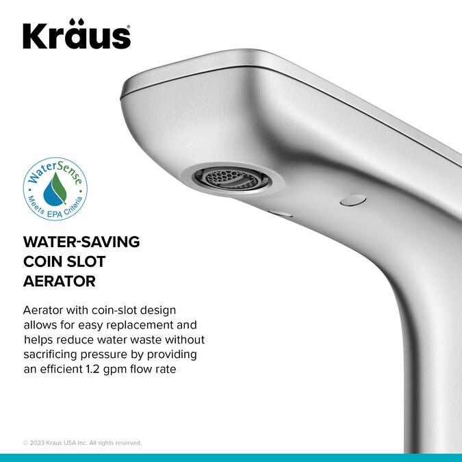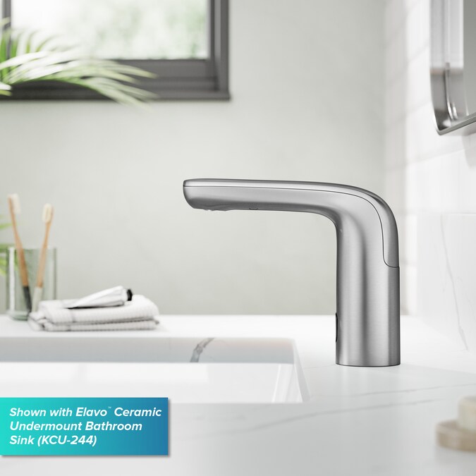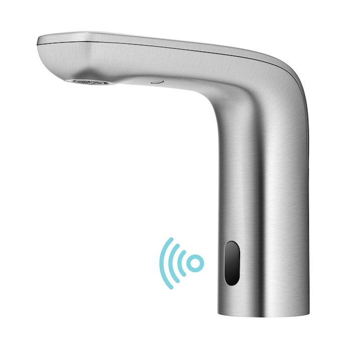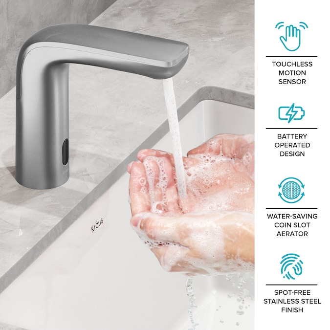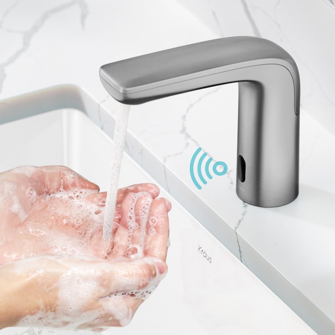 - Touchless faucet with motion-sensor technology allows you to turn water on and off with the wave of a hand