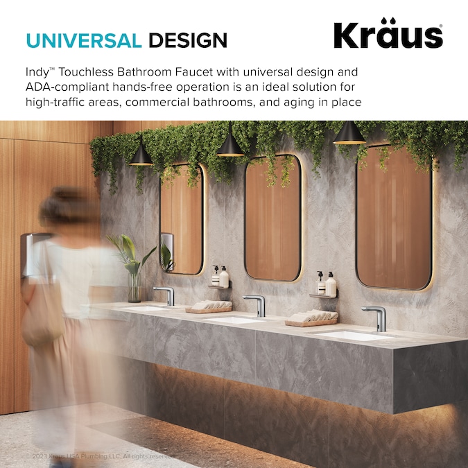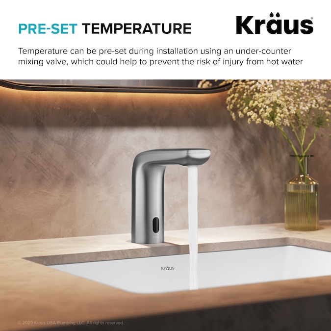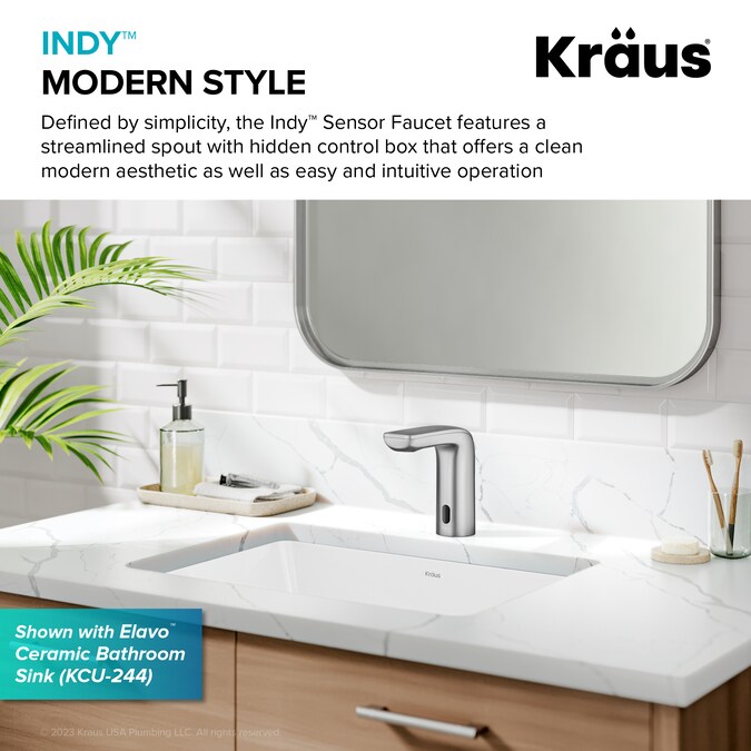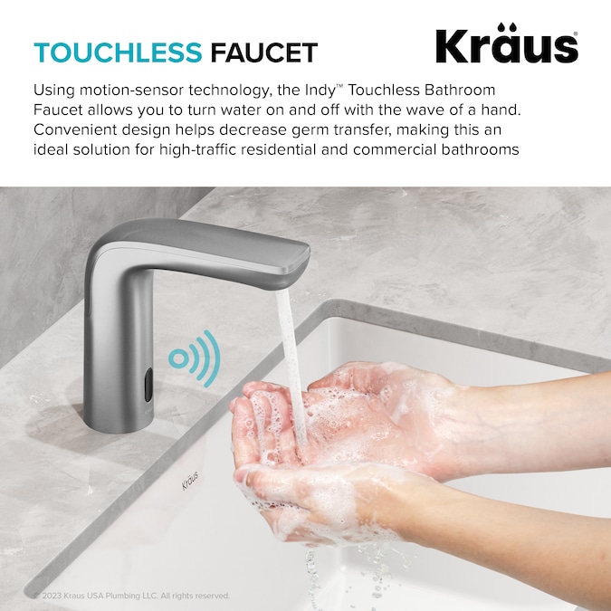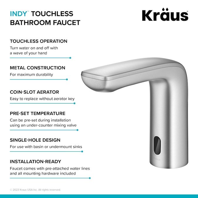 The Indy Touchless Sensor Faucet allows you to turn water on and off with the wave of your hand without touching the faucet spout, helping decrease germ transfer and making this an ideal solution for high-traffic residential and commercial bathrooms. The streamlined design creates a modern look in any bathroom, with heavy-duty construction that helps ensure long-lasting use. Water turns off automatically after 1 minute or when hands are no longer detected, reducing water waste and helping save energy. Temperature can be pre-set during installation to help eliminate the risk of injury from hot water. Comes with control box, batteries, pre-attached water lines, and mounting hardware. Spot-Free Stainless Steel Finish helps prevent water spots and fingerprints for easy maintenance.