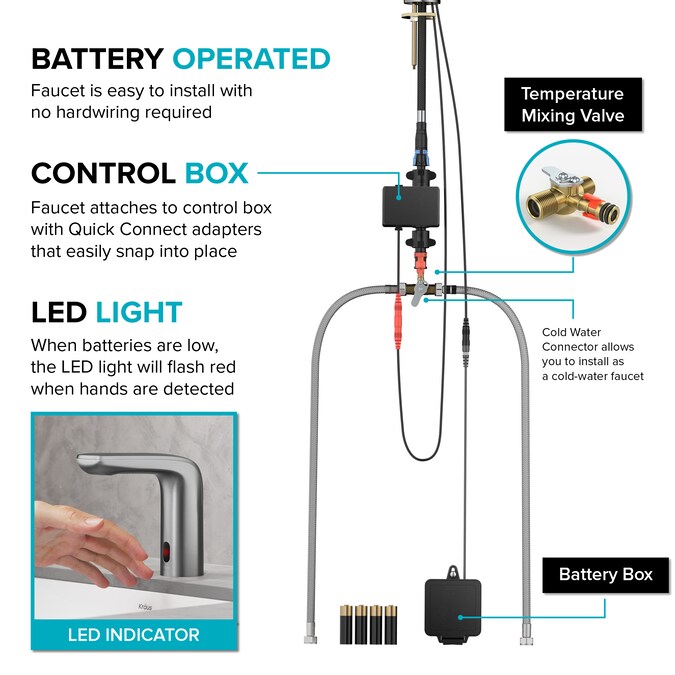 - Battery operated design is easy to install with no hardwiring required; sensor function works even during power outages; when batteries are low the sensor LED light will flash when hands are detected; control box with Quick Connect adapters included