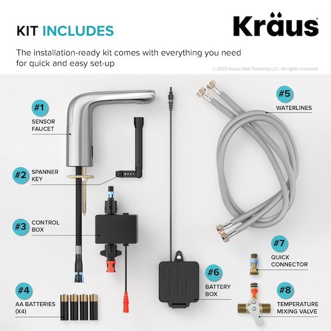 - Installation ready with durable pre-attached water lines, brass mixing valve, control box, 4x AA batteries, and all mounting hardware included for easy installation; single hole installation for compatibility with most lavatory sinks and vanity tops