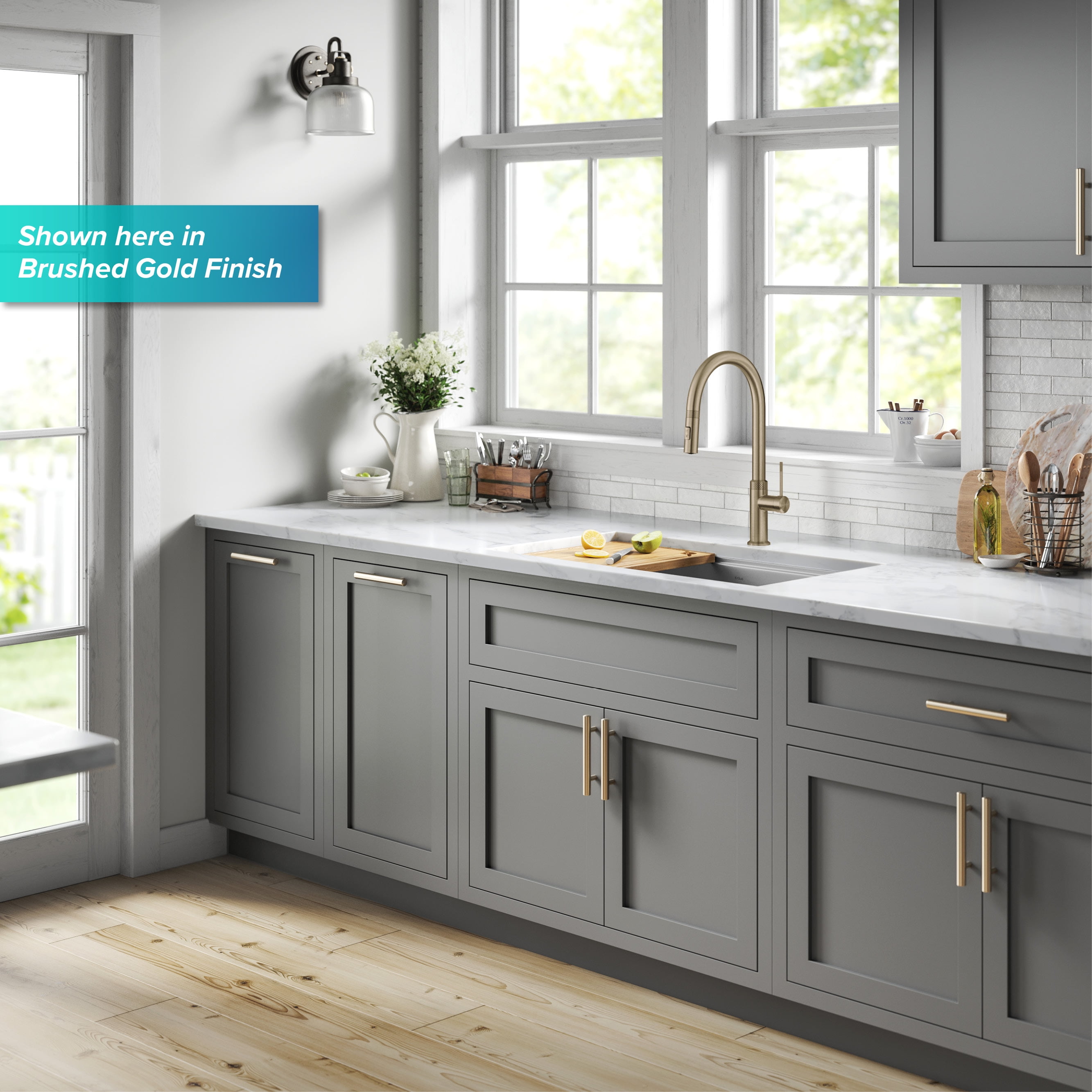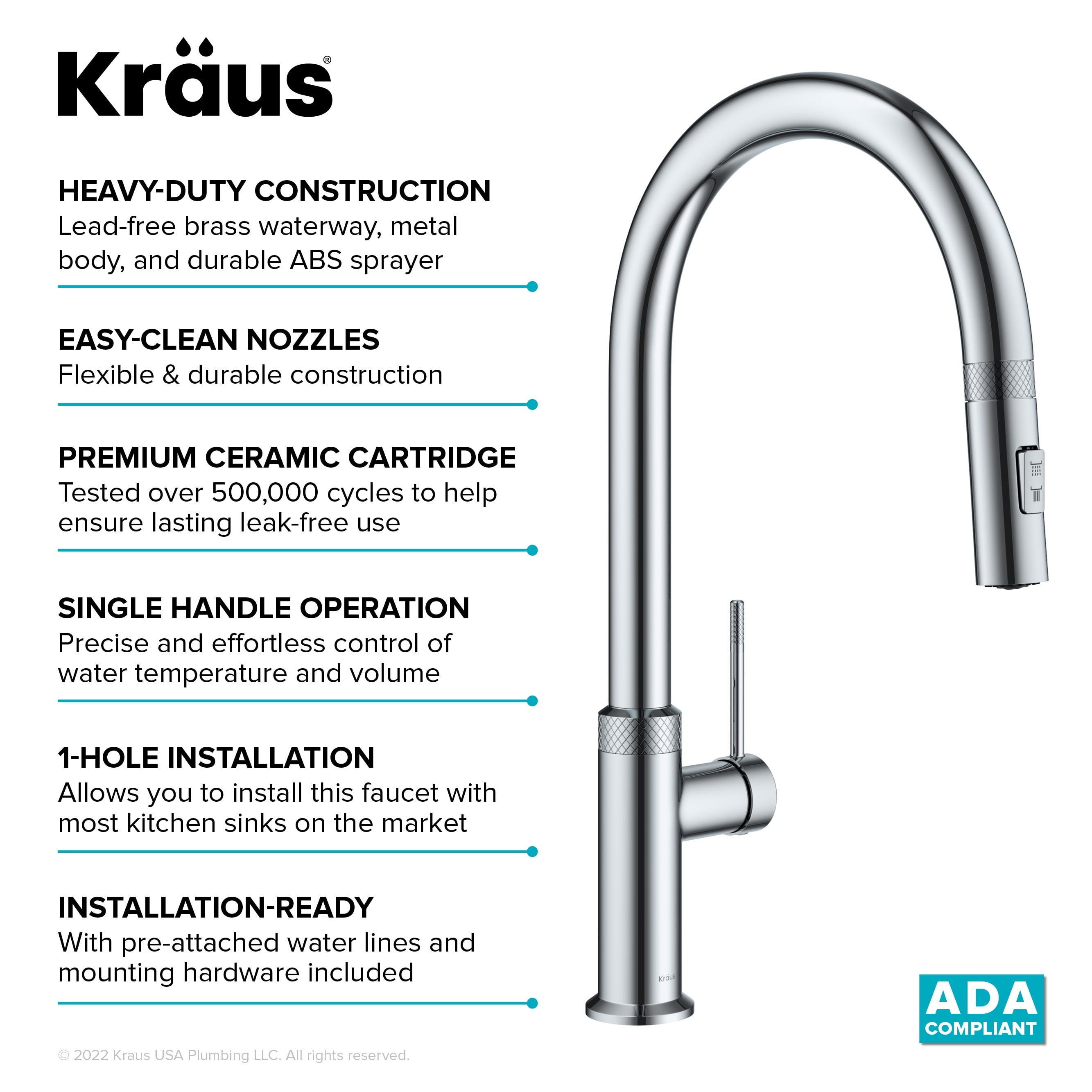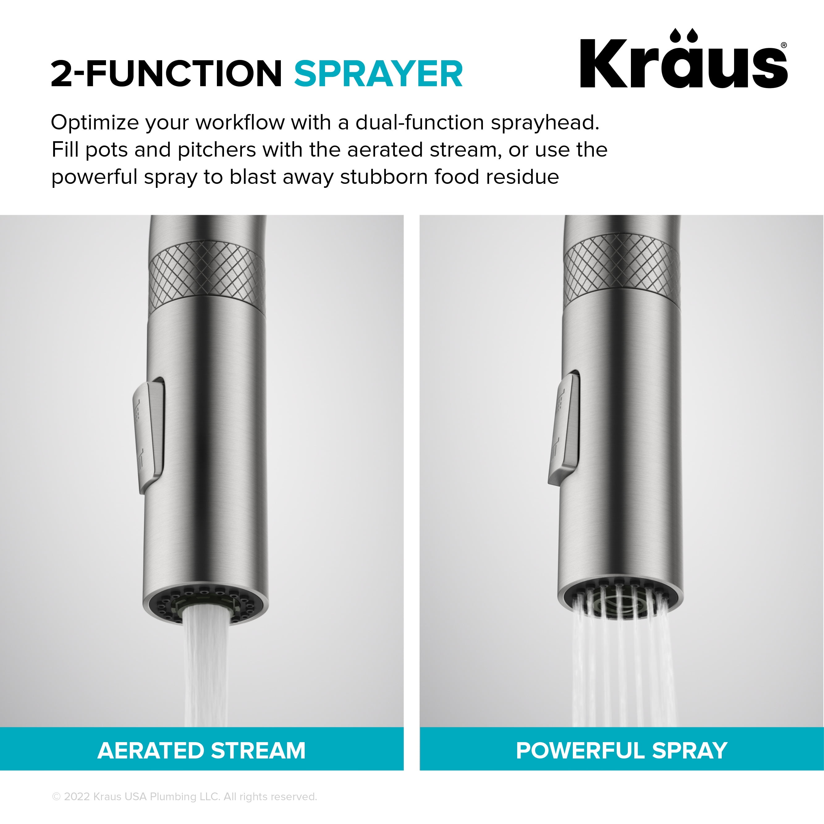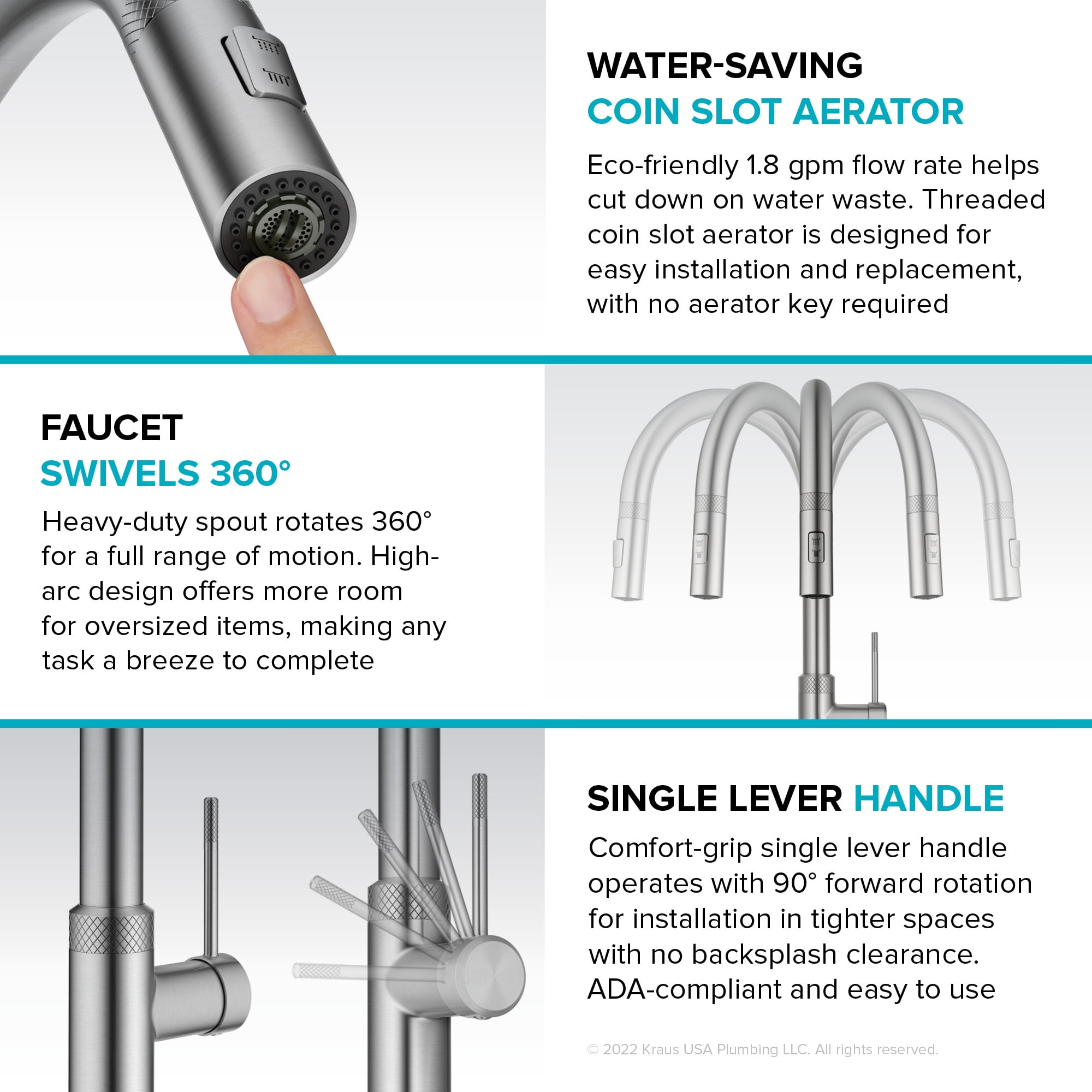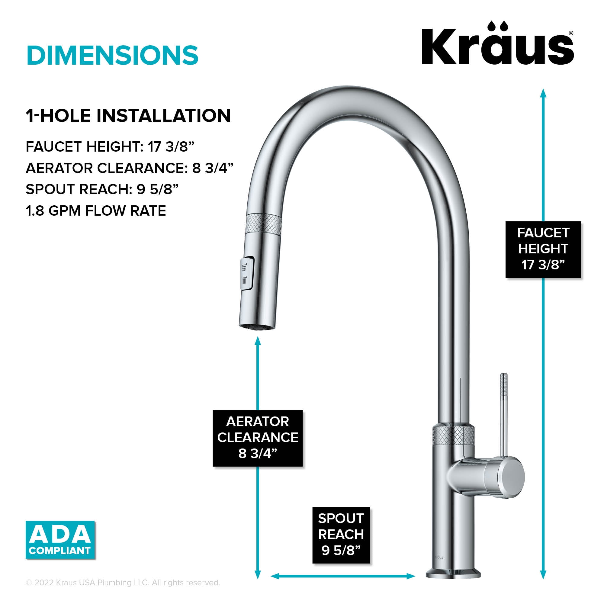 Refined Style: The Allyn™ Faucet combines a streamlined contemporary silhouette with beautifully textured diamond-knurled details to strike the perfect visual balance Dimensions: Faucet Height: 17 3/8″; Spout Height: 8 3/4″; Spout Reach 9 3/8″; Spout Swivel 360°; Flow Rate 1.8 GPM Heavy-duty construction with a metal body and durable braided nylon water supply lines helps ensure reliable performance for long-lasting use Optimized Height: Faucet with 17 3/8-inch height fits underneath most standard kitchen cabinets for maximum installation flexibility Dual Function Sprayer: Switch between an aerated stream for everyday cleaning and a powerful spray for heavy-duty rinsing High-arc spout offers ample room underneath the faucet for oversized items like tall pitchers, swivels 360° for a full range of motion Easy-Clean Nozzles: Soft rubber sprayer holes allow you to wipe away mineral build-up to help ensure long-lasting performance The slim single lever handle operates with 90° forward rotation, allowing for installation in tighter spaces with no backsplash clearance. ADA-compliant and easy to use Premium ceramic cartridge tested over 500,000 cycles to help ensure lasting leak-free use Installation-ready kit includes durable pre-attached water lines, quick connect sprayer hose, Snap-On counterweight, and mounting hardware for easy DIY installation Water-Saving Aerator helps reduce water waste without sacrificing pressure by providing an efficient 1.8 GPM flow rate. Coin slot design is engineered for easy replacement with no aerator key needed Single hole installation allows you to install this faucet with most kitchen sinks on the market Lifetime limited warranty and top-rated Customer Service team so you can choose KRAUS® products with confidence Certifications: cUPC (ASME A112.18.1/CSA B125.1) NSF/ANSI Standard 61 and 372 certified by IAPMO AB1953, MASS, DOE, CEC, ADA