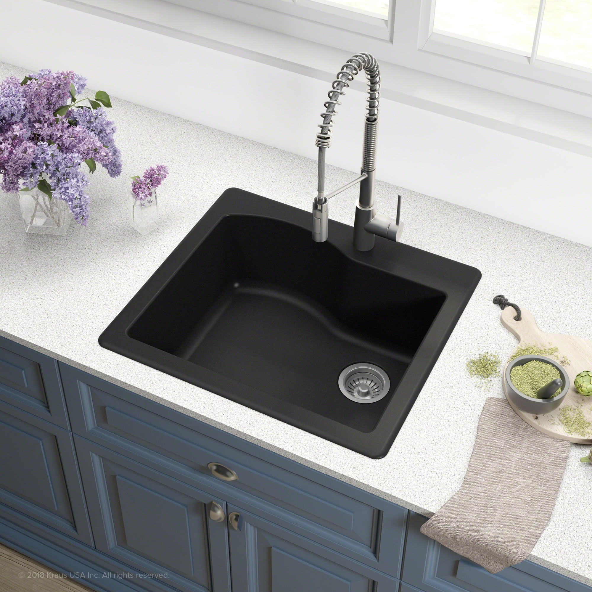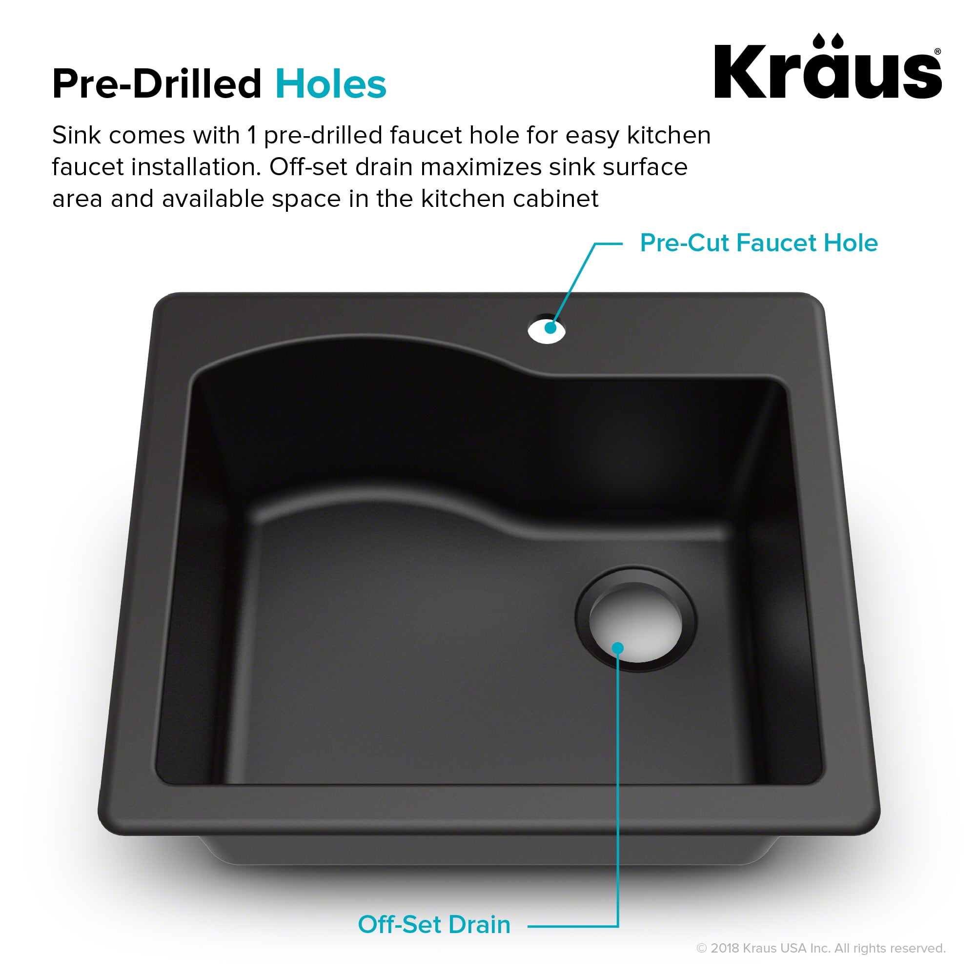 Outer sink dimensions: 25” l x 22” w x 9 7/8” d. Min cabinet size: 27” undermount / 27” top mount Non-Fading color: UV-stable material offers a rich hue that will not fade or discolor over time Deep single bowl sink: 9 1/8” high-capacity basin with gently rounded corners prevents splashing and accommodates your largest cookware Undermount / drop-In design: install as an undermount for a seamless transition from sink to countertop, or drop into an existing countertop opening Heat-Safe: can withstand high heat and extreme hot or cold temperature fluctuations Non-Porous surface: smooth to the touch and naturally hygienic surface is highly resistant to dirt and grime, and easily wipes clean Rear-Set drain is compatible with all garbage disposal adapters, increases workspace in the sink and storage space in the cabinet below Kit includes: quarza series sink, mounting hardware, matching colored strainer, cut-Out template, installation and care instructions ISTA certified packaging protects sink from damage due to impact in transit and during loading, eliminating delays for renovation projects Product certification: all Kraus products are marked CUPC, for assurance that the product meets all north American standards