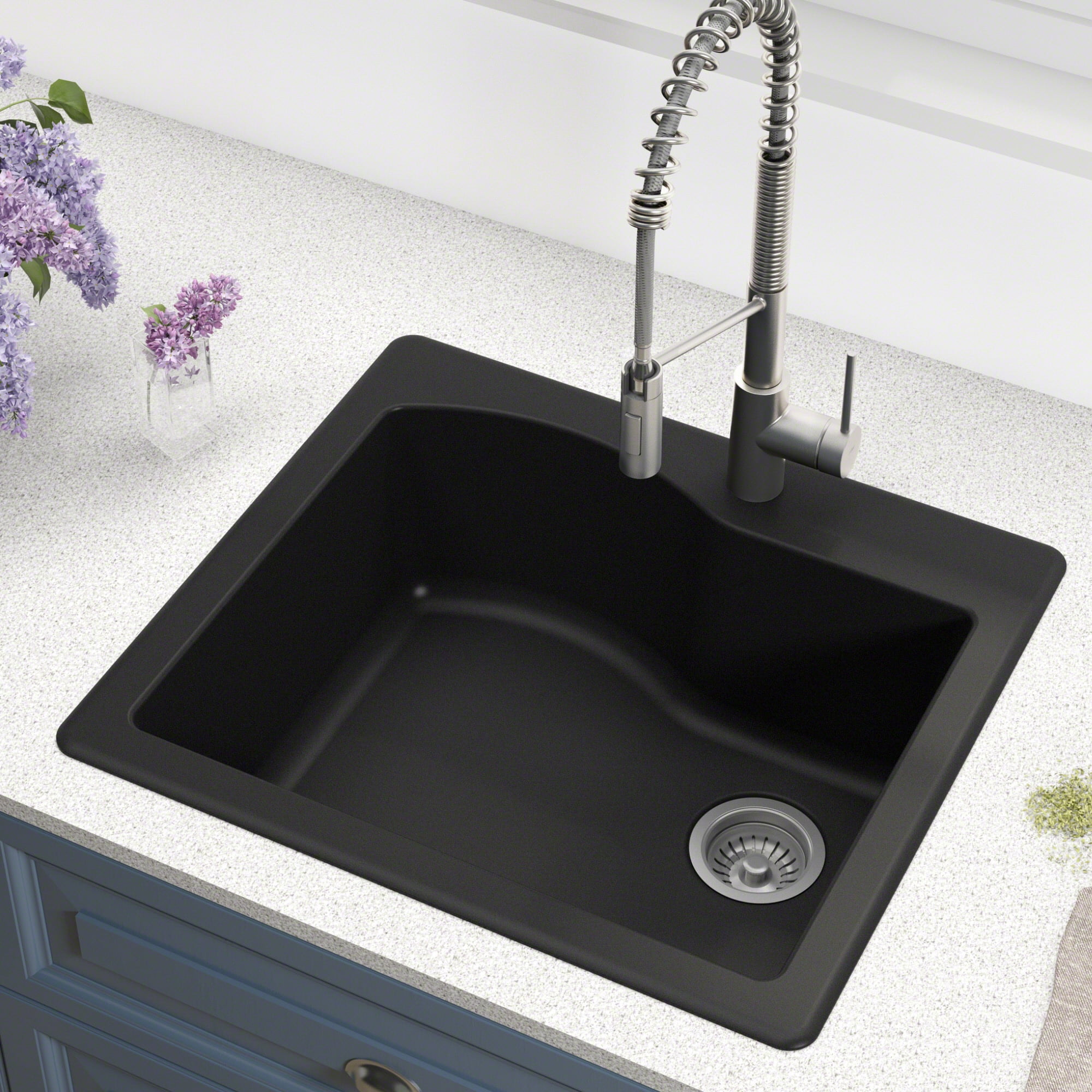KRAUS Quarza 25 inch Dual Mount Single Bowl Granite Kitchen Sink and Strainer in Black